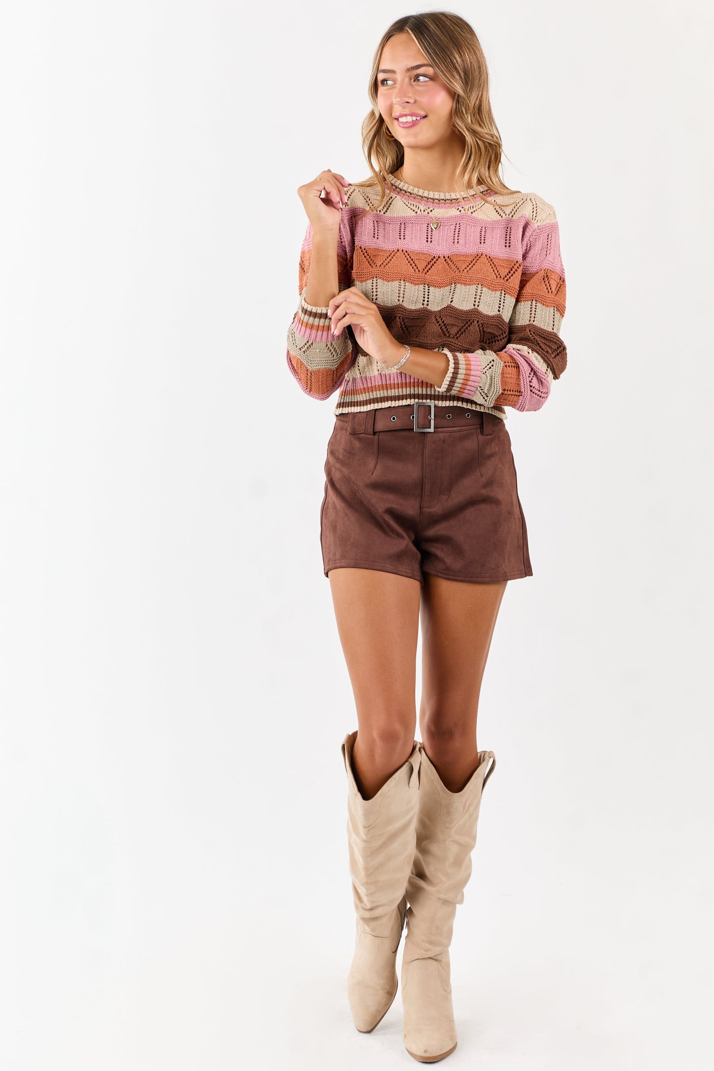Almond Wavy Striped Long Sleeve Pointelle Sweater