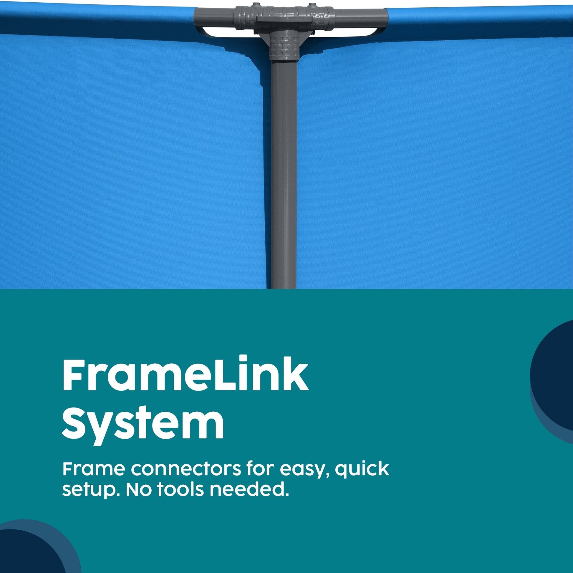 It doesn't get any better than having your own backyard pool! Enjoy a summer full of fun with the Bestway Steel Pro MAX Above Ground Swimming Pool. Featuring an ultra-durable construction, this outdoor swimming pool is made with a corrosion-proof steel frame equipped with a FrameLink System for a sturdy and secure connection. The frame is compatible with additional attachments, such as cup holders (sold separately). With a DuraPlus liner, this pool is reinforced for strength and prevents punctures. Including a filter pump, ladder, and pool cover, you'll have everything you need for the perfect pool day. Equipped with a simple setup and take-down process, you can easily store this pool away in the off-season. No tools are required, and a hose connects to the built-in flow control valve to quickly and efficiently drain out the pool water. Spend your hot summer days in the water with the Steel Pro MAX Above-Ground Swimming Pool from Bestway. Disclaimer: Please review your HOA rules and restrictions before purchasing this product. Not all housing agencies permit private above-ground pools.