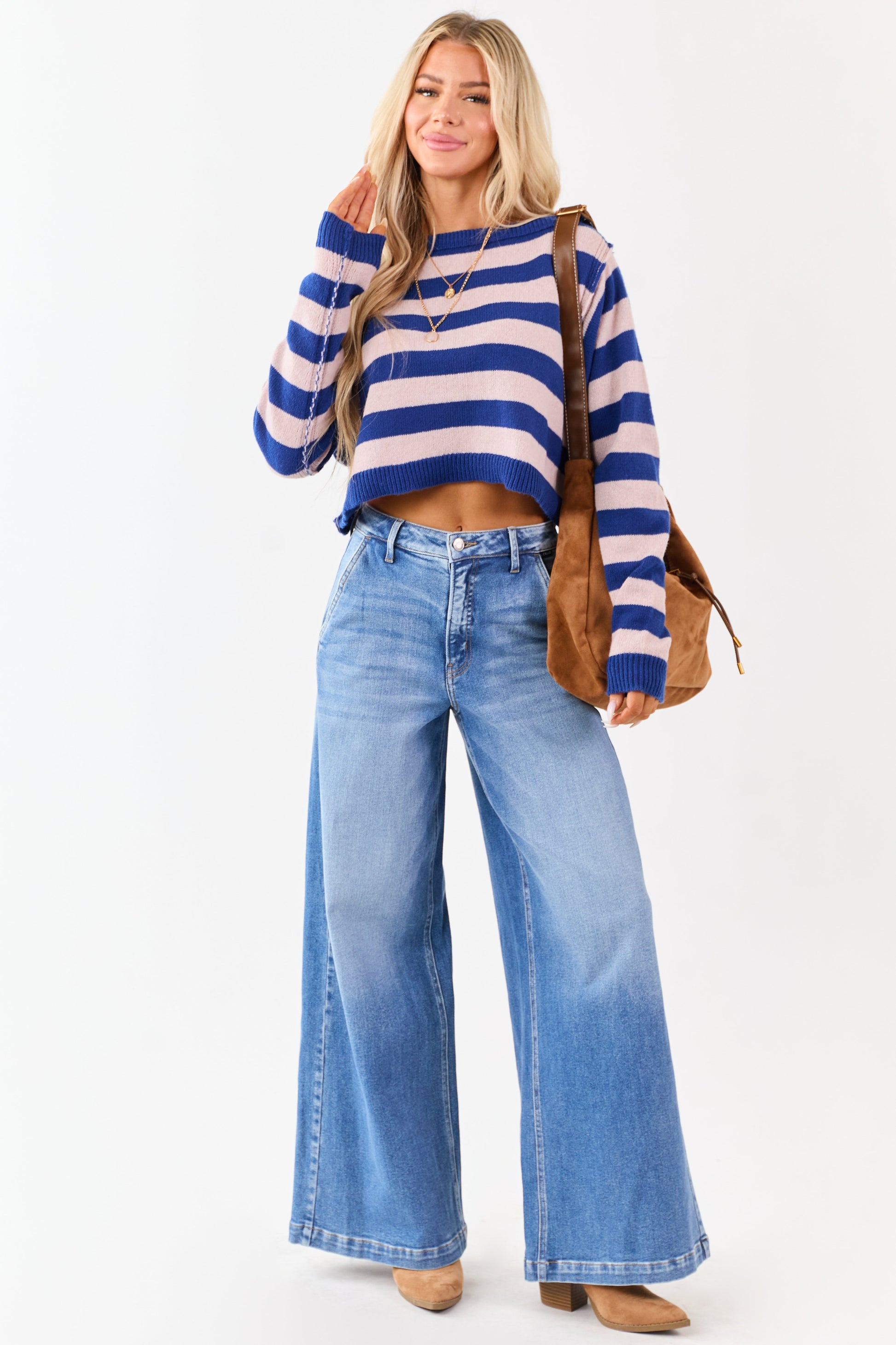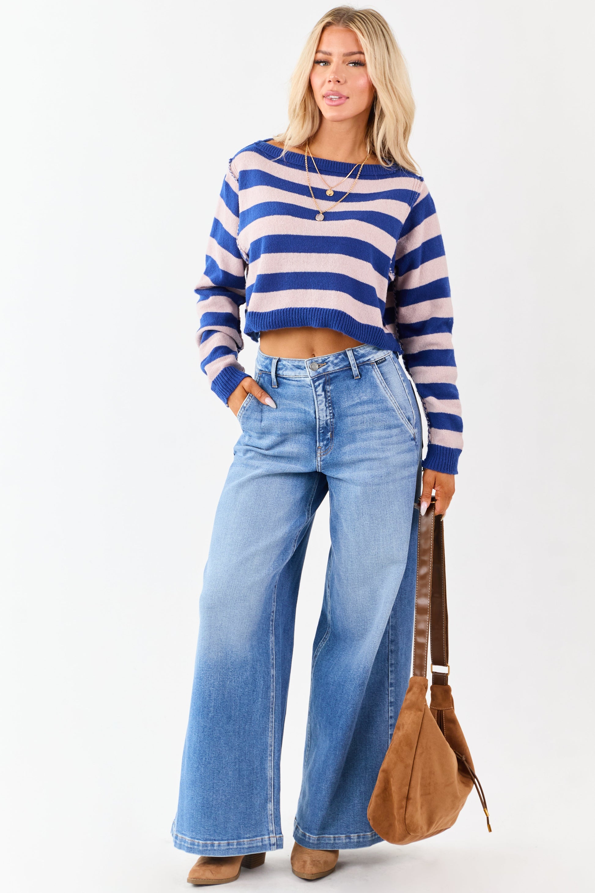 Cobalt and Mauve Striped Cropped Boxy Knit Sweater