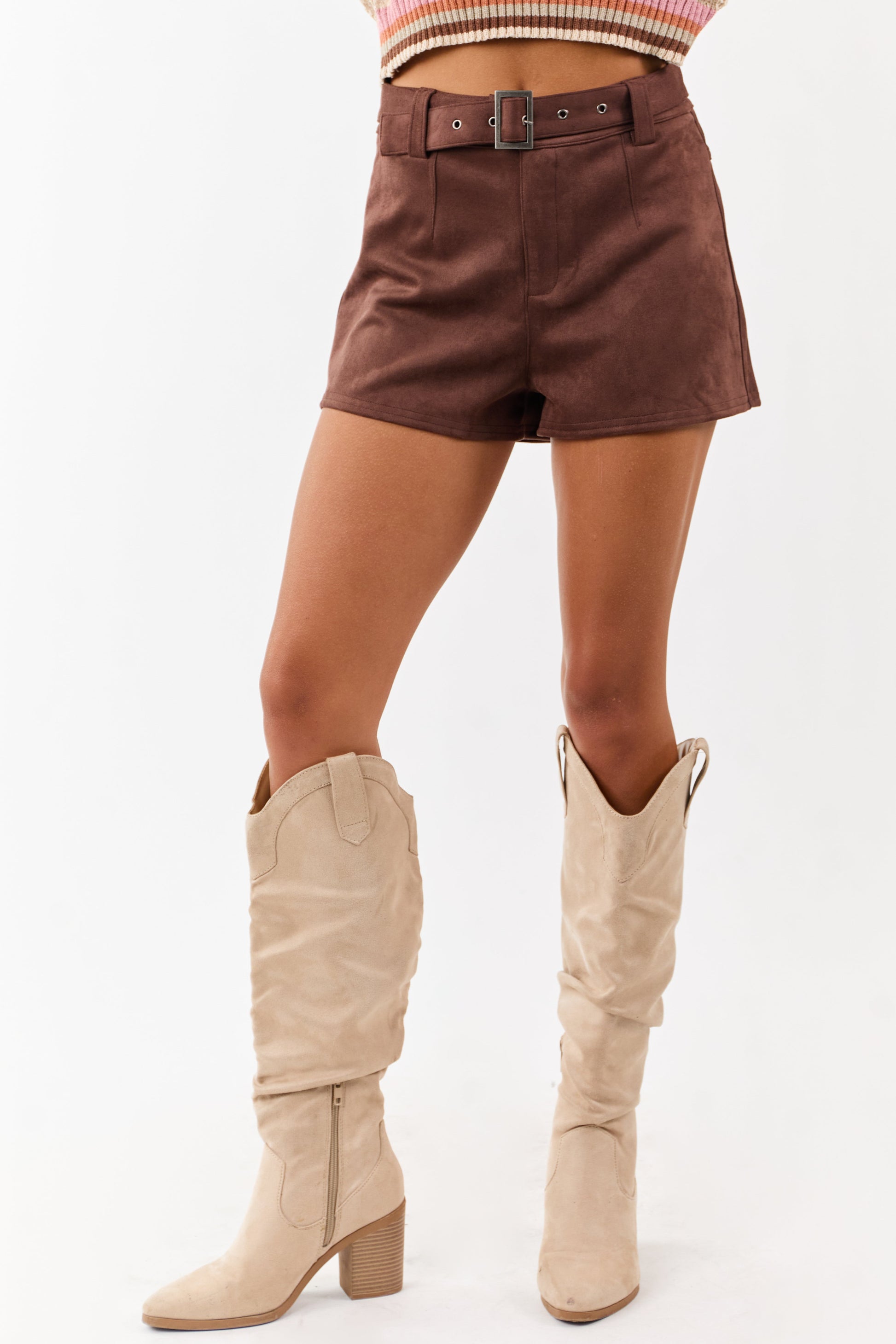 Cocoa Soft Faux Suede Belted Mini Shorts
