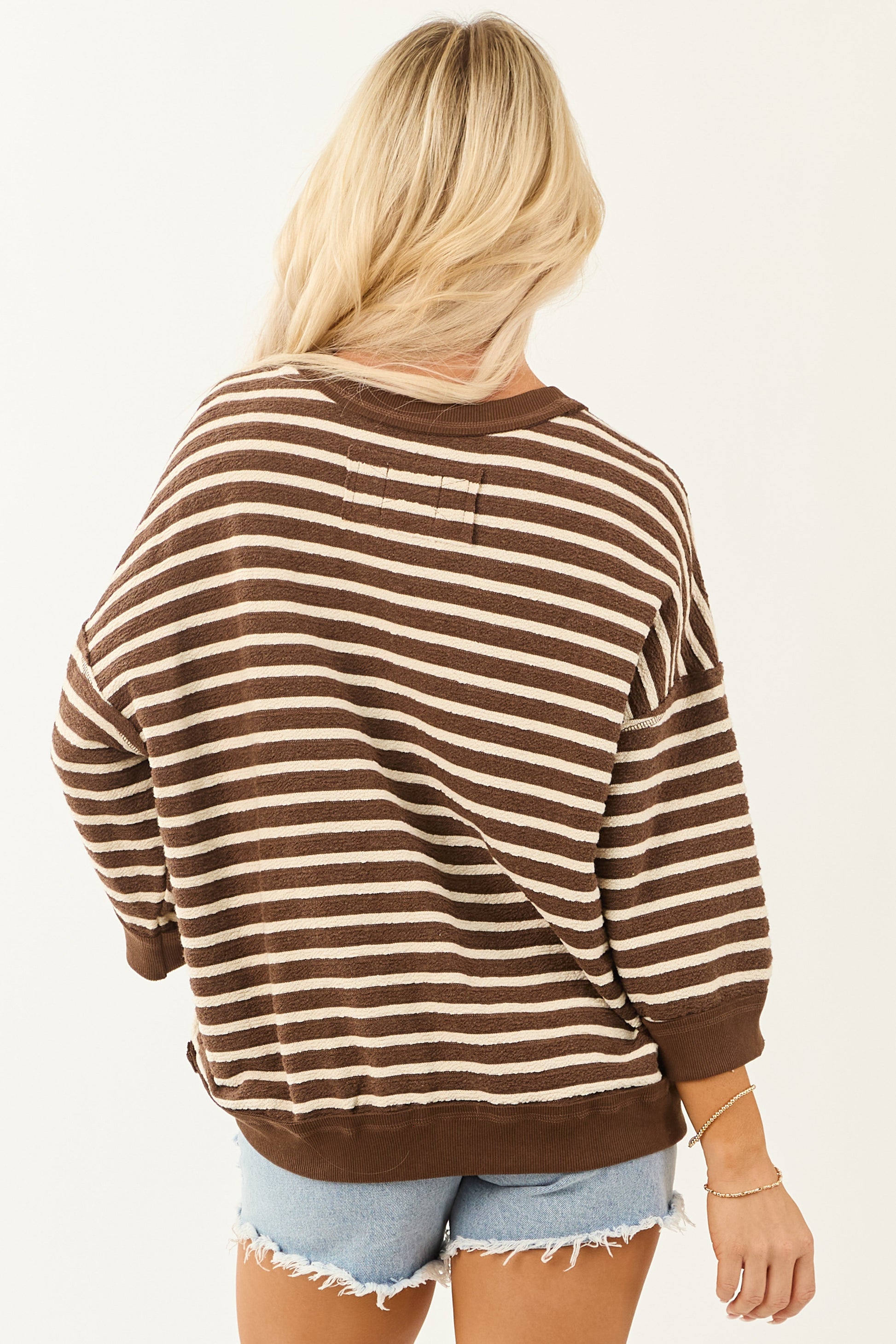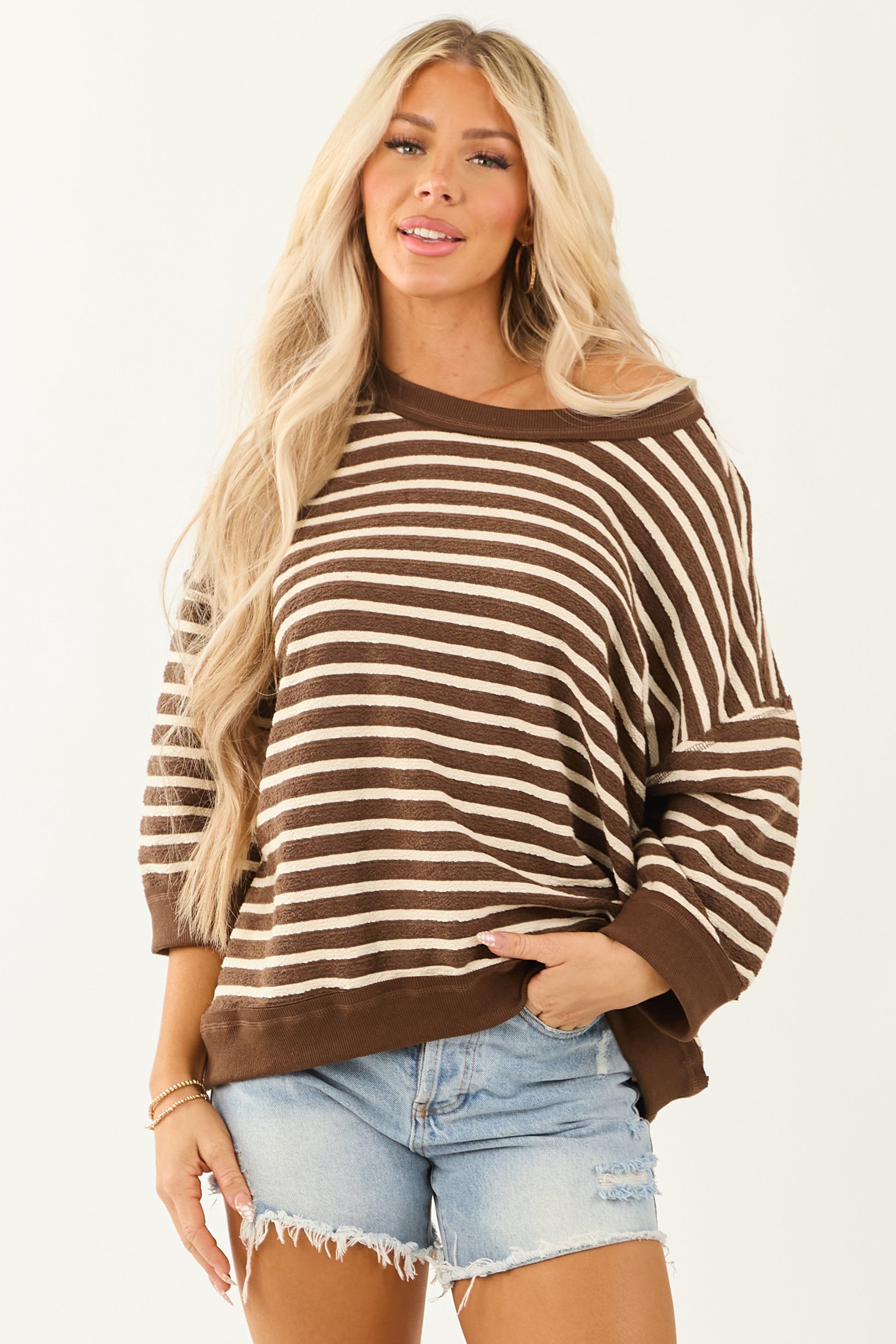Cocoa Striped 3/4 Sleeve Cotton Relaxed Sweater Top