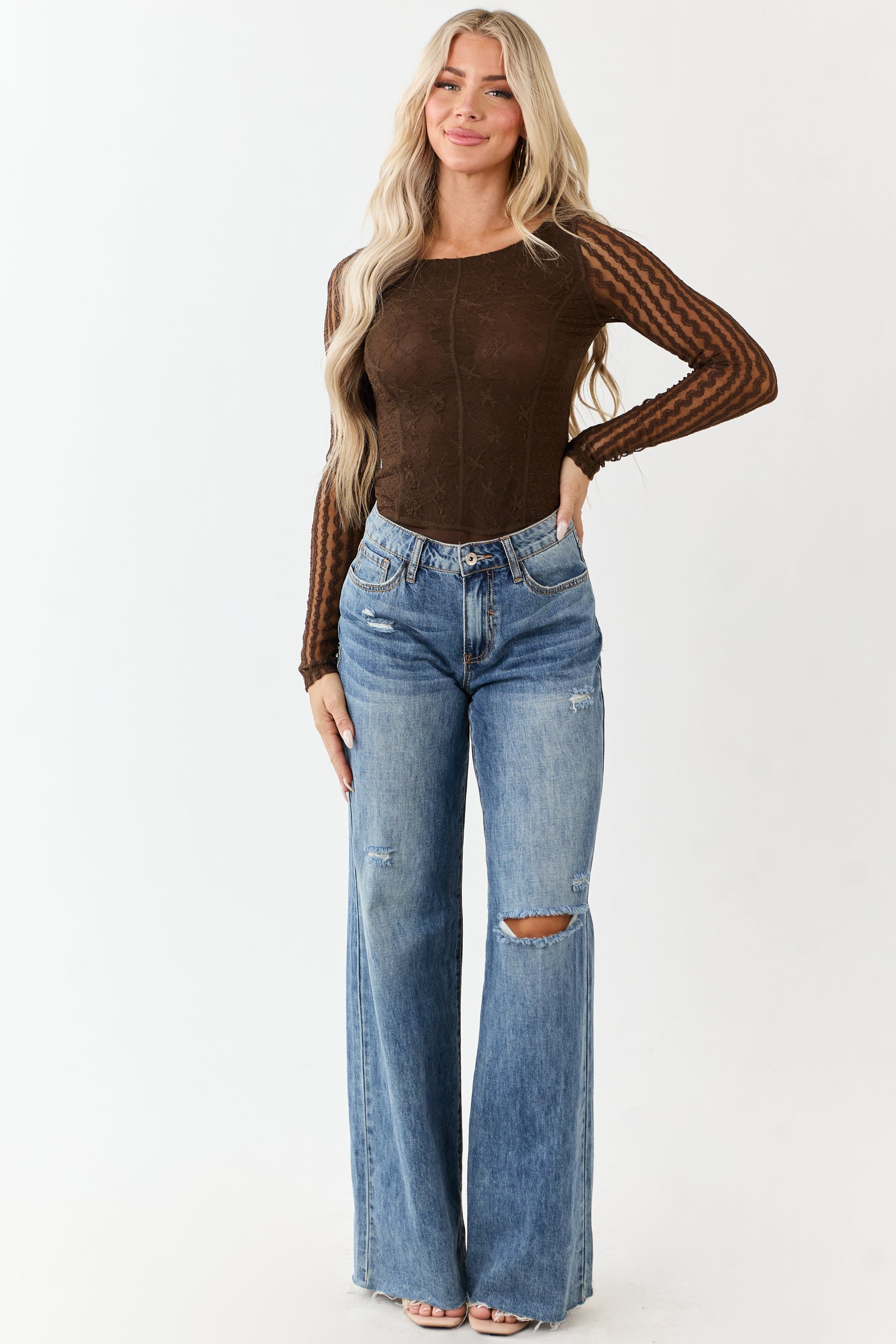 Cocoa Textured Lace Long Sleeve Mesh Bodysuit