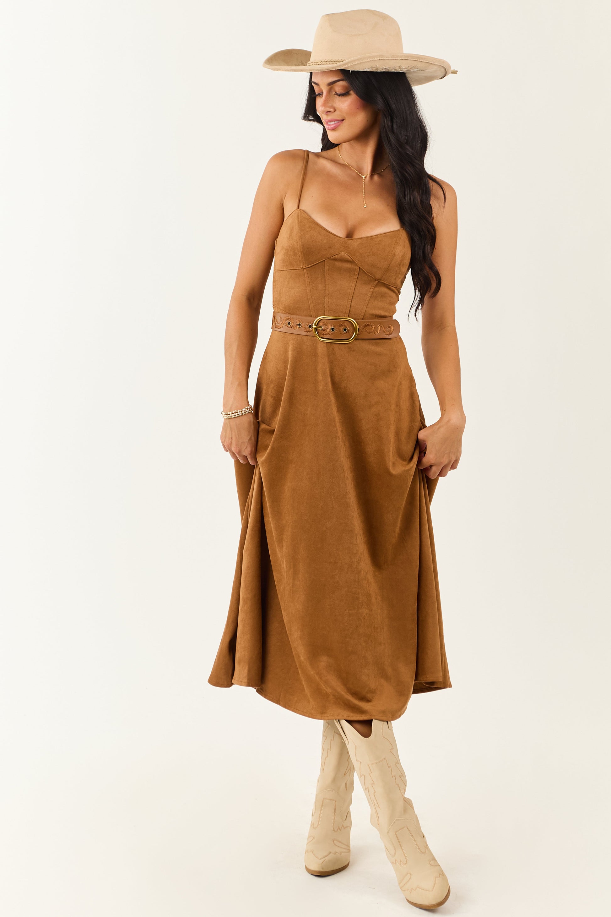Cognac Faux Suede A-Line Sleeveless Midi Dress