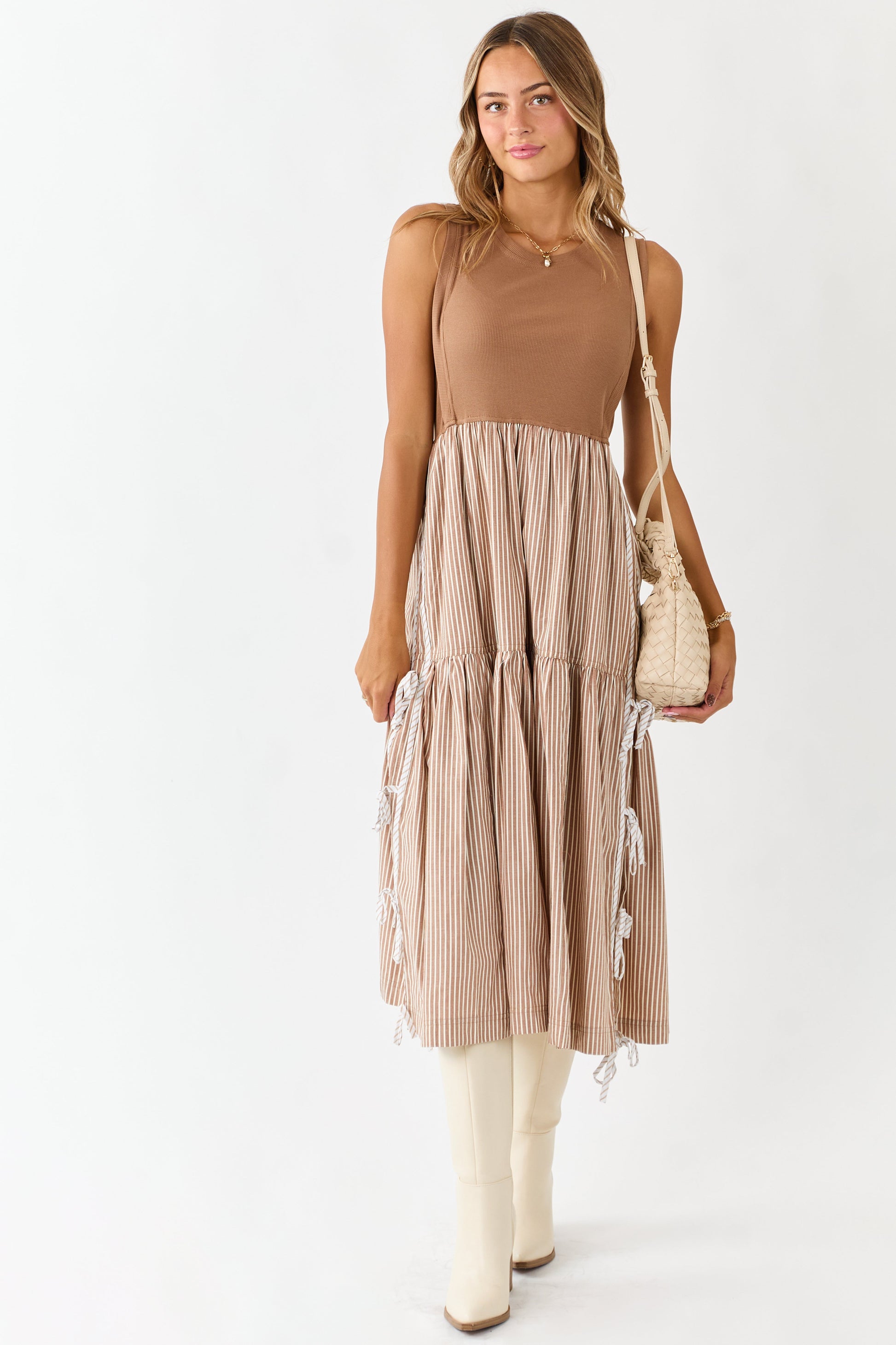 Cognac Ribbed Knit Bodice Contrast Striped Midi Dress