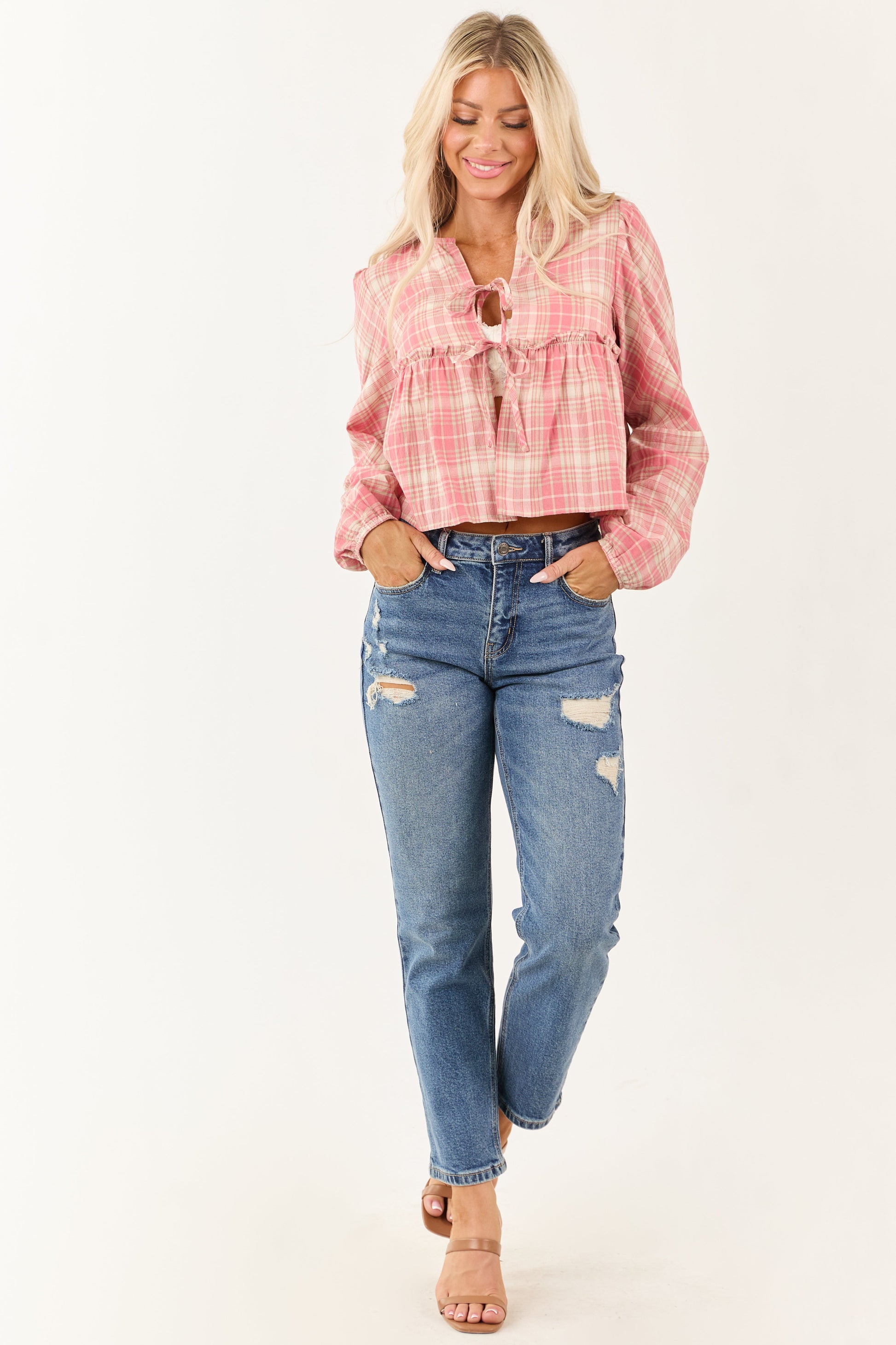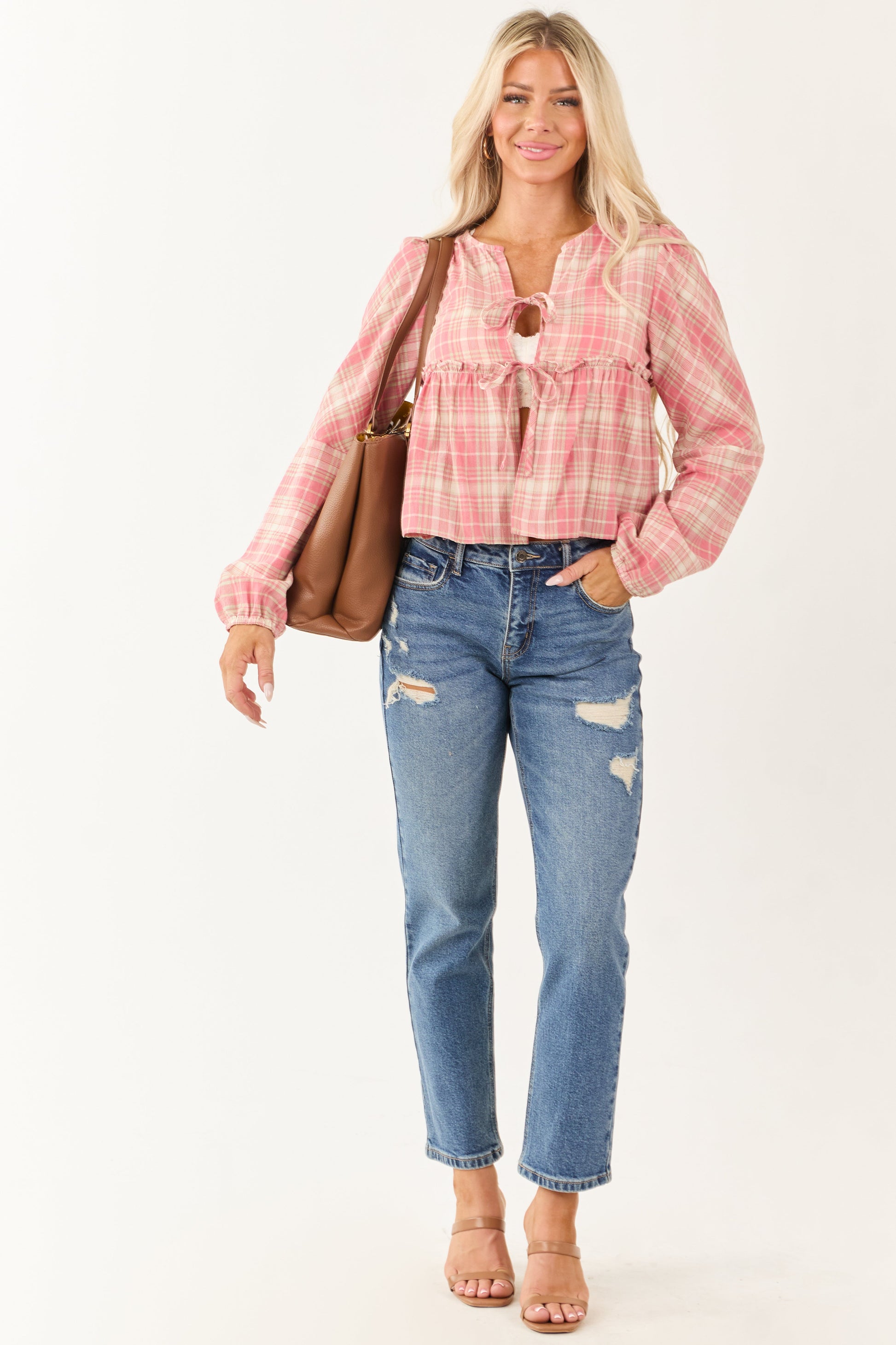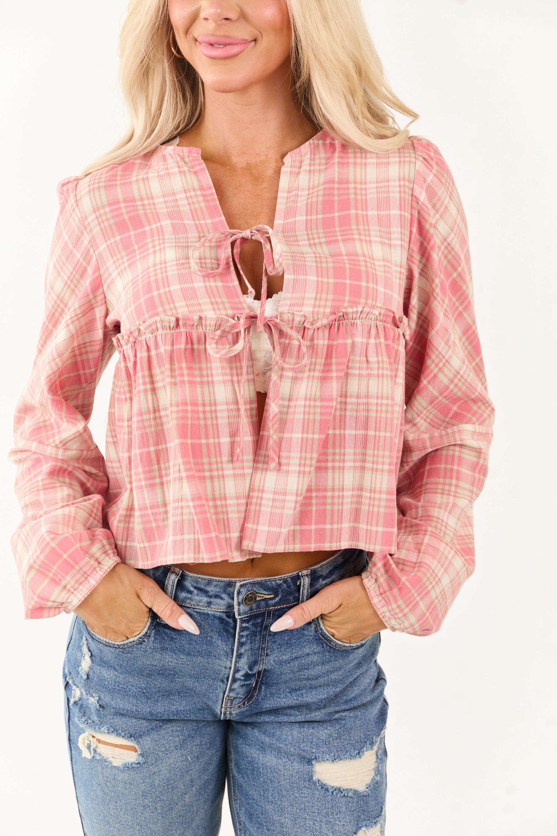 Coral and Cream Plaid Long Sleeve Cotton Top