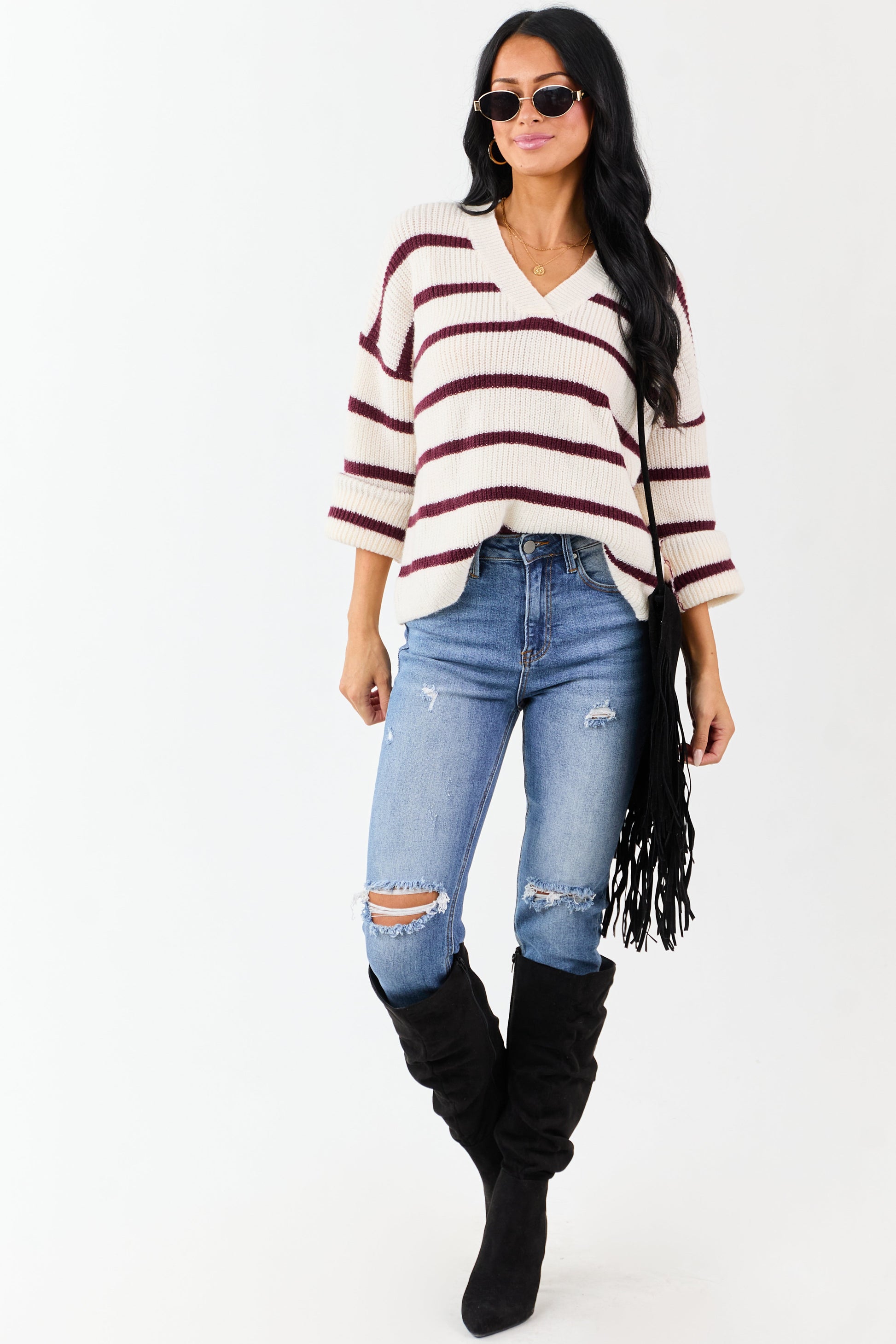 Cream and Mahogany Striped V-Neck Rib Knit Sweater