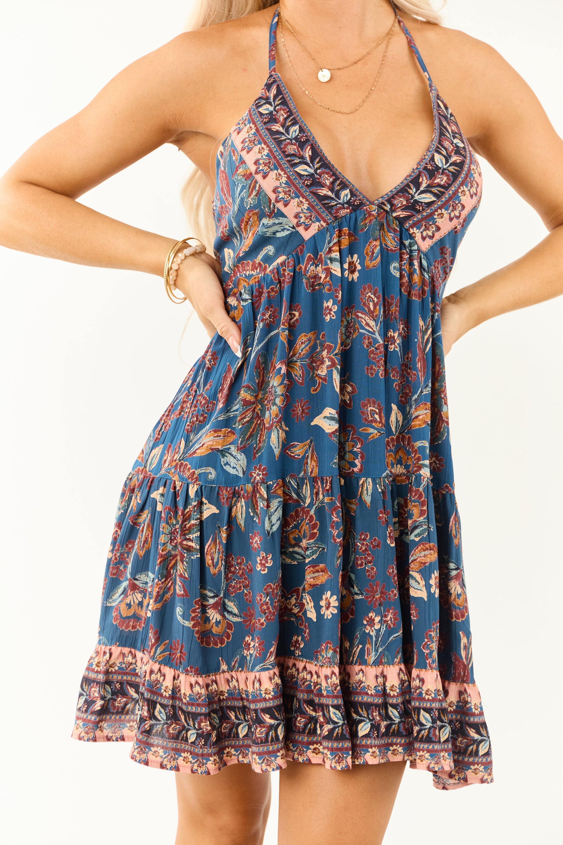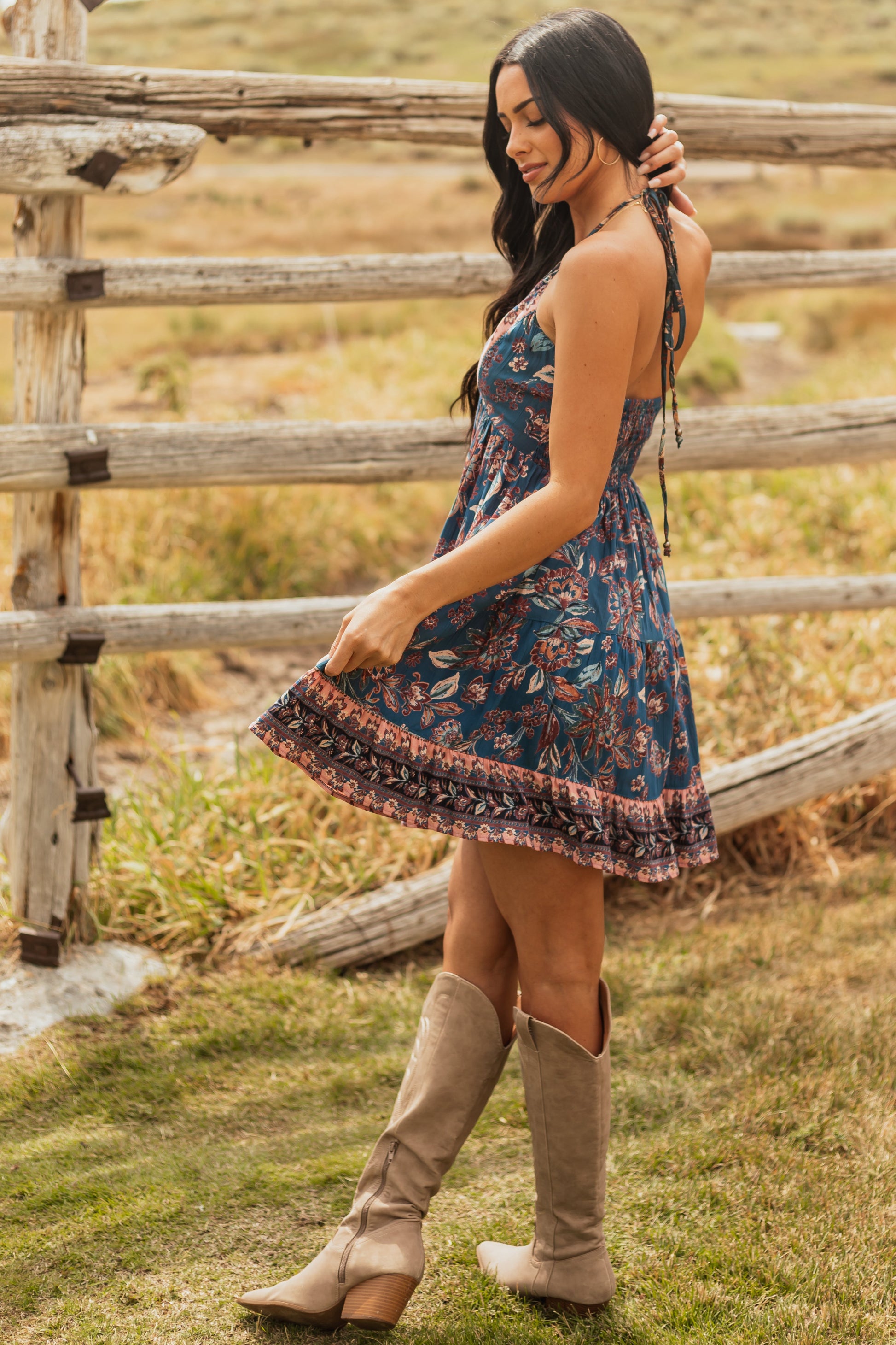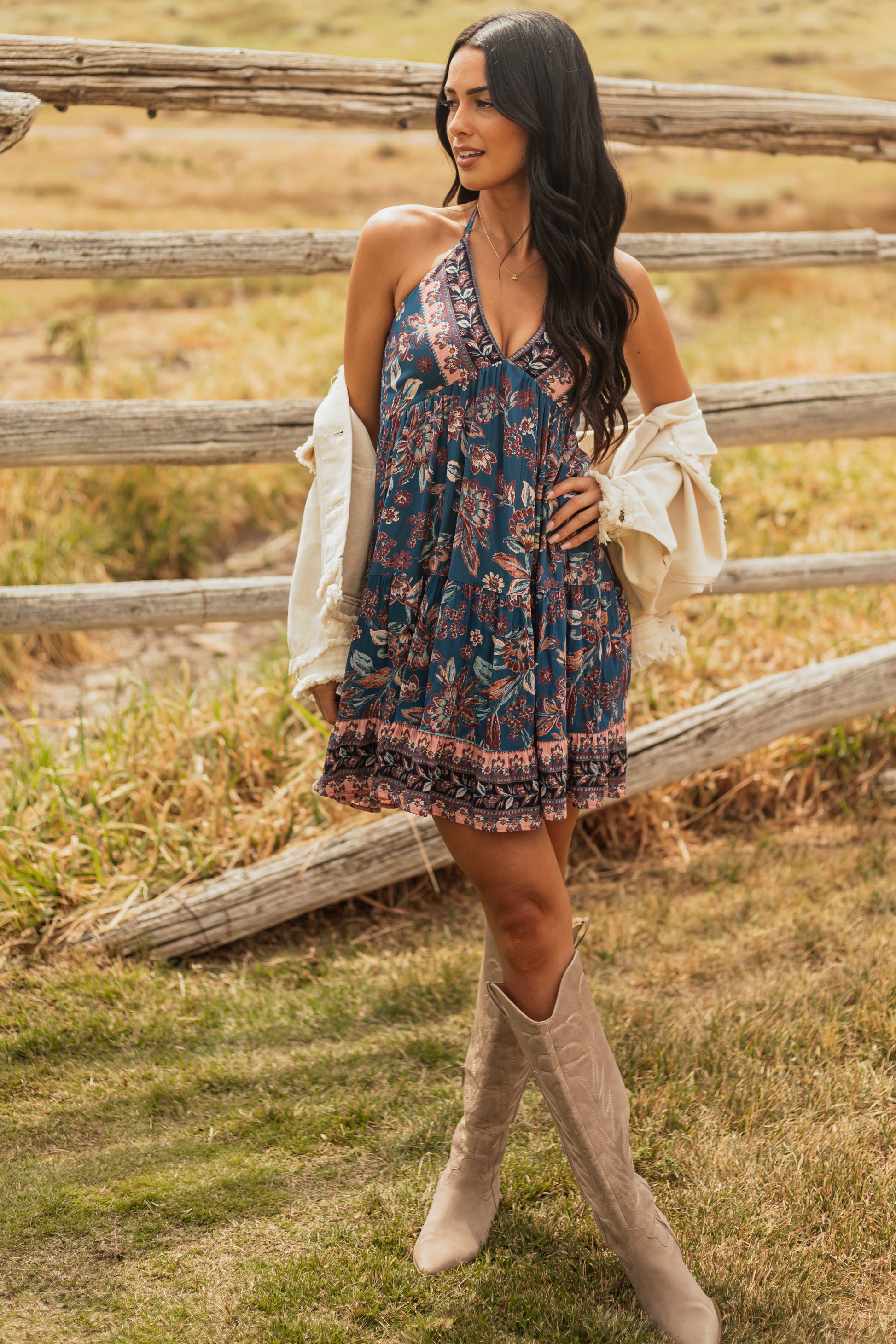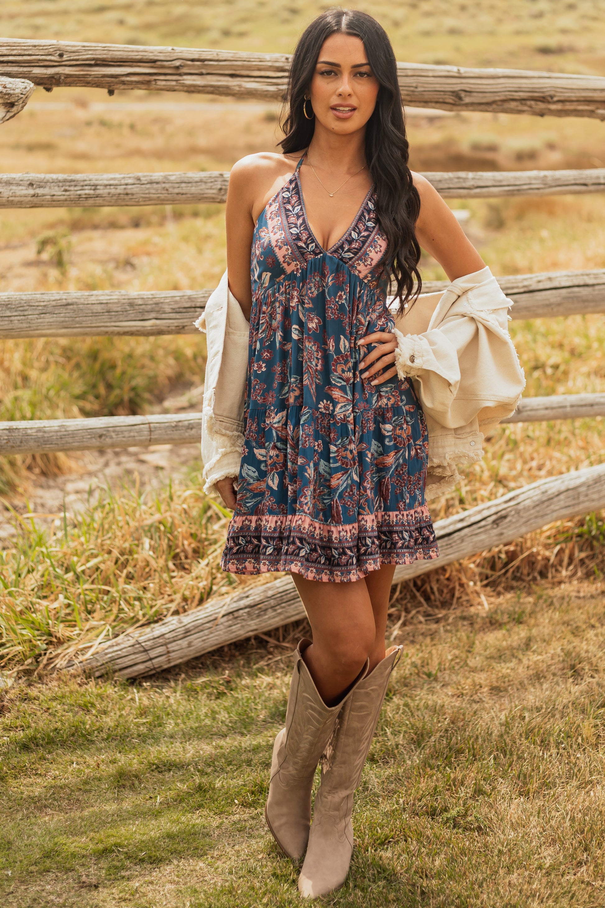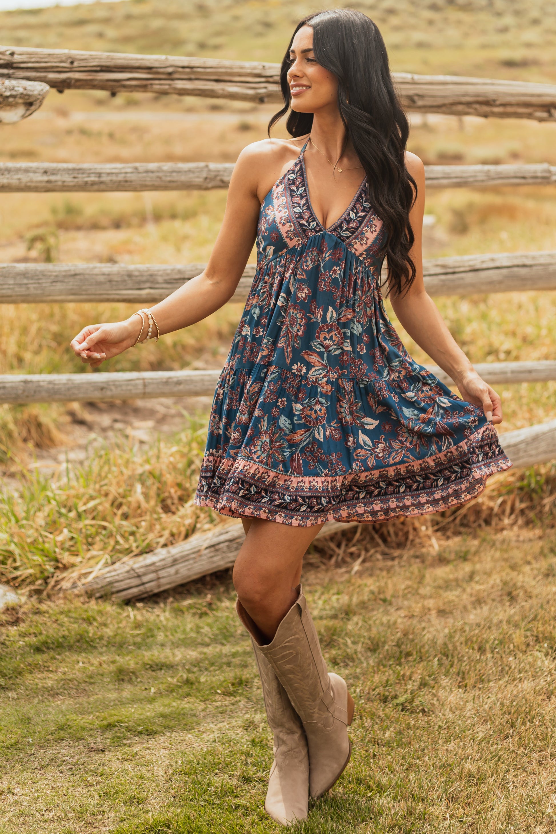 • This boho chic mosaic print dress has a forgiving smocked back and flattering deep v neckline.