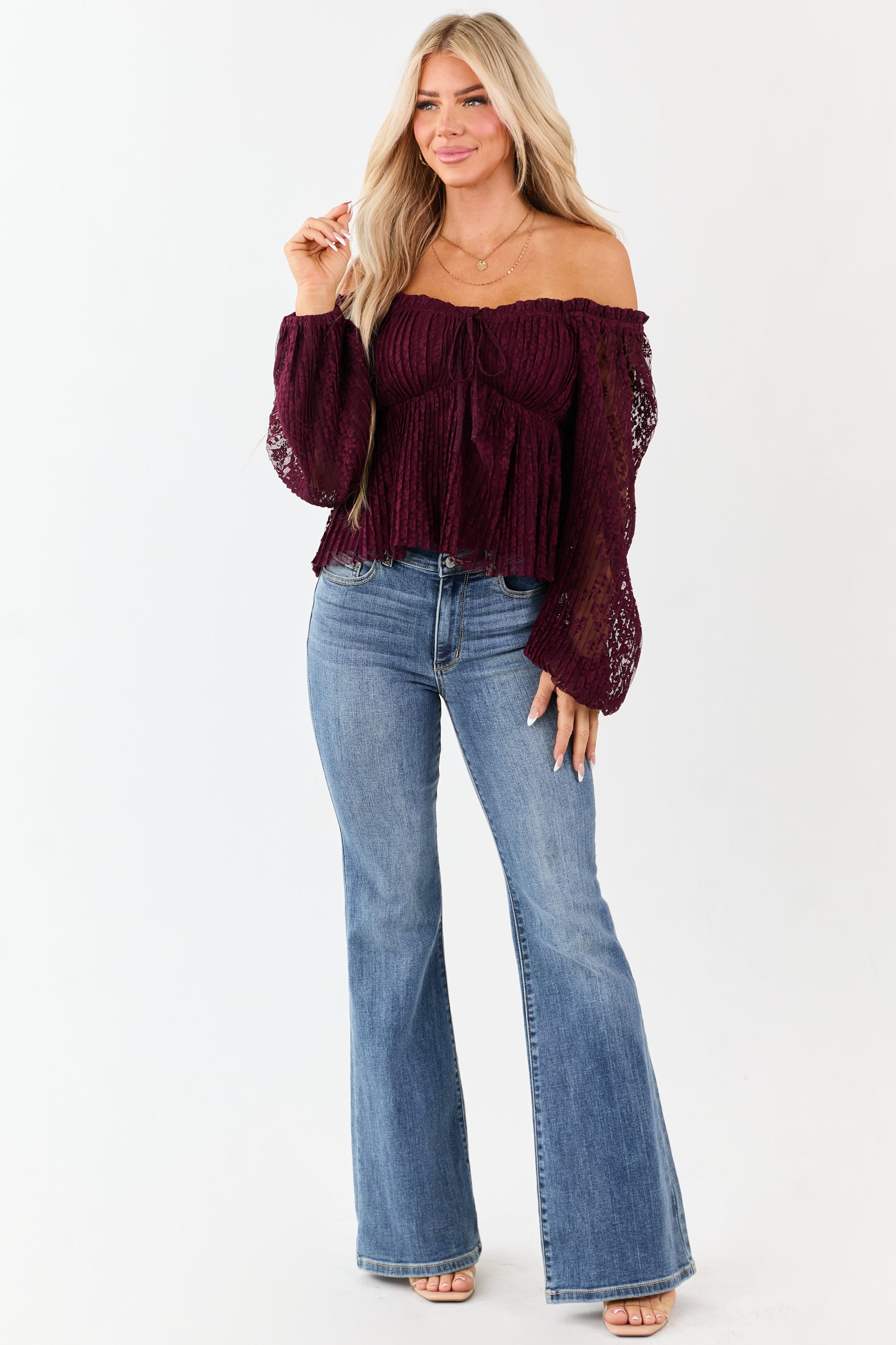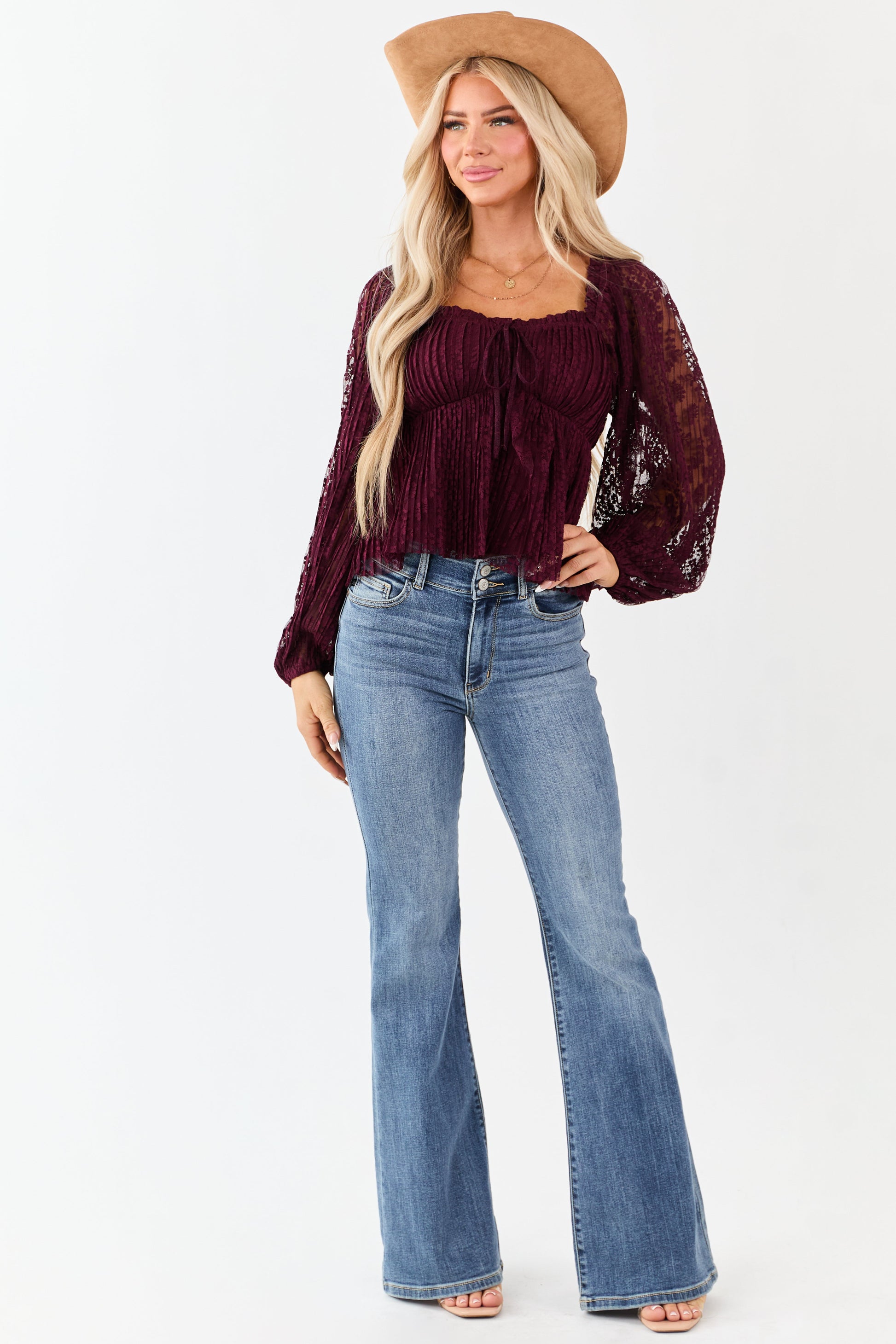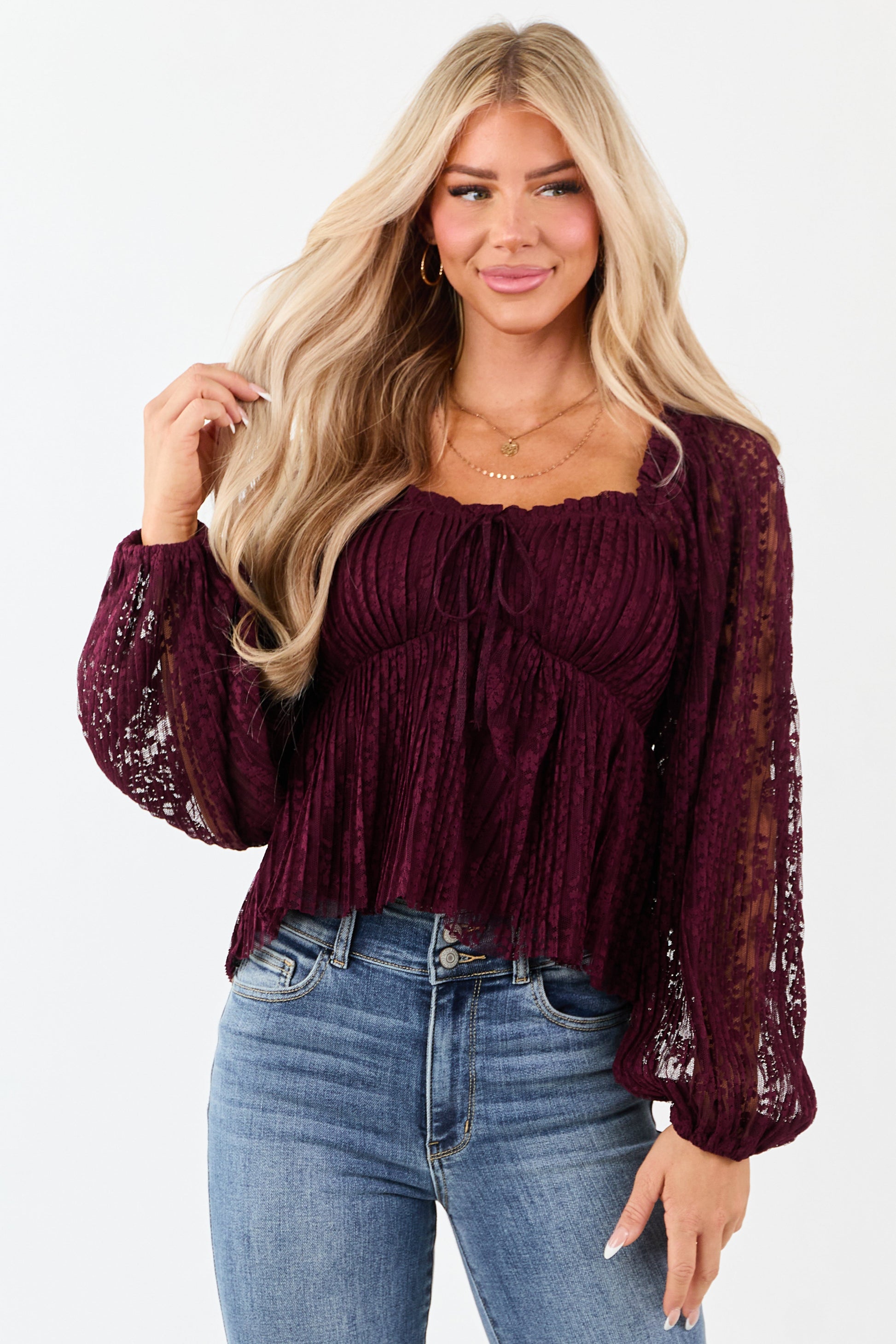 Listicle Wine Floral Lace Long Sleeve Babydoll Top
