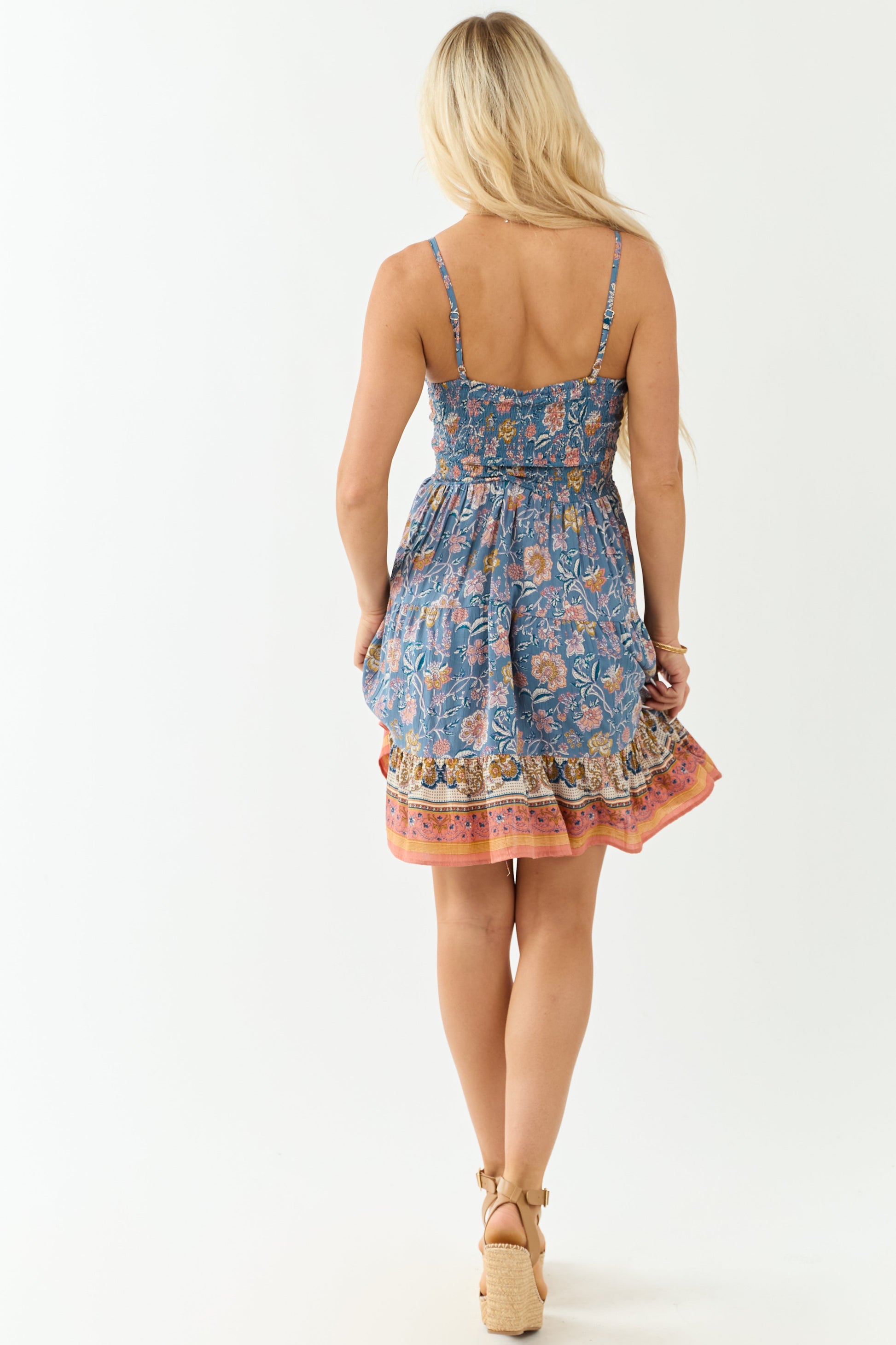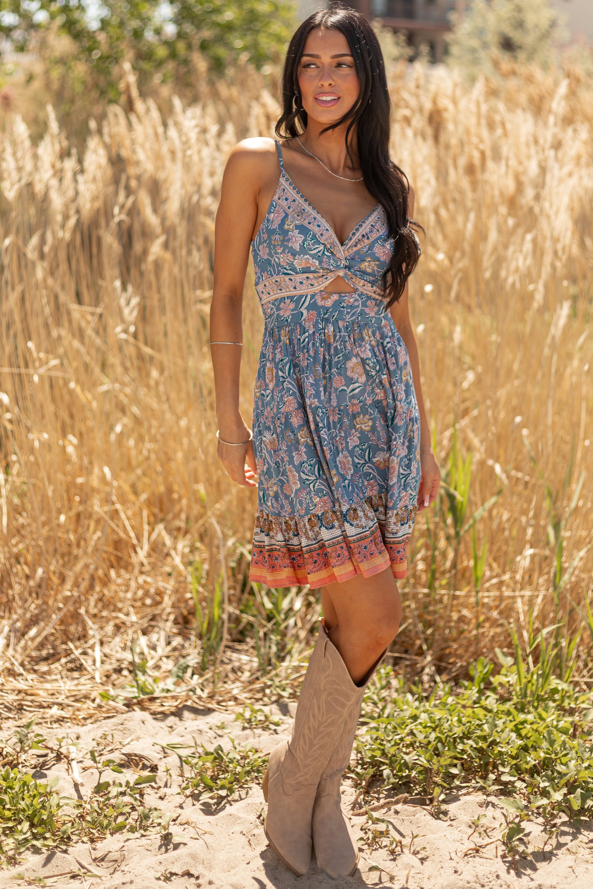 Ocean Floral Print Deep V Twist Cutout Mini Dress