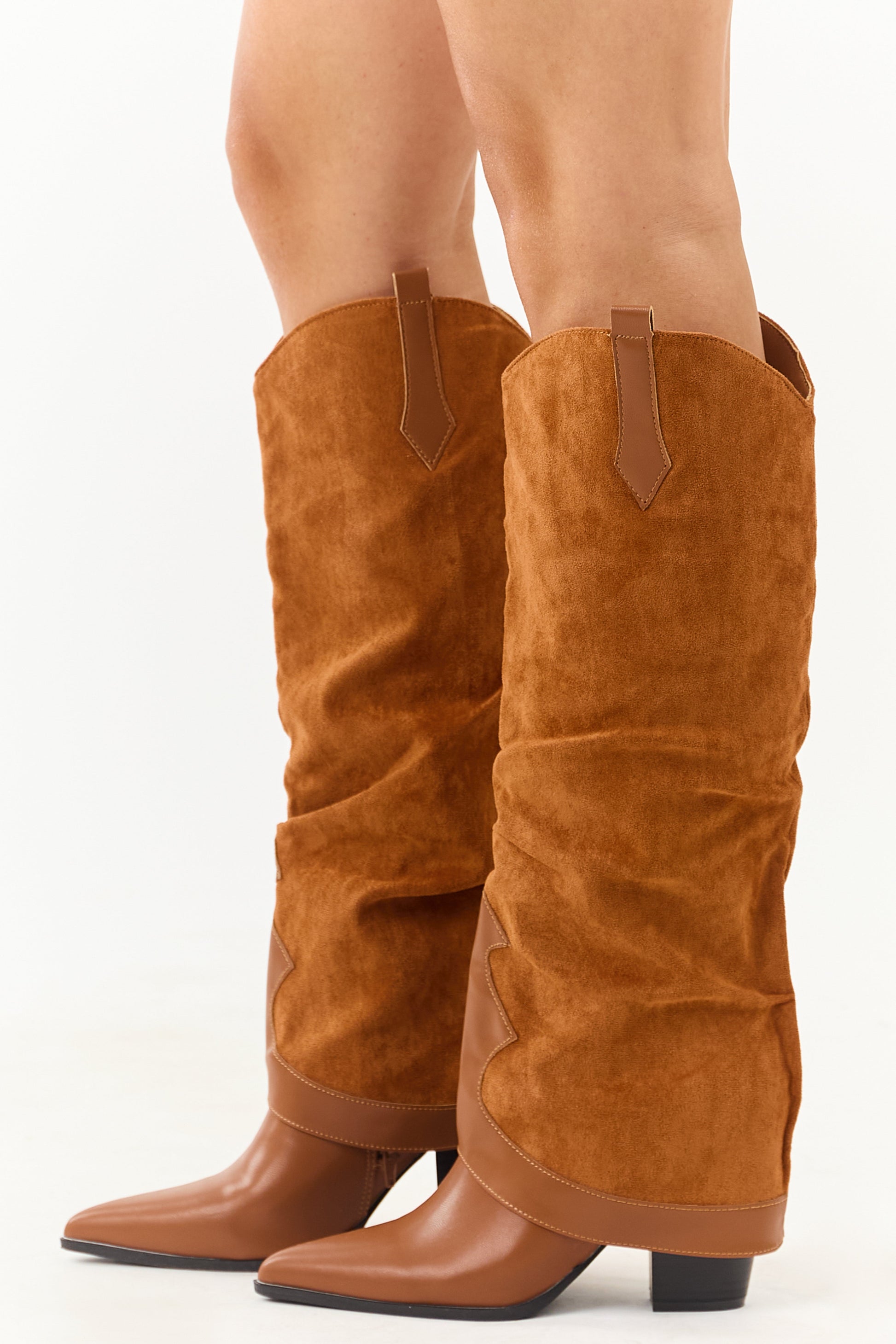Caramel Faux Suede Overlay Knee High Cowboy Boots