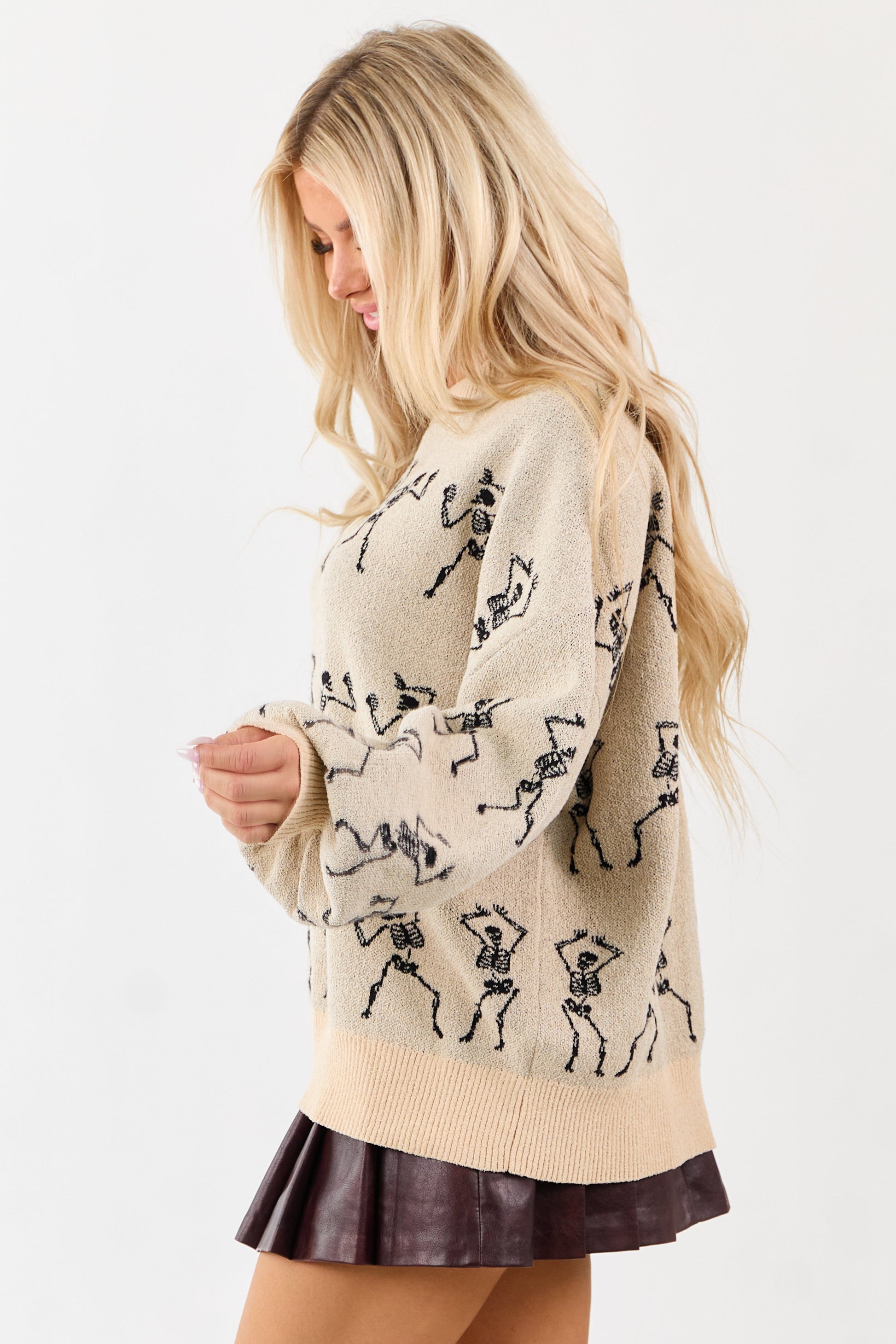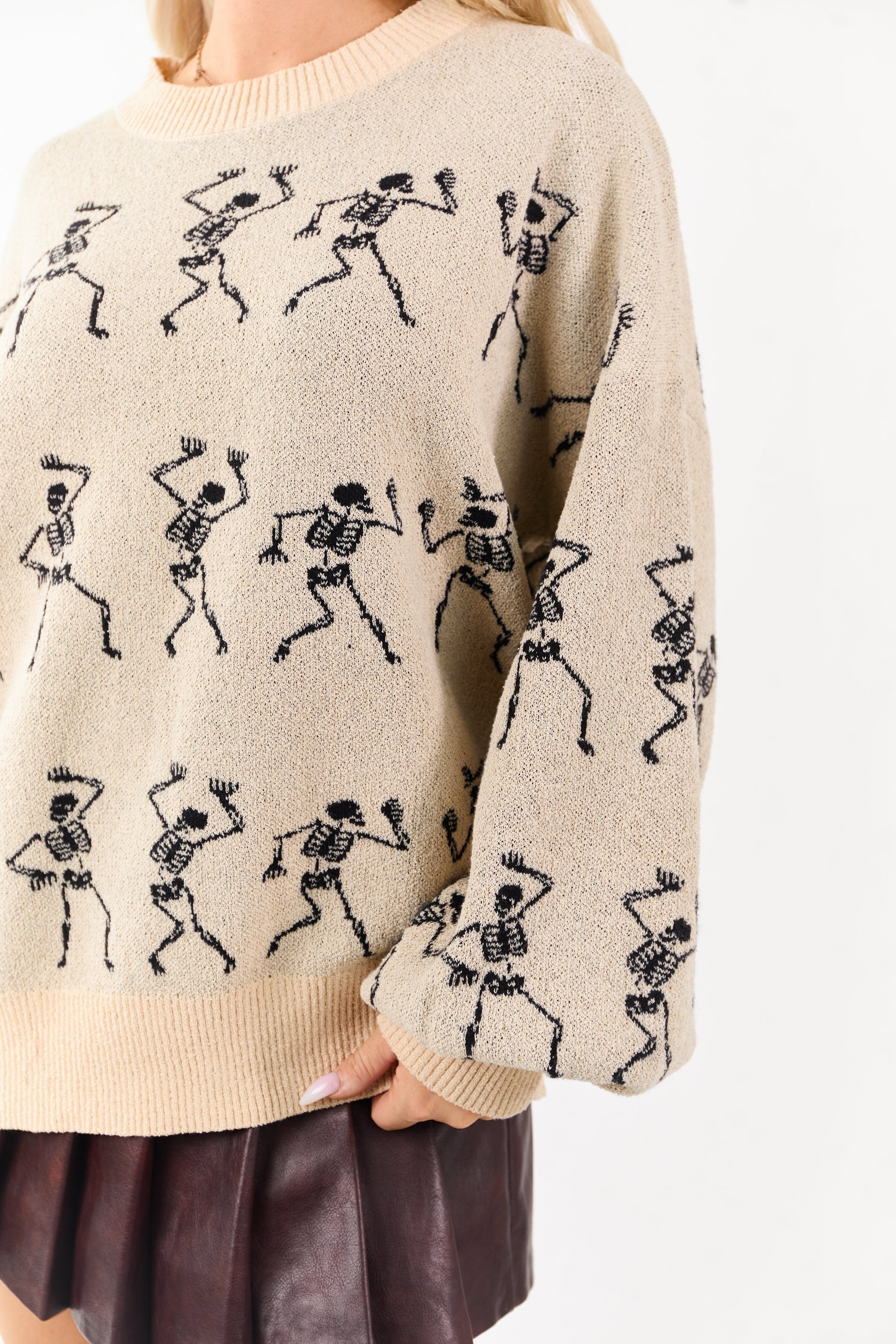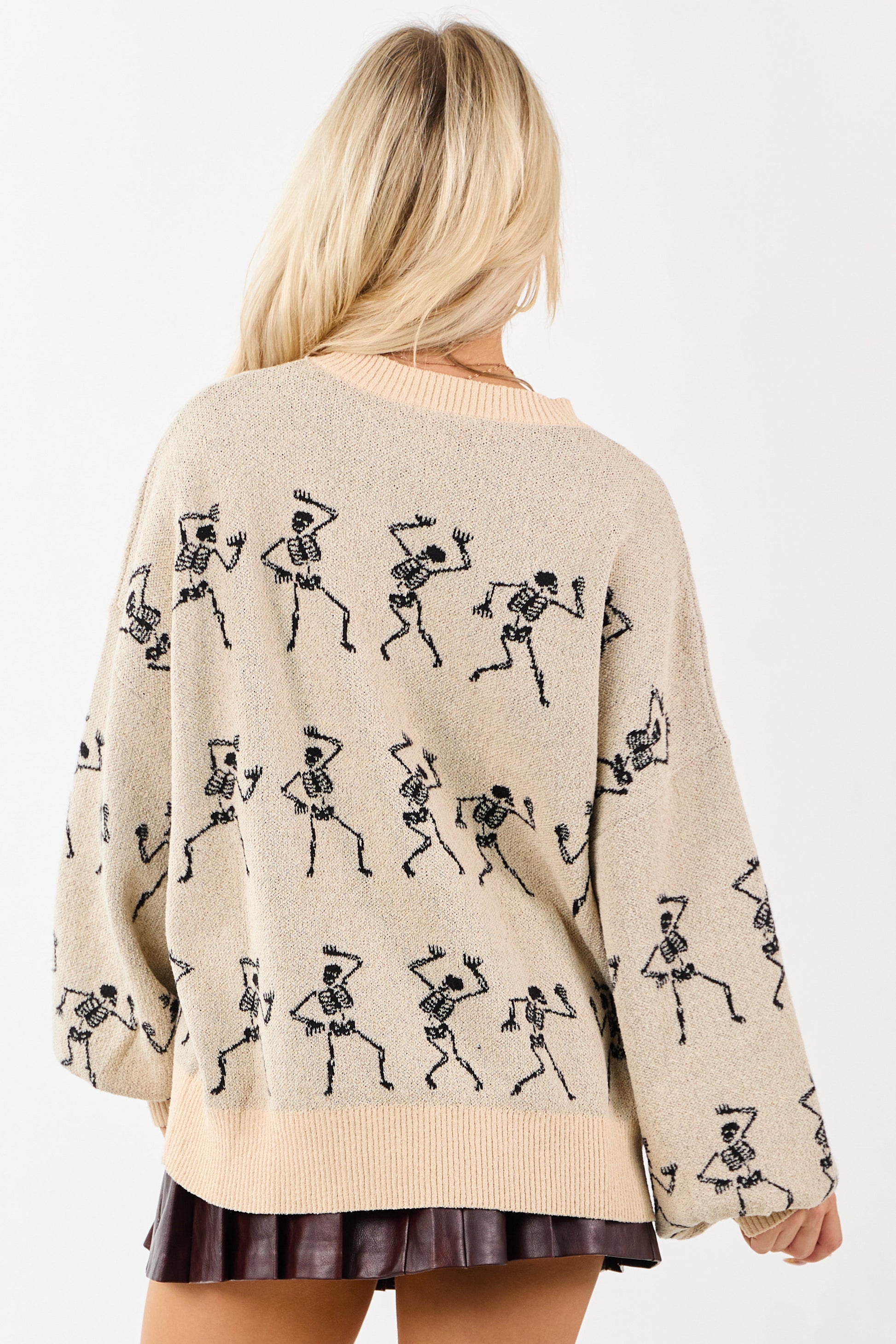 Almond Skeleton Pattern Puff Sleeve Knit Sweater
