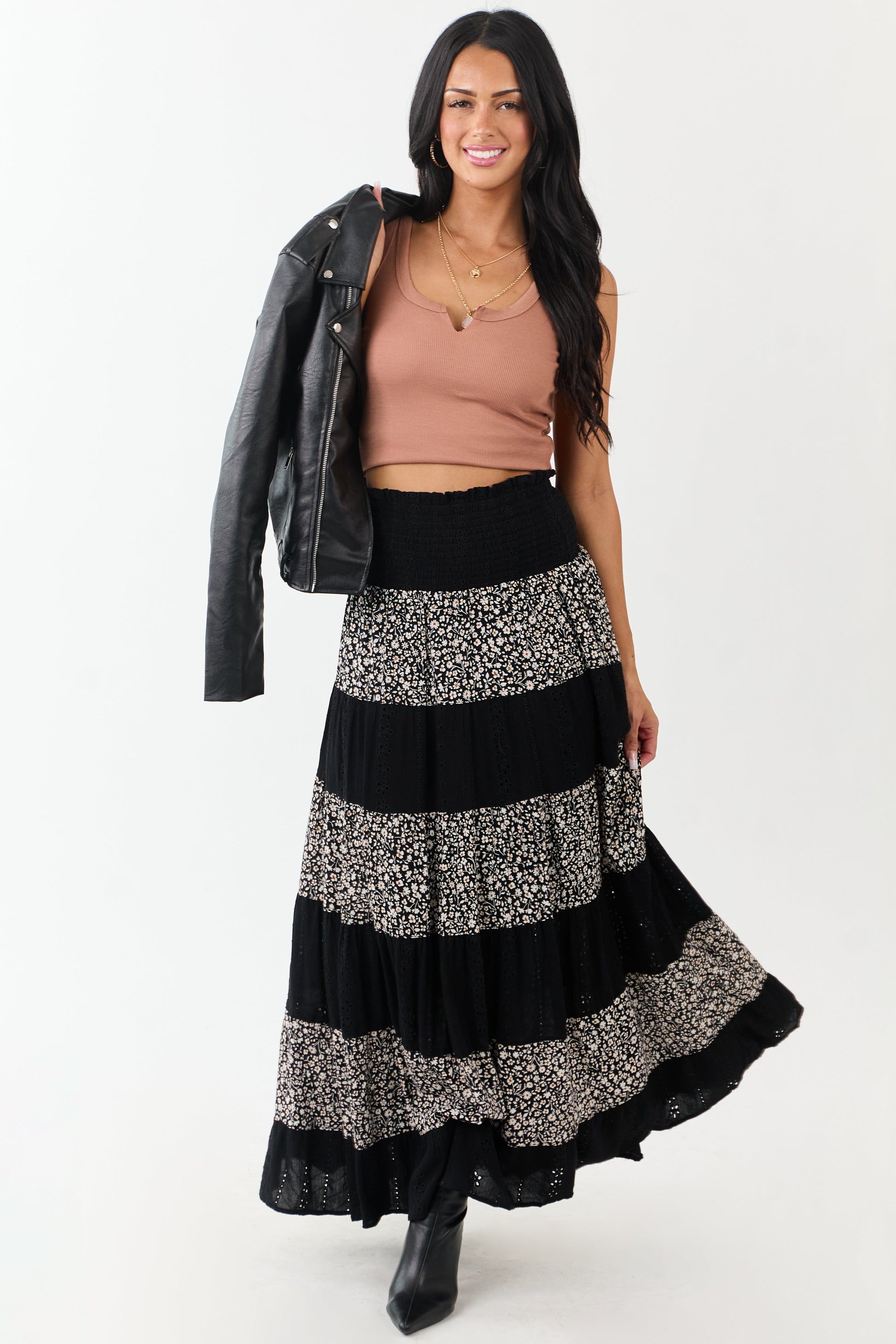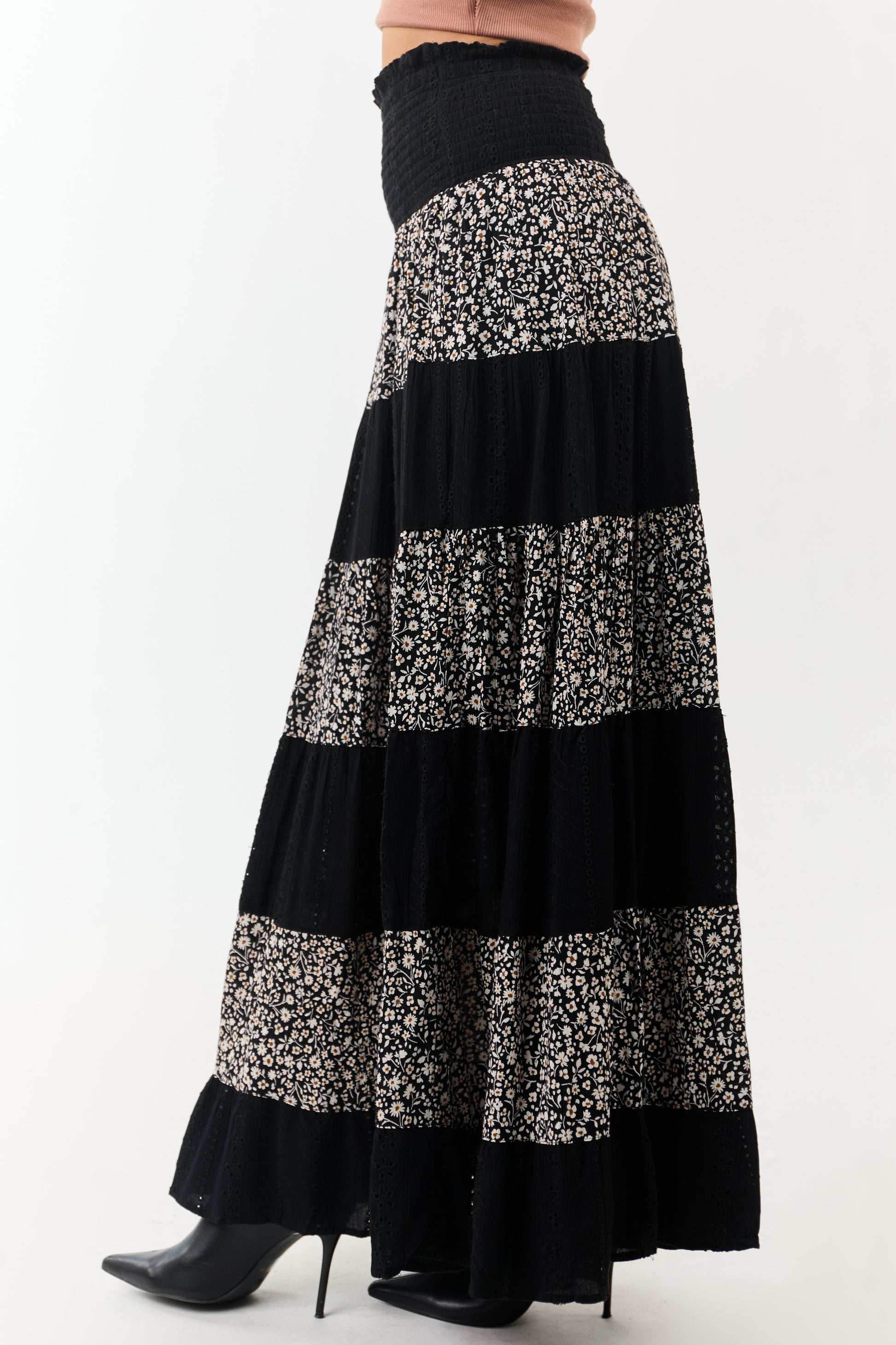 Black Eyelet Lace and Floral Print Tiered Maxi...
