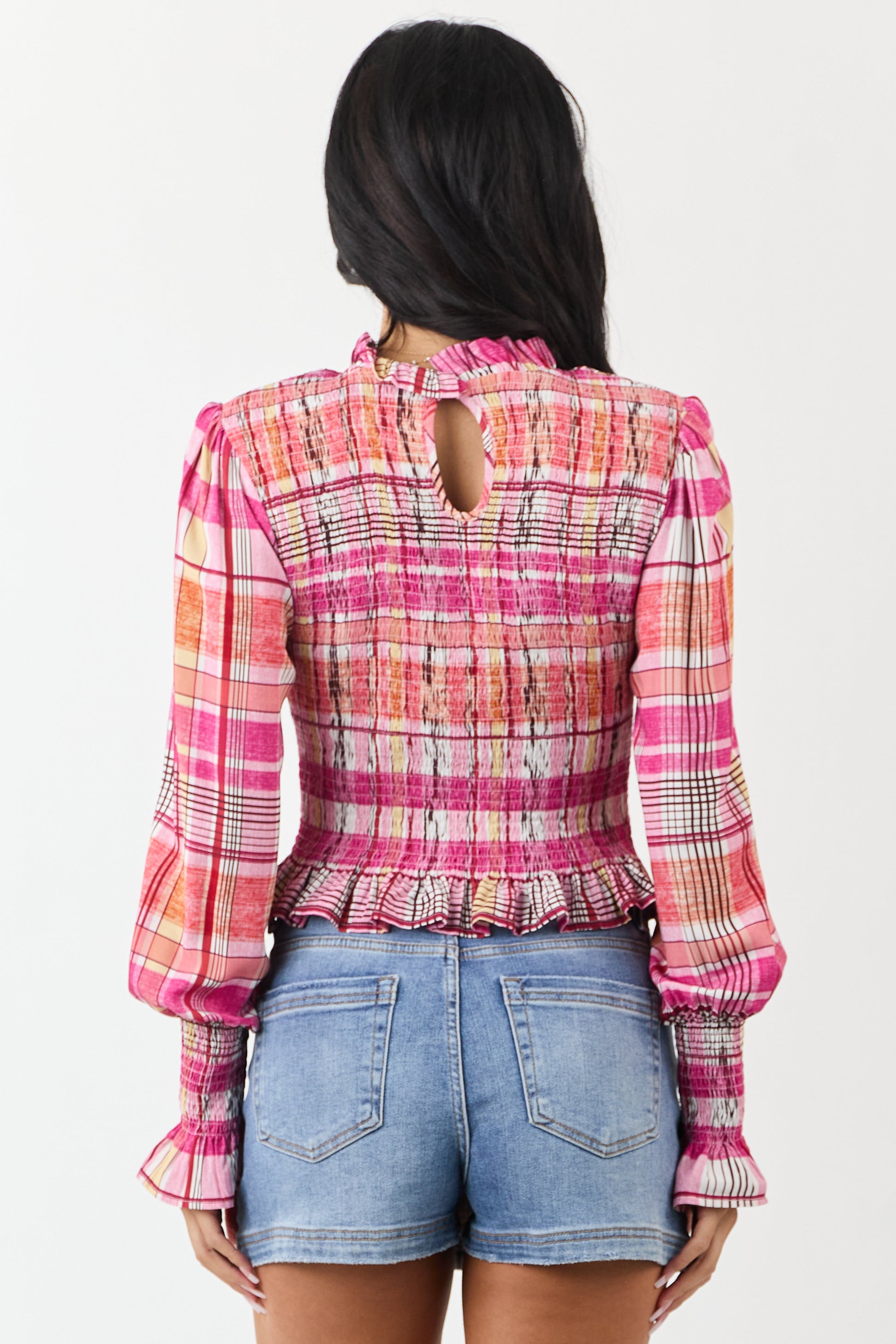 Fuchsia Plaid Smocked Long Sleeve Cotton Top