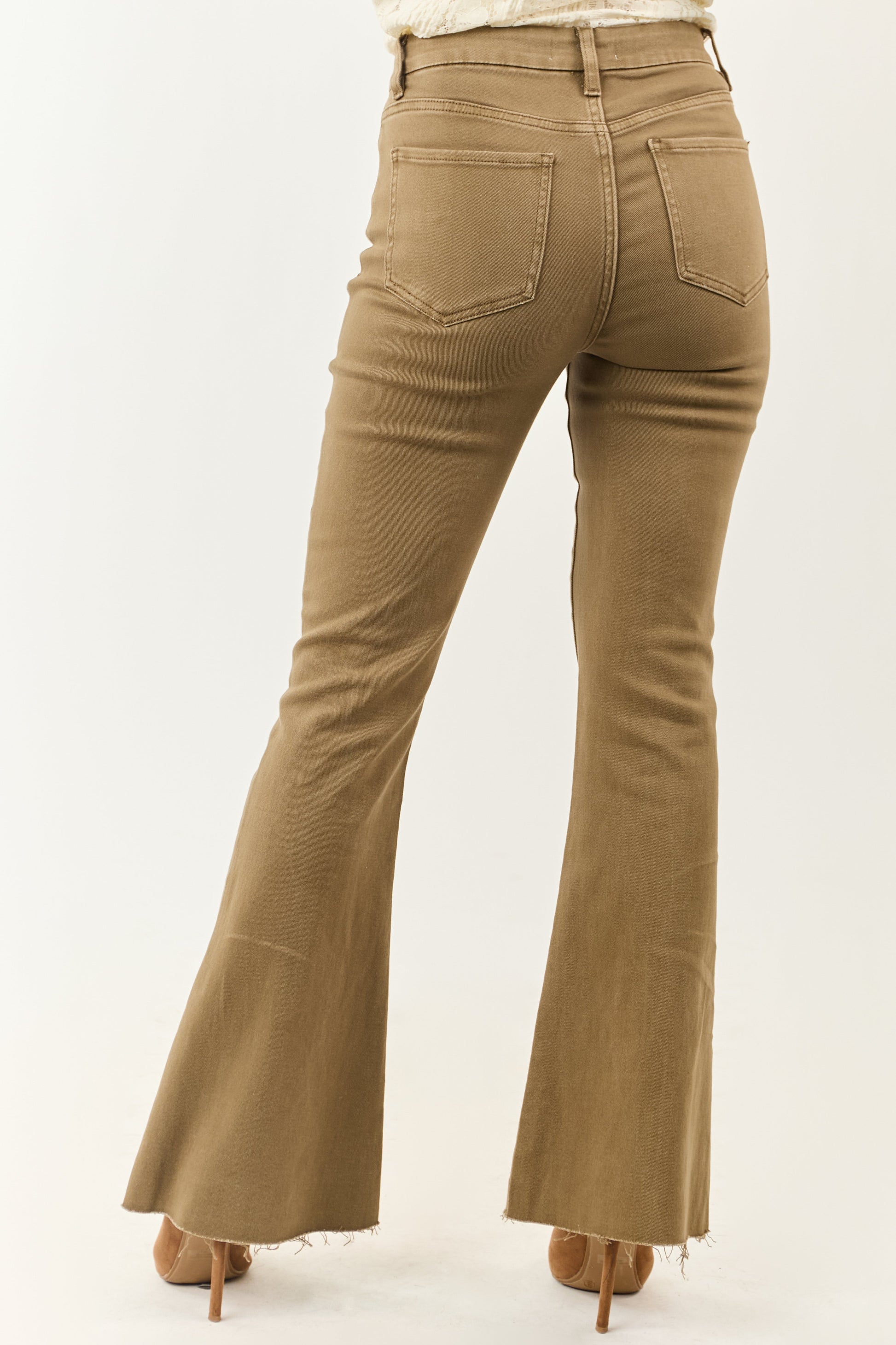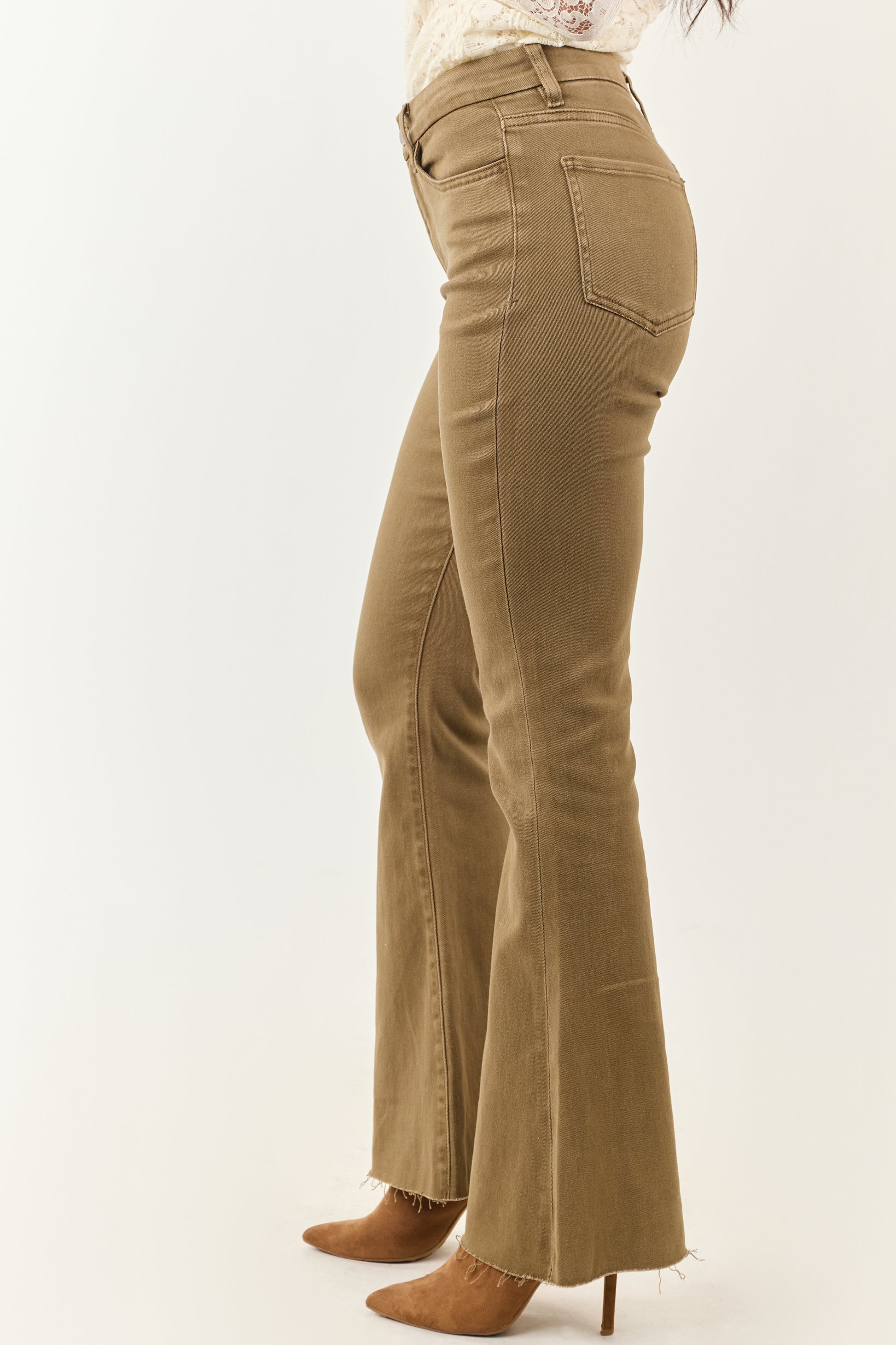 Olive High Rise Raw Hem Stretchy Flare Jeans