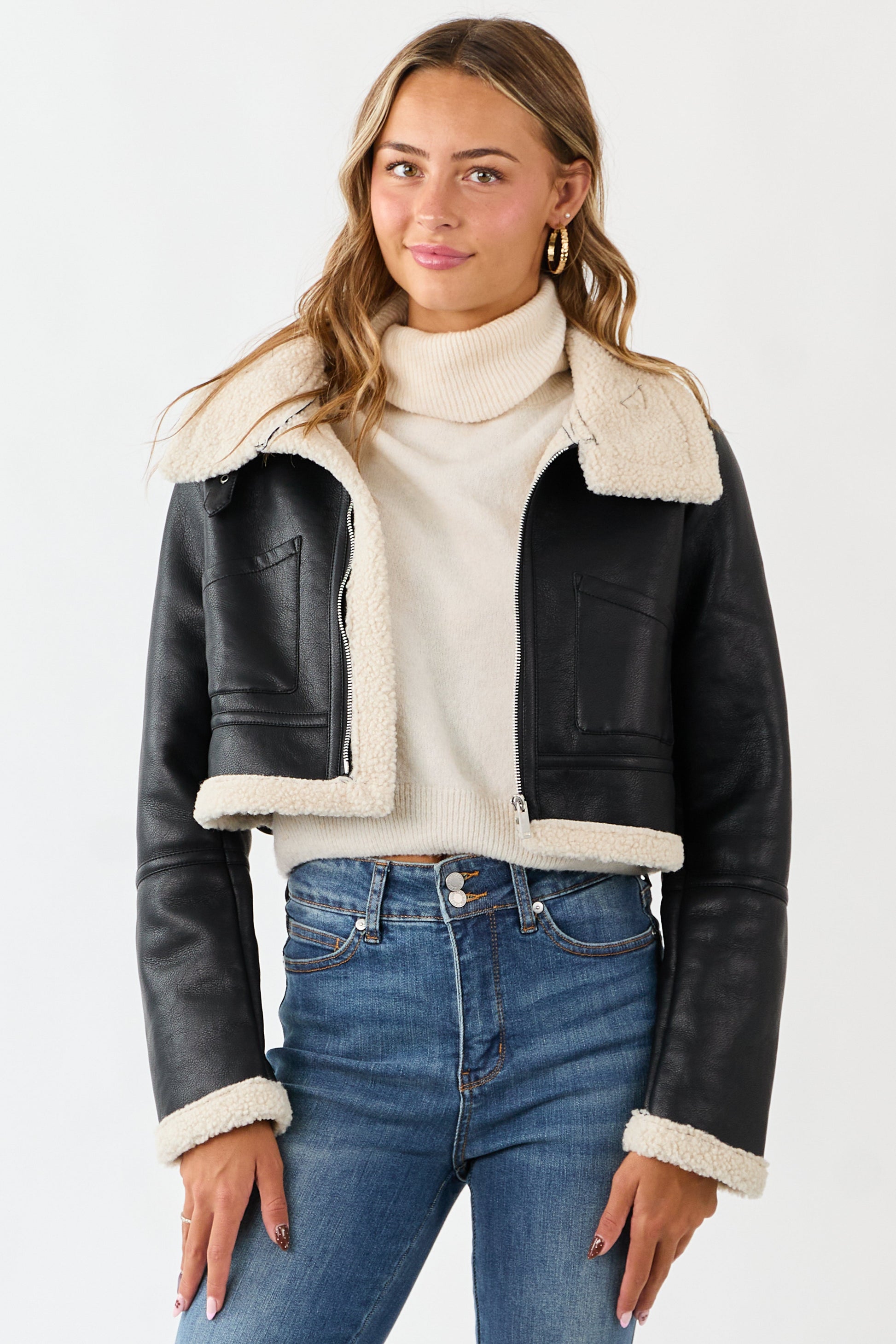 • This trendy cropped jacket features soft faux leather complimented by plush soft sherpa lining.