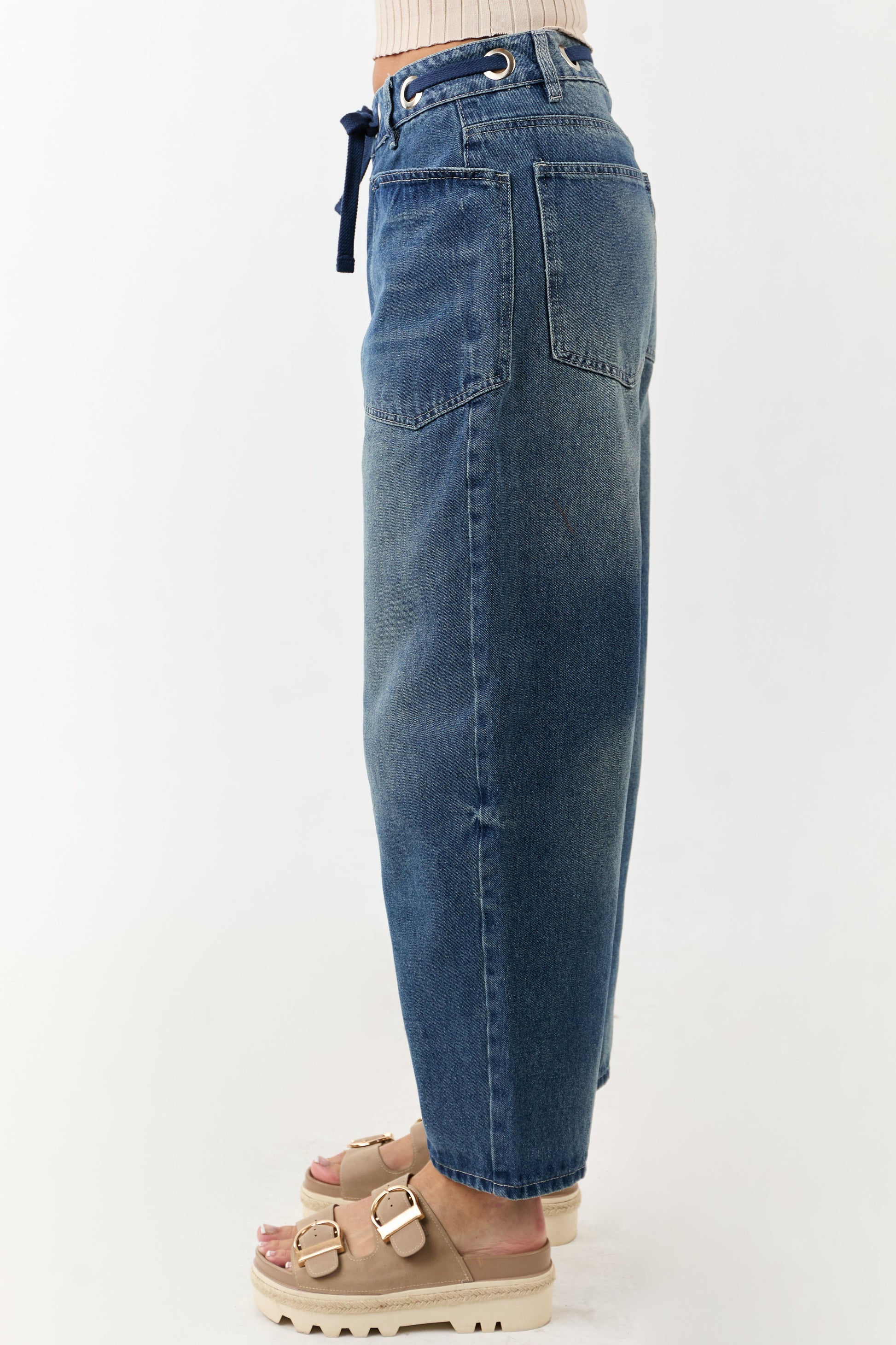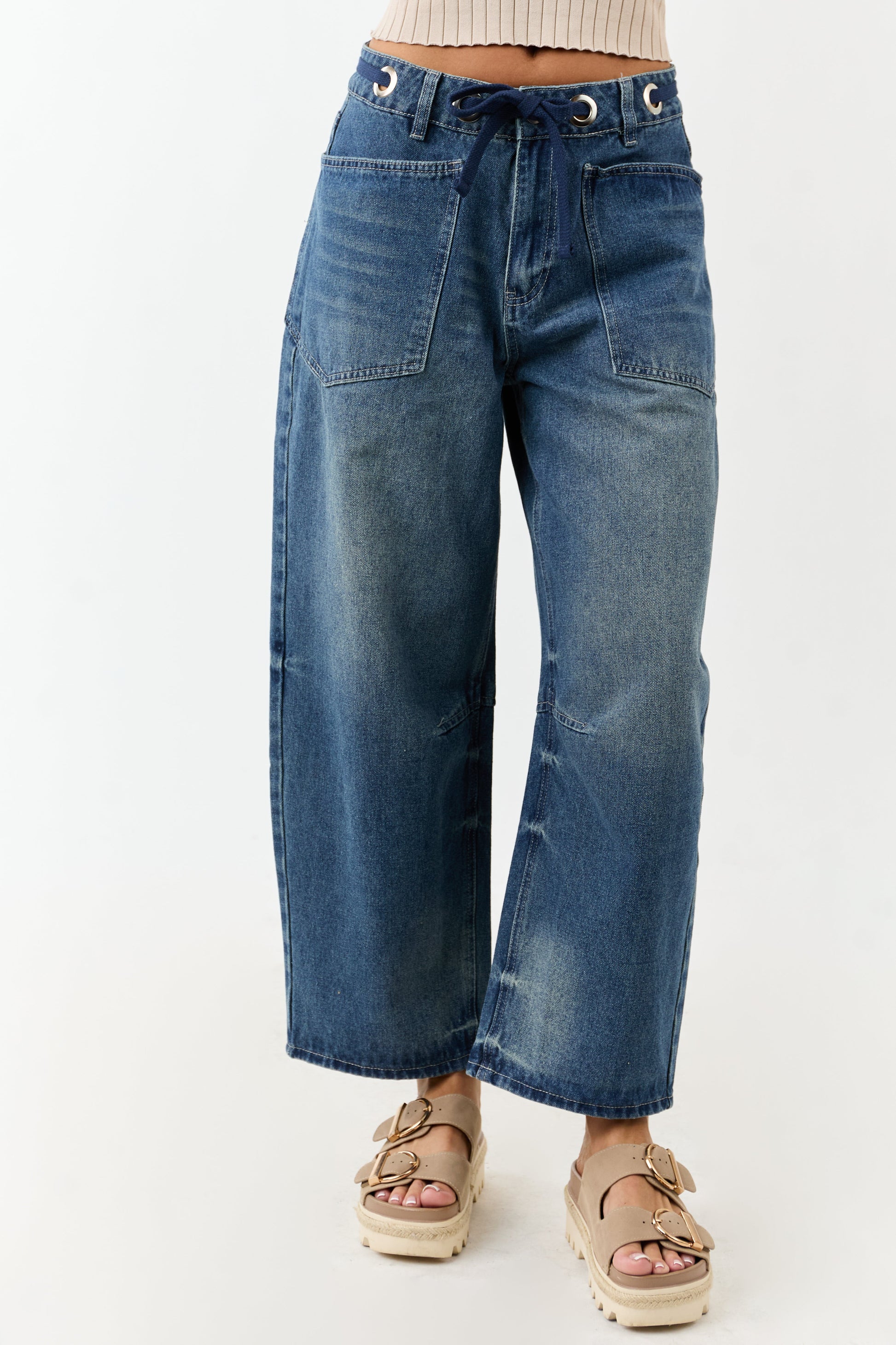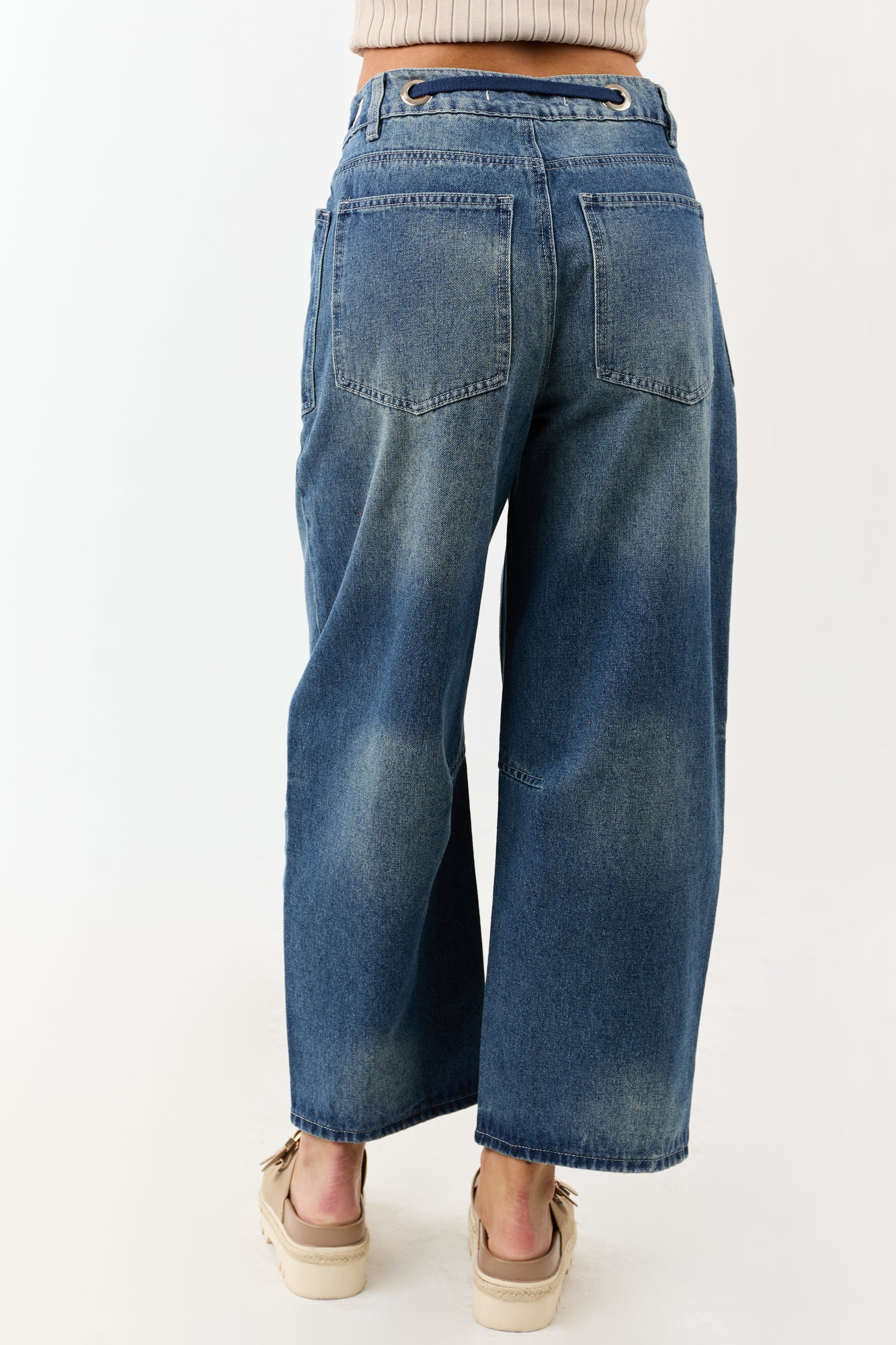 Medium Vintage Wash High Rise Drawstring Barrel Jeans