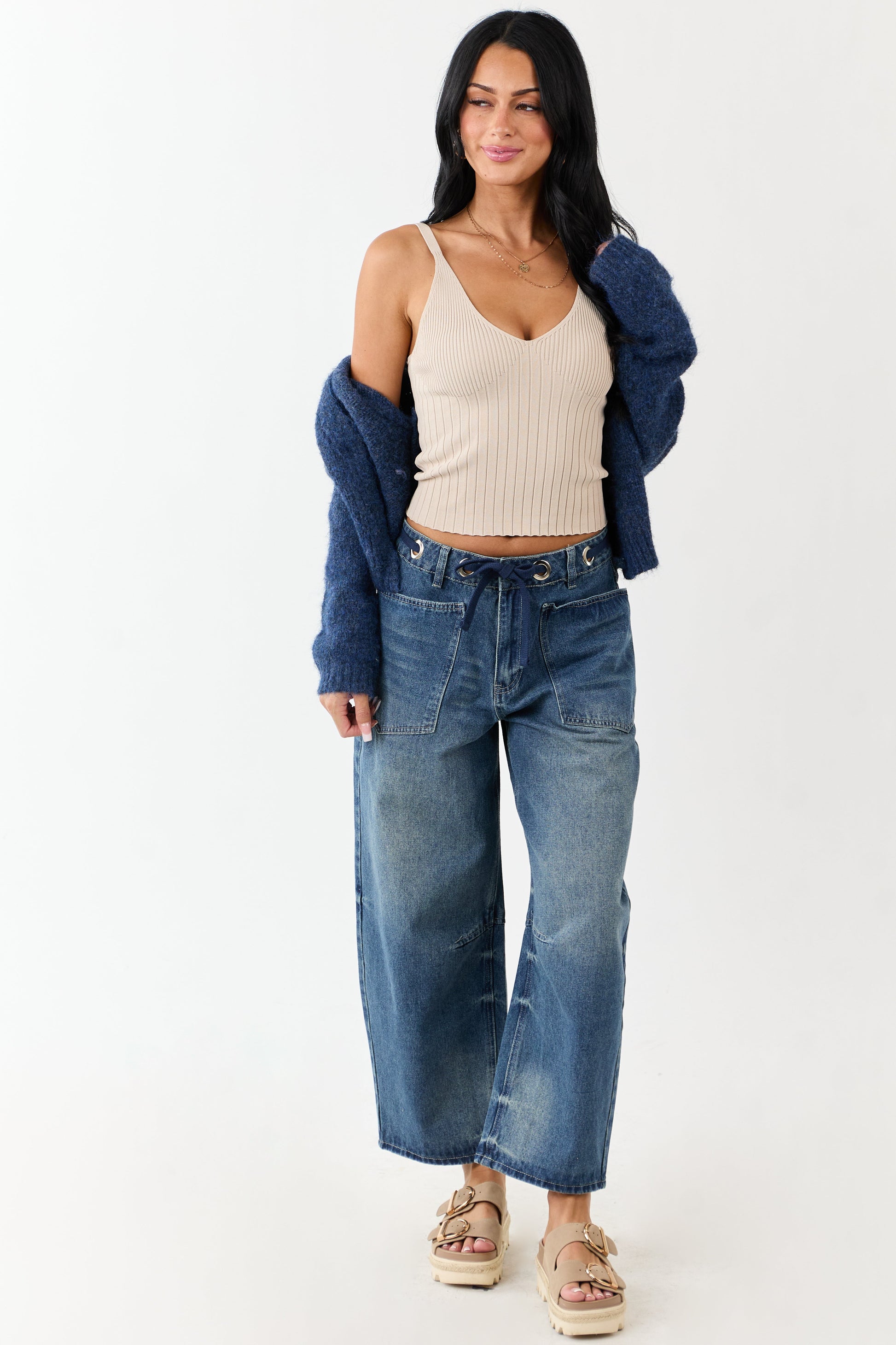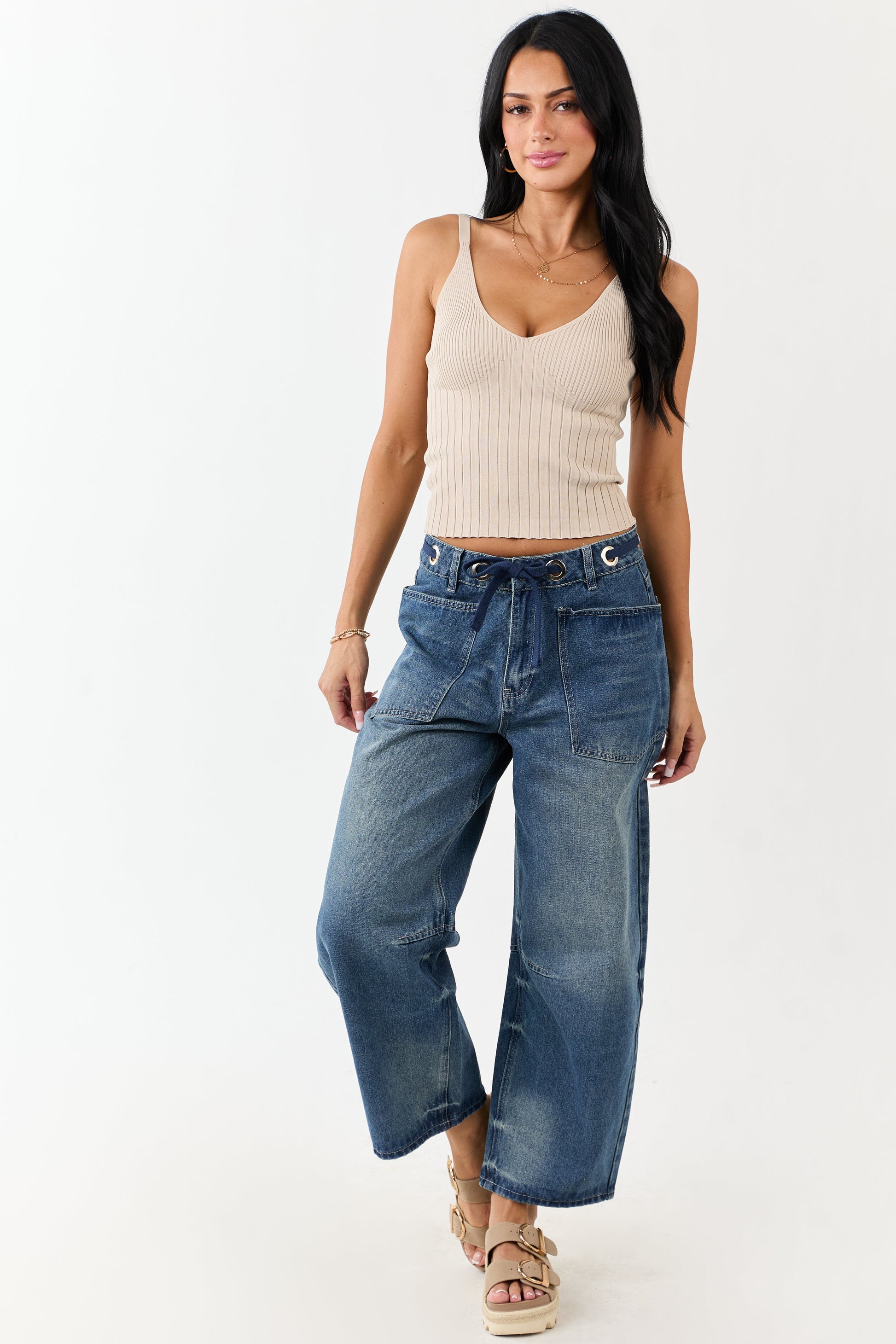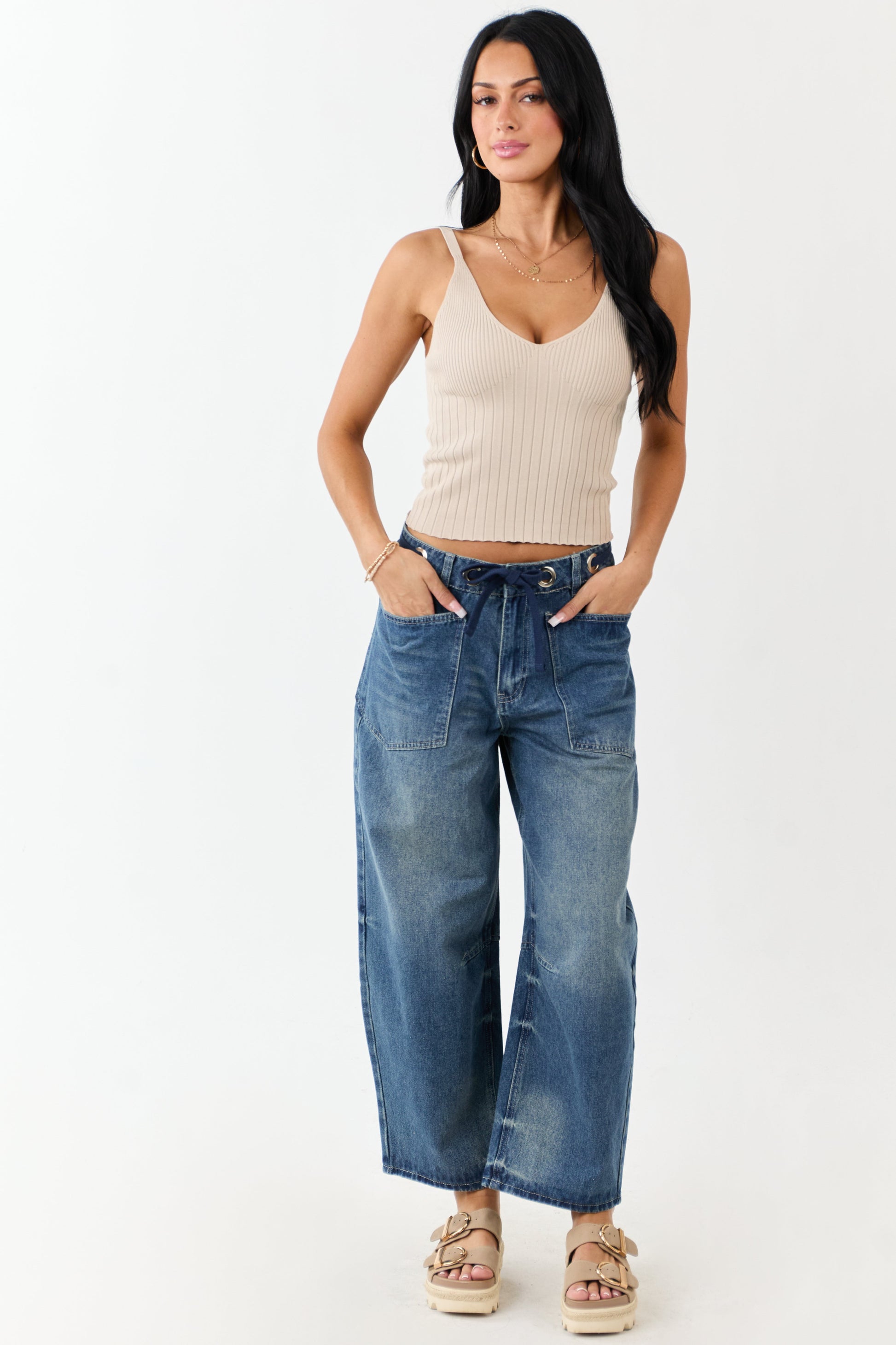 Medium Vintage Wash High Rise Drawstring Barrel Jeans