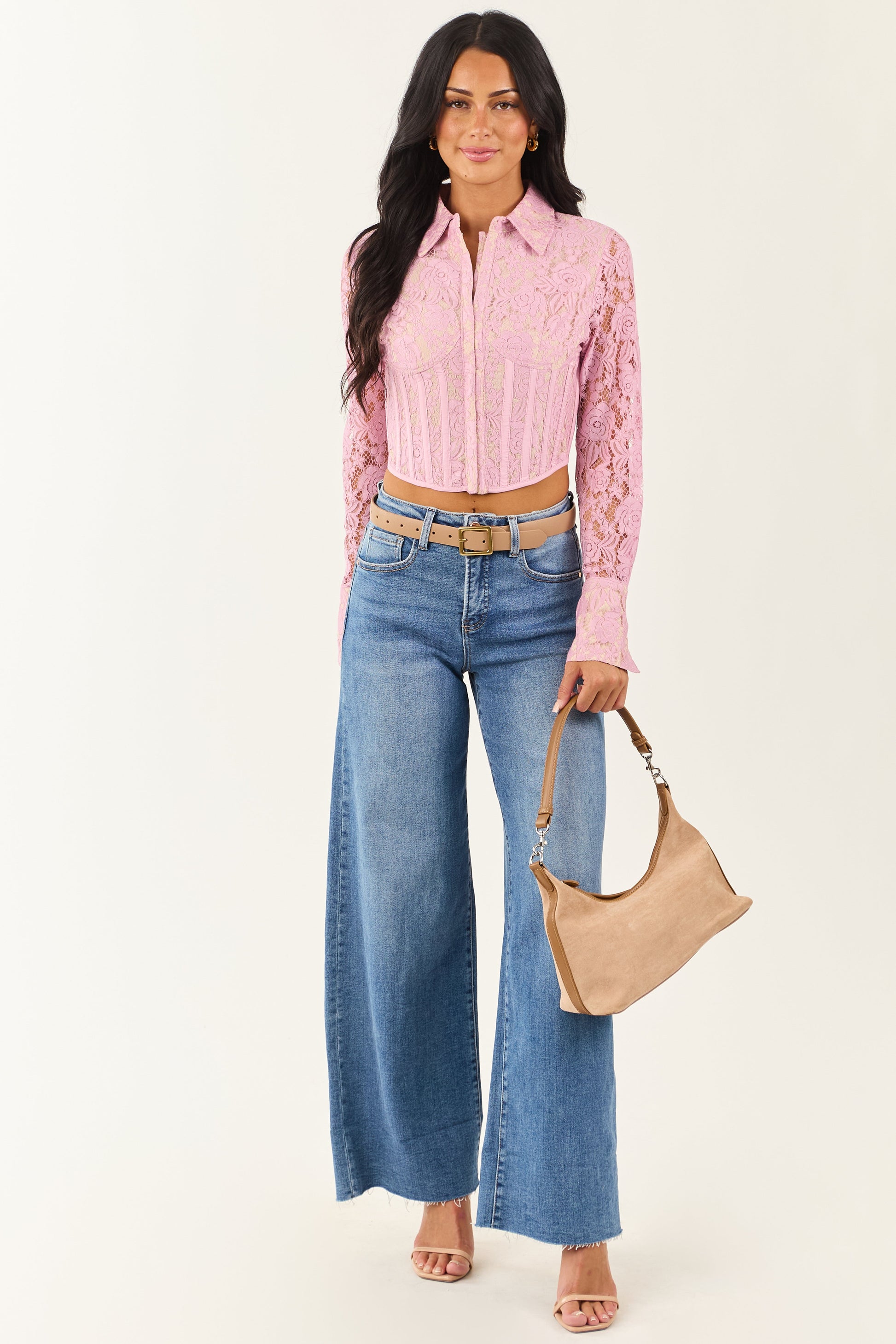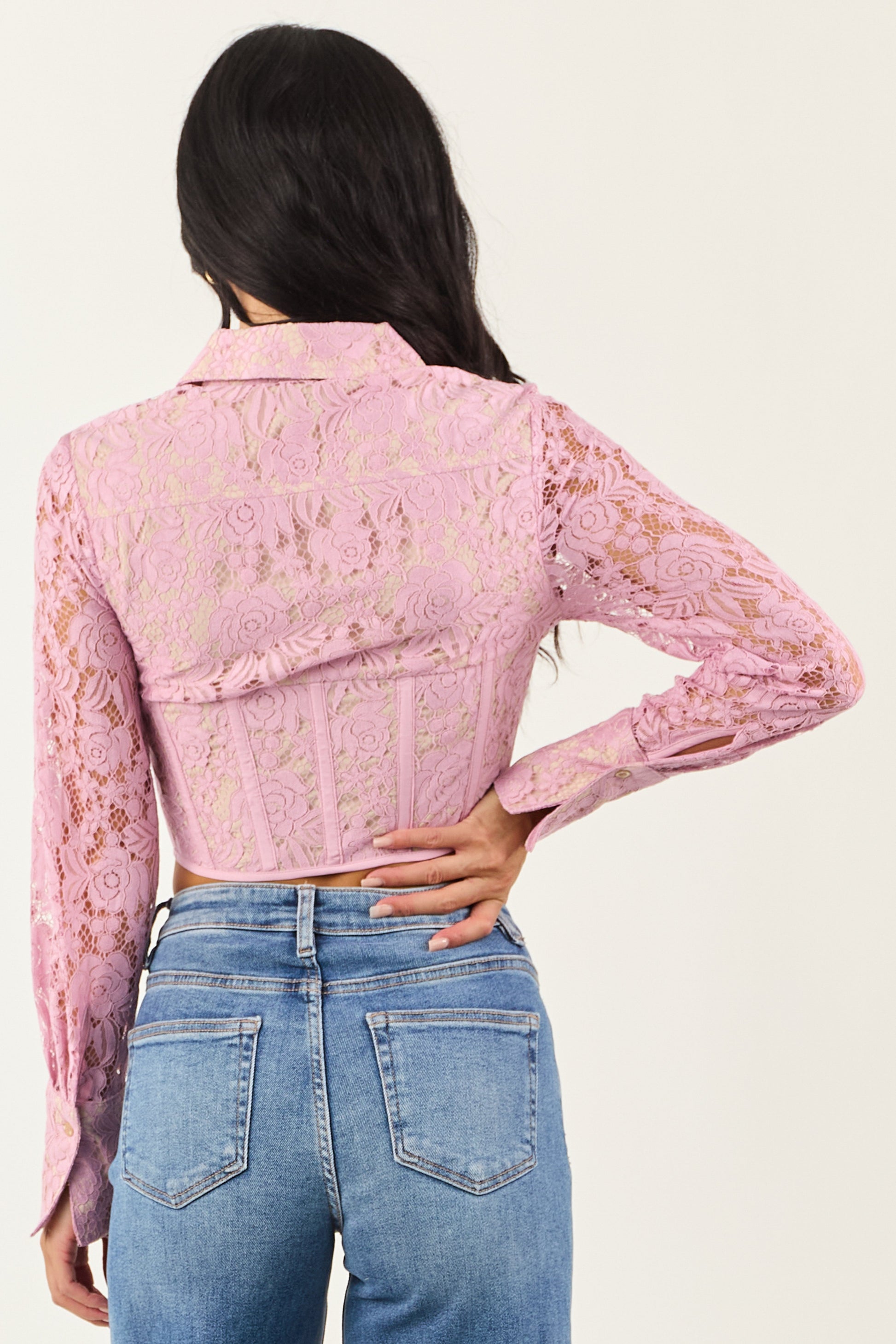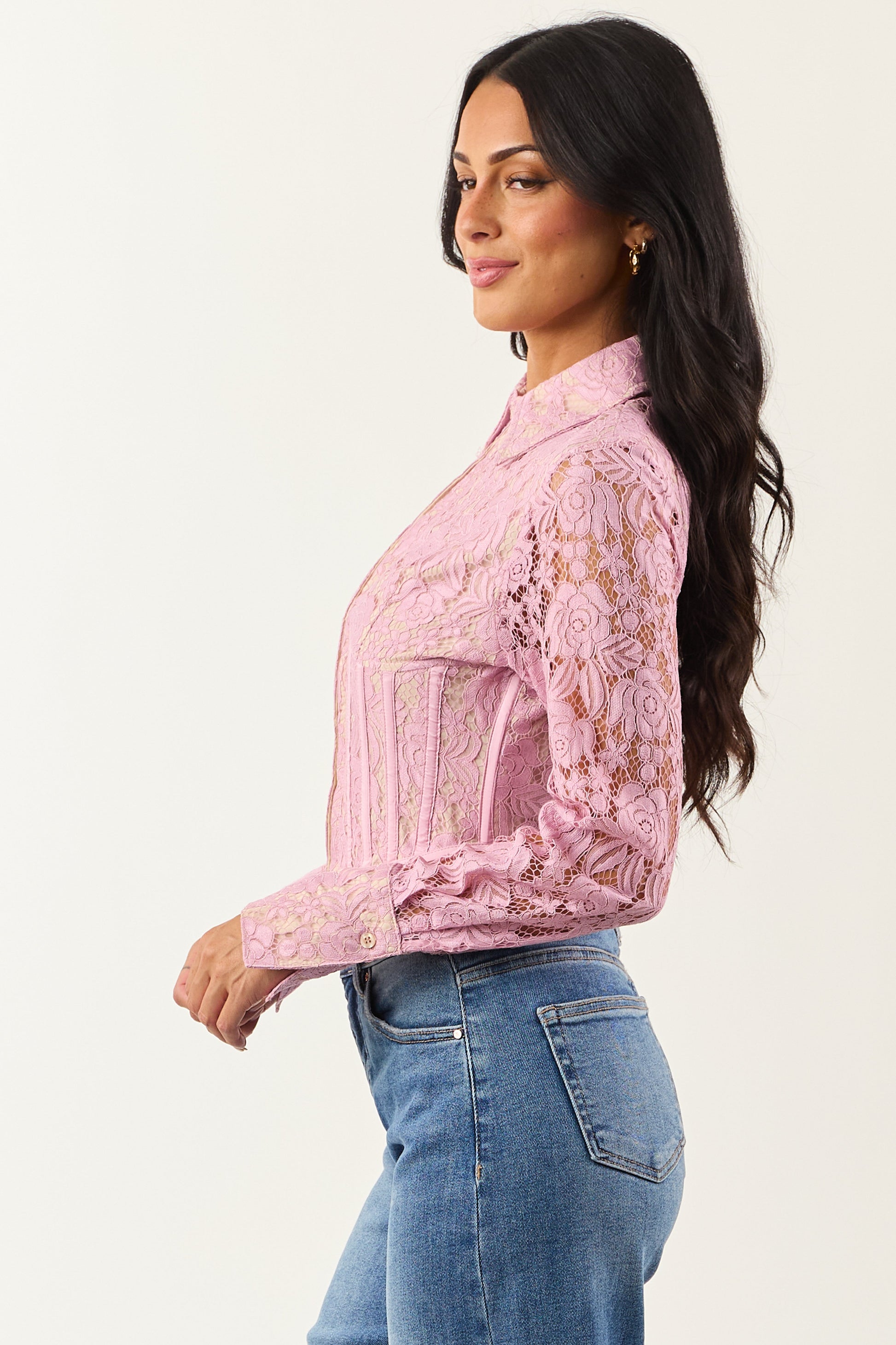Mauve Floral Lace Button Down Corset Long Sleeve...