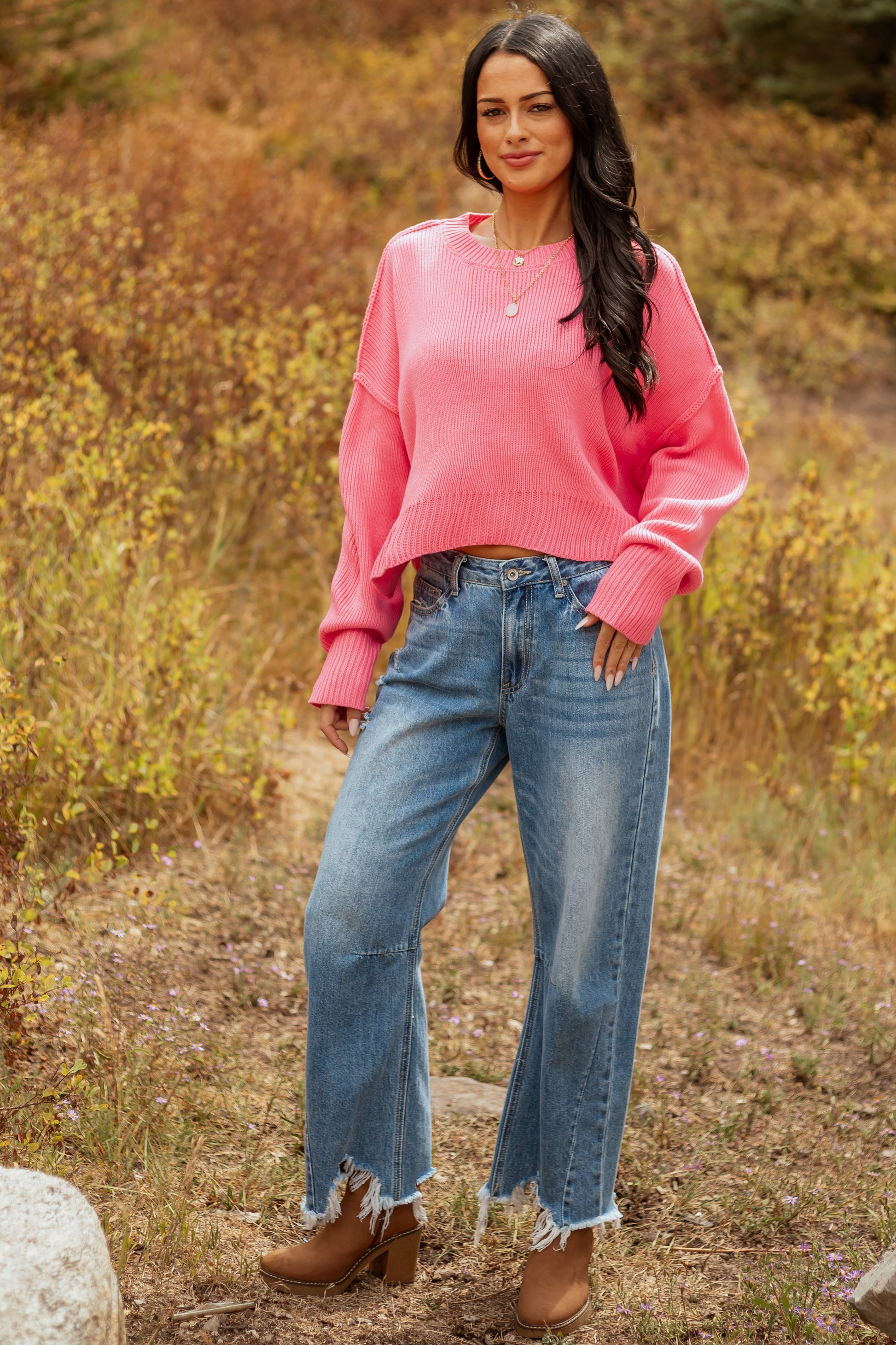 Bubblegum Boxy Drop Shoulder Crop Rib Knit Sweater