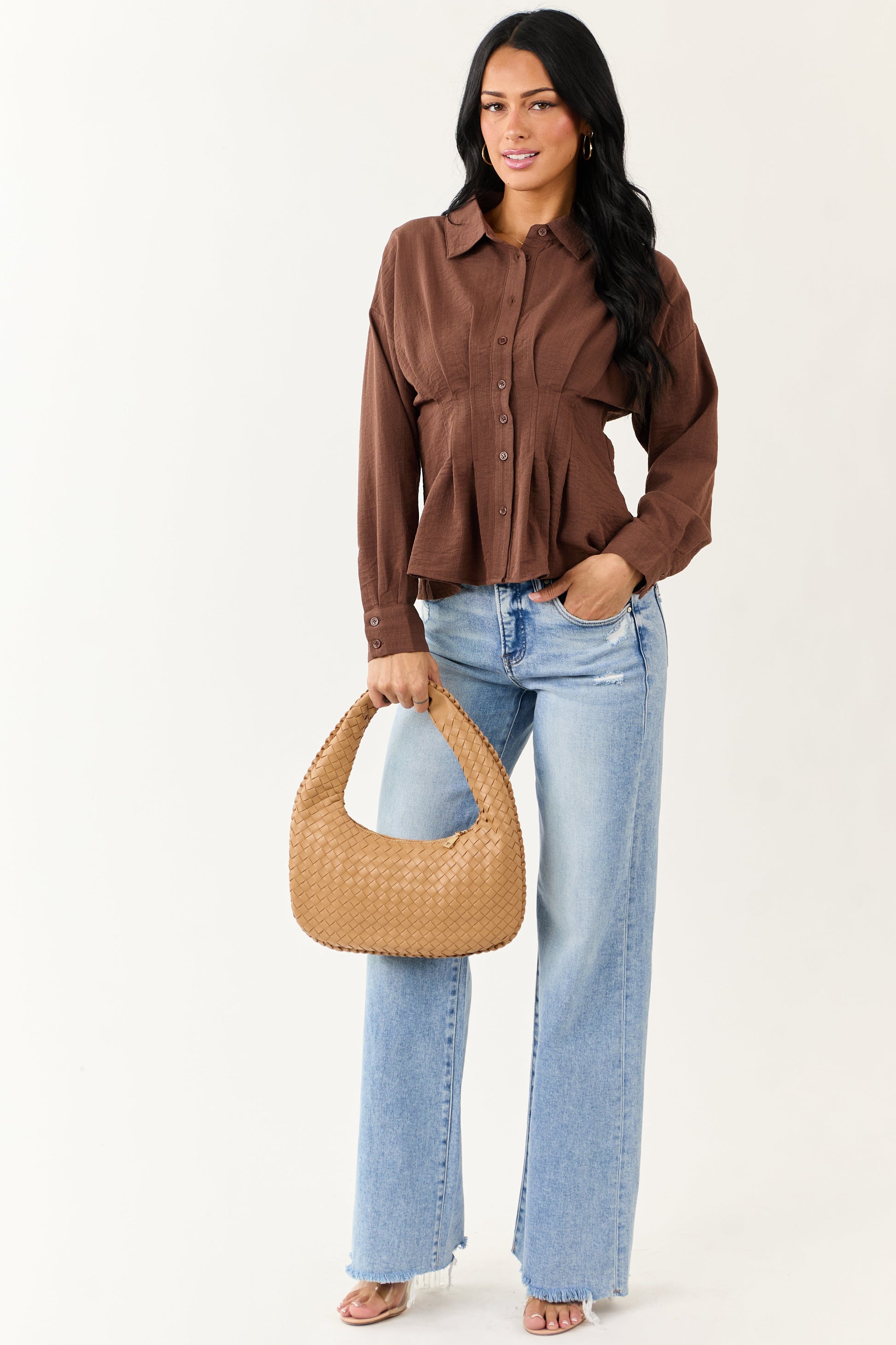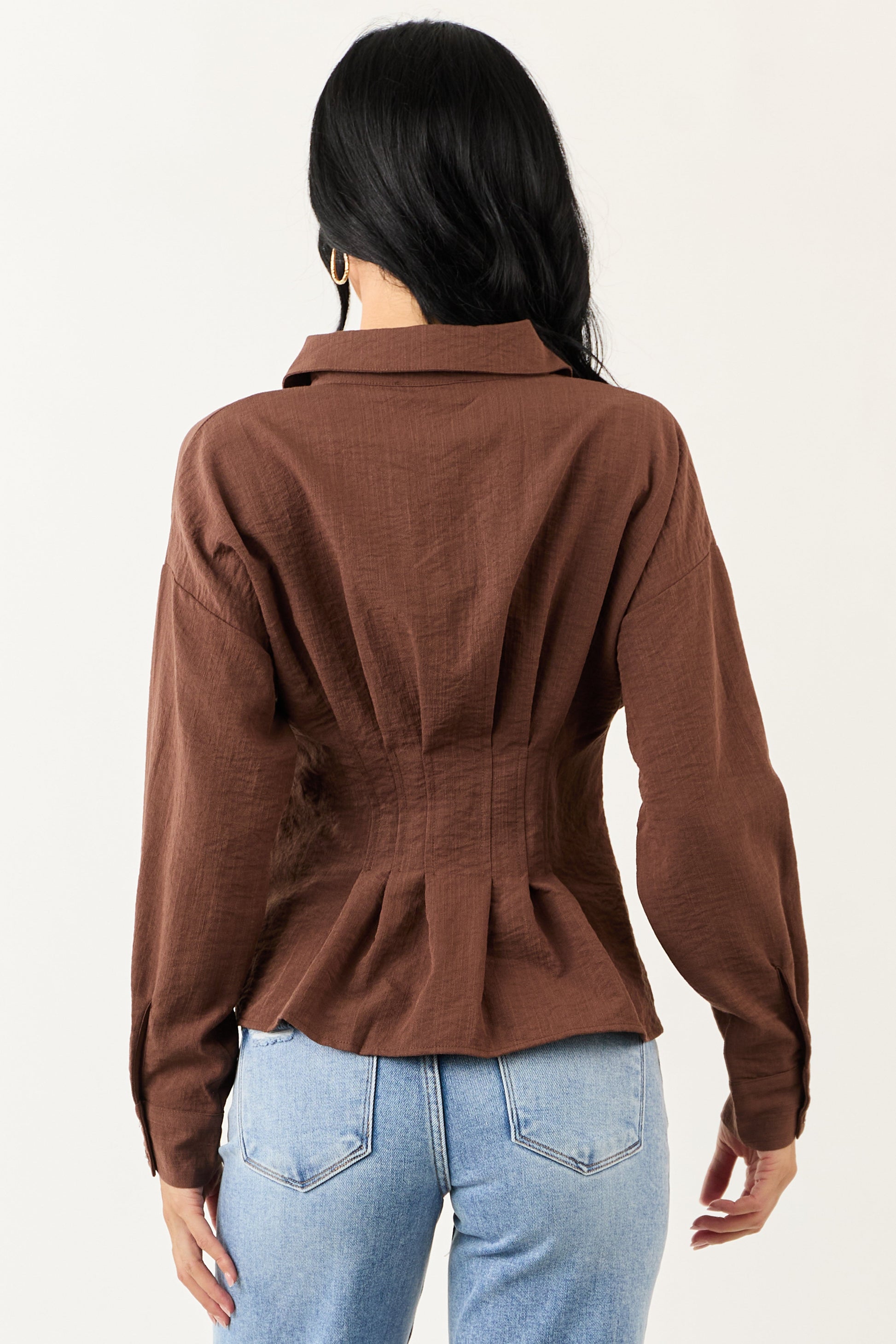Entro Cocoa Button Down Long Sleeve Pleated Top