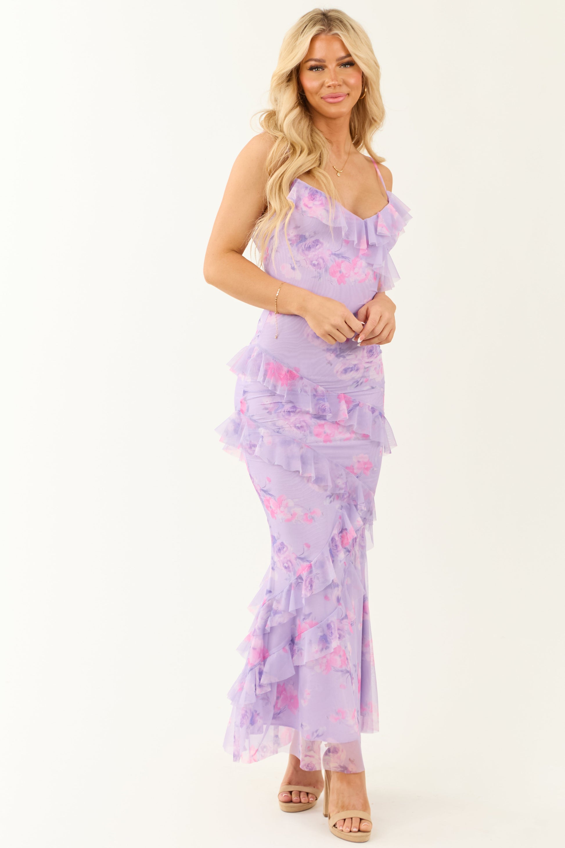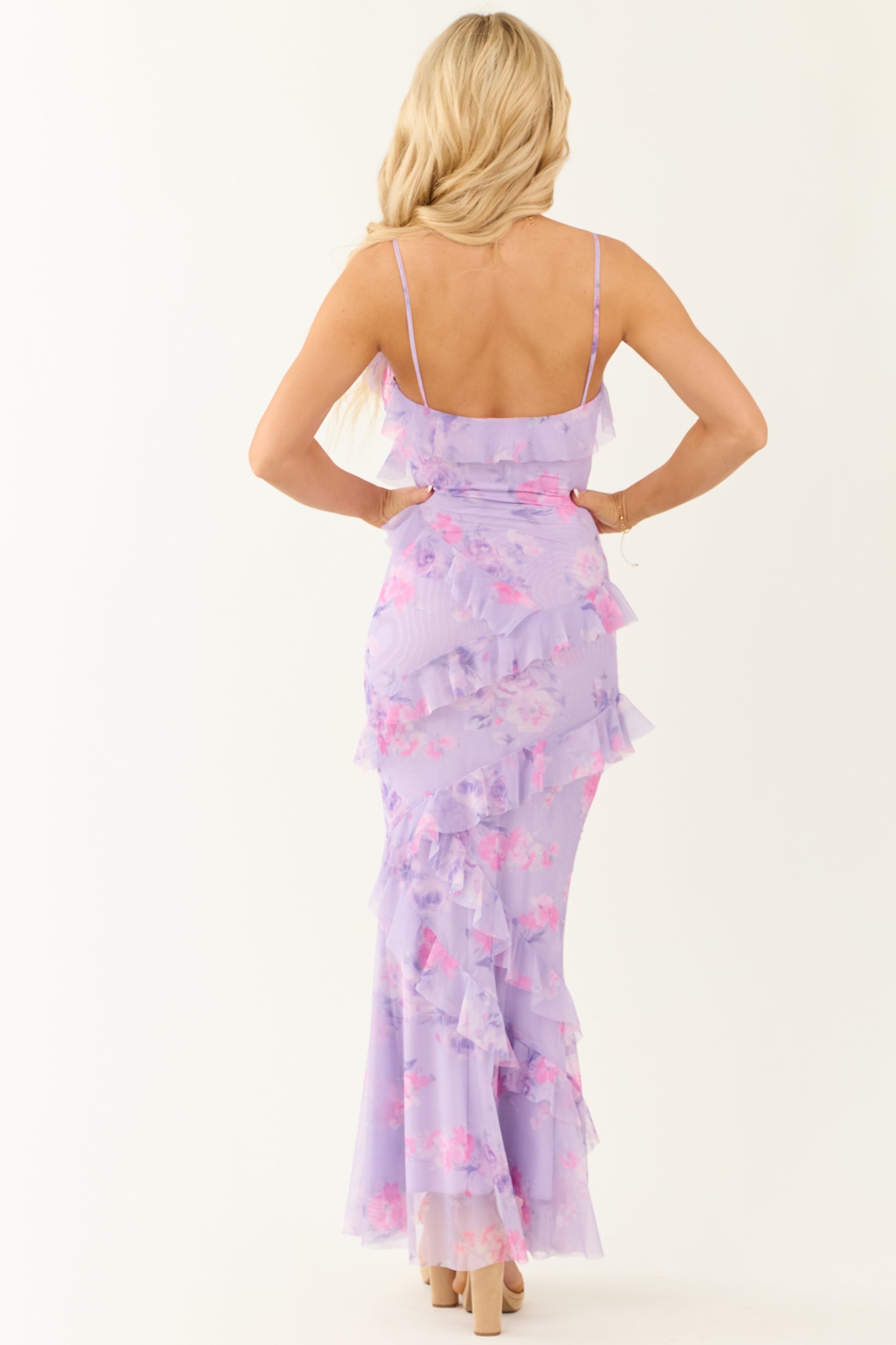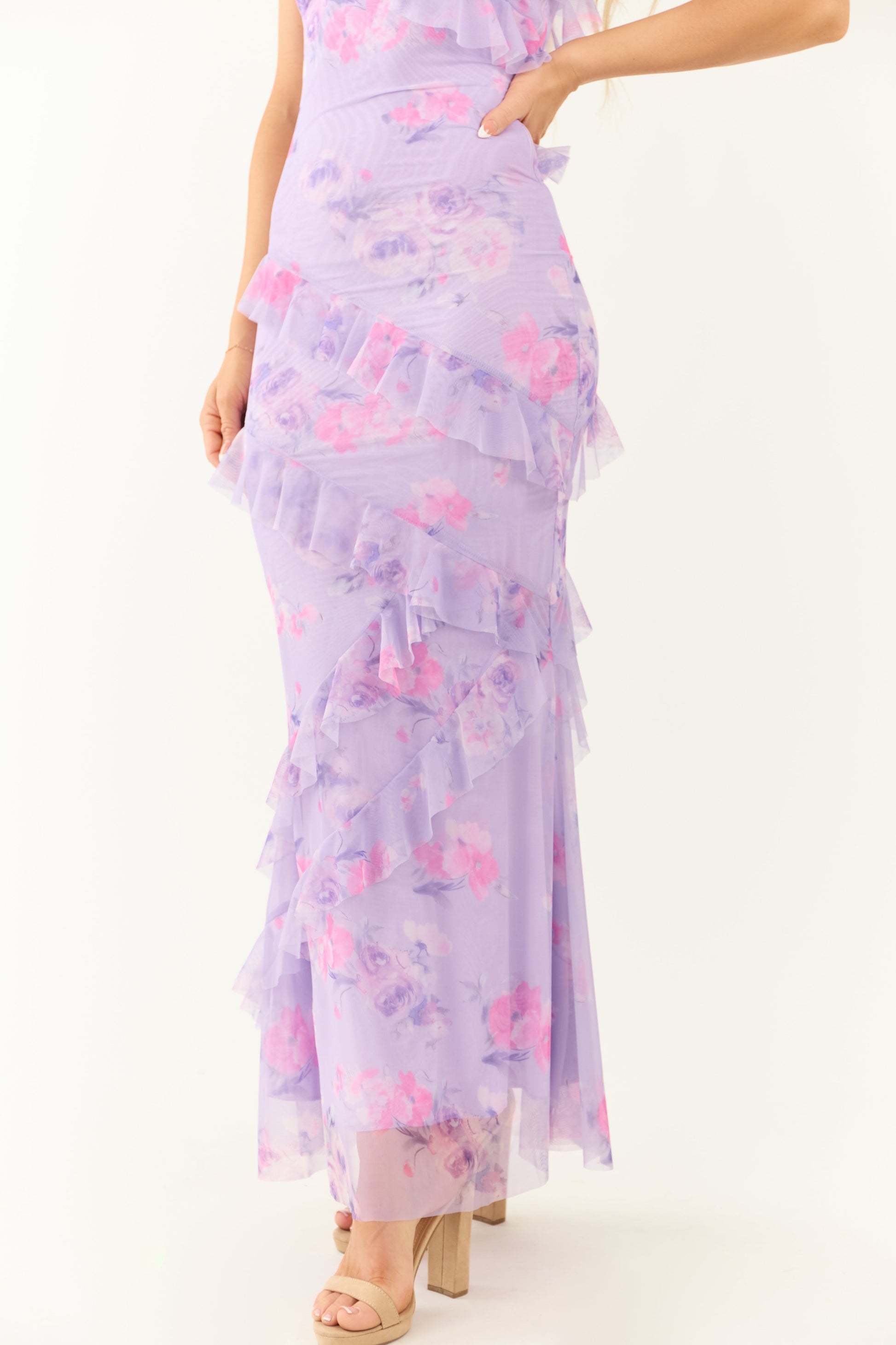 Light Lilac Floral Print Ruffle Mermaid Maxi Dress