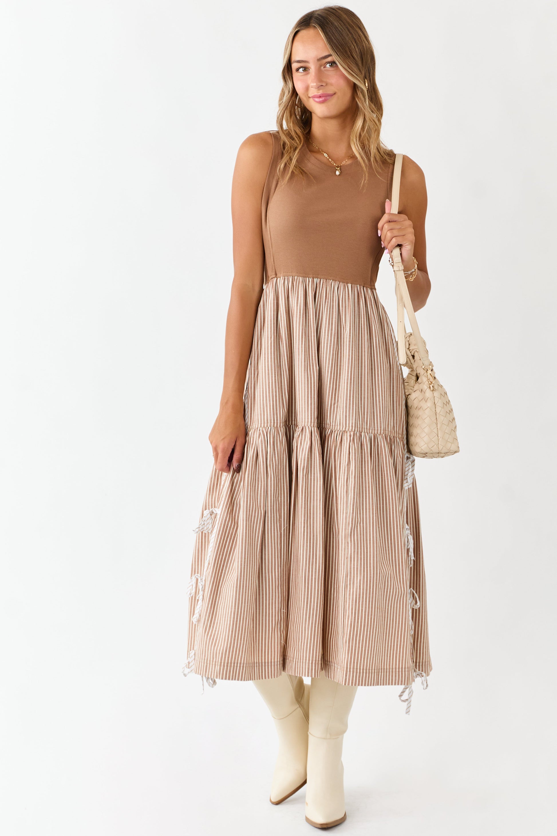 Cognac Ribbed Knit Bodice Contrast Striped Midi Dress