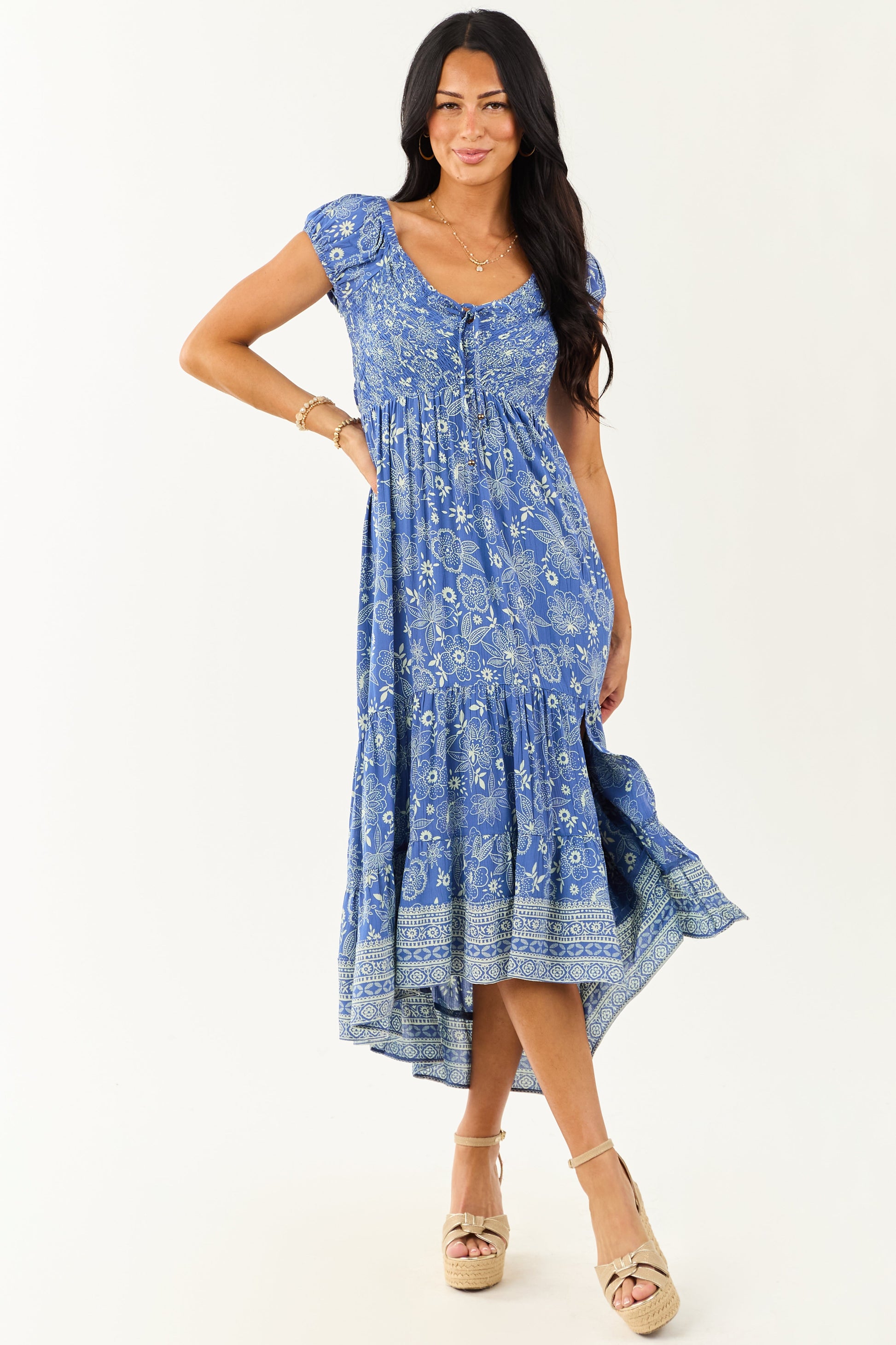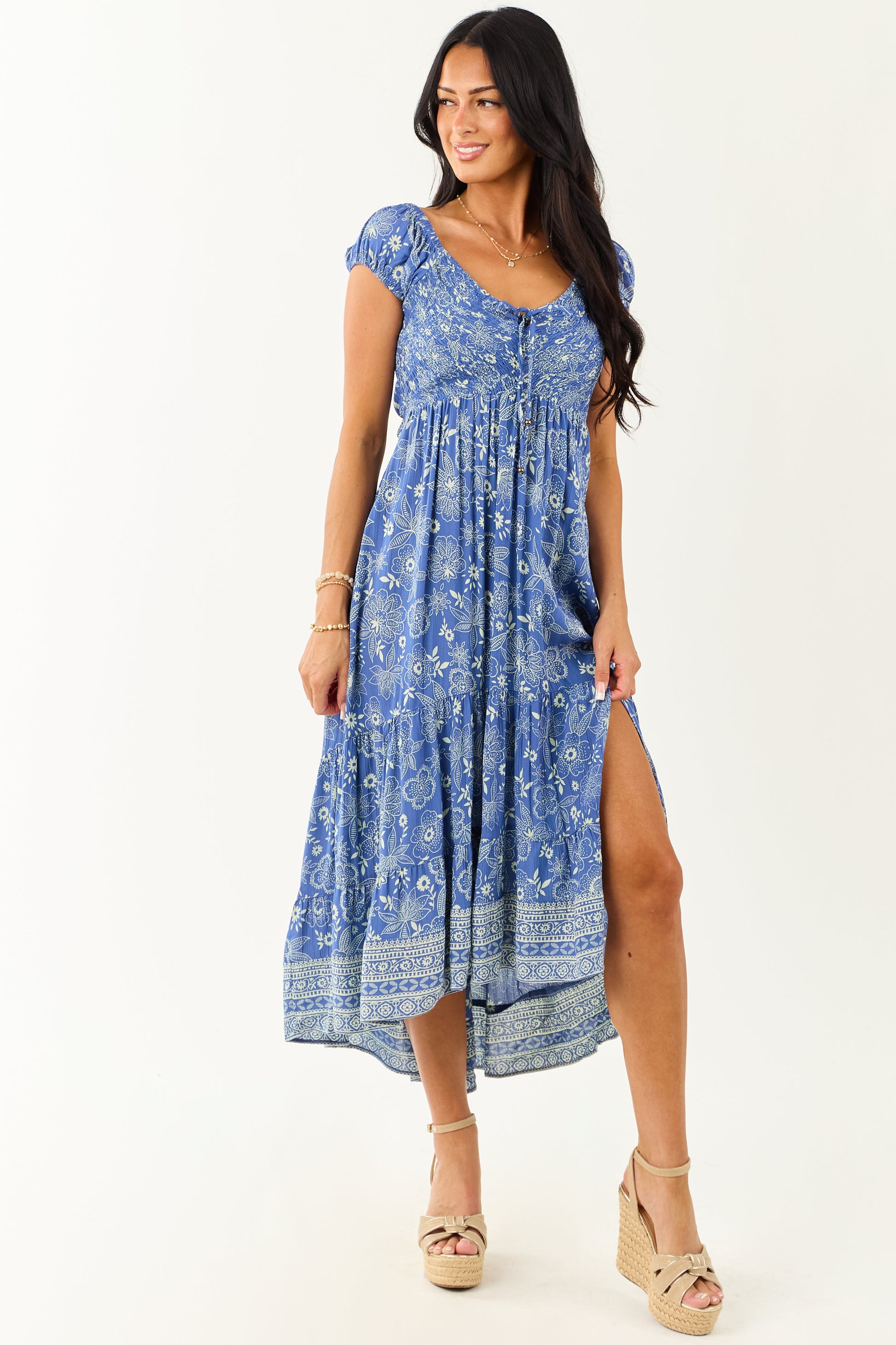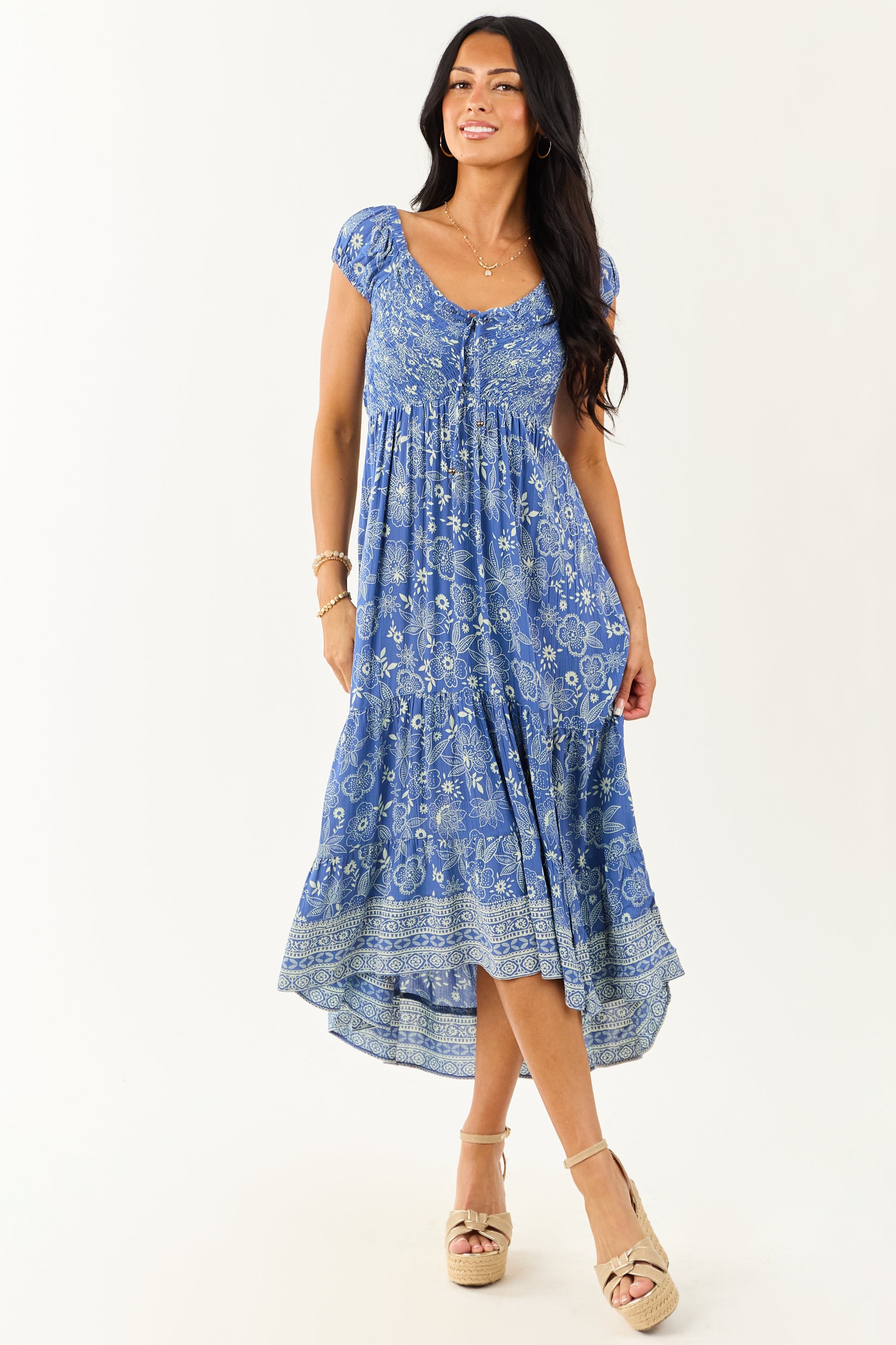 Dusty Blue Smocked Bust Floral Cap Sleeve Midi Dress