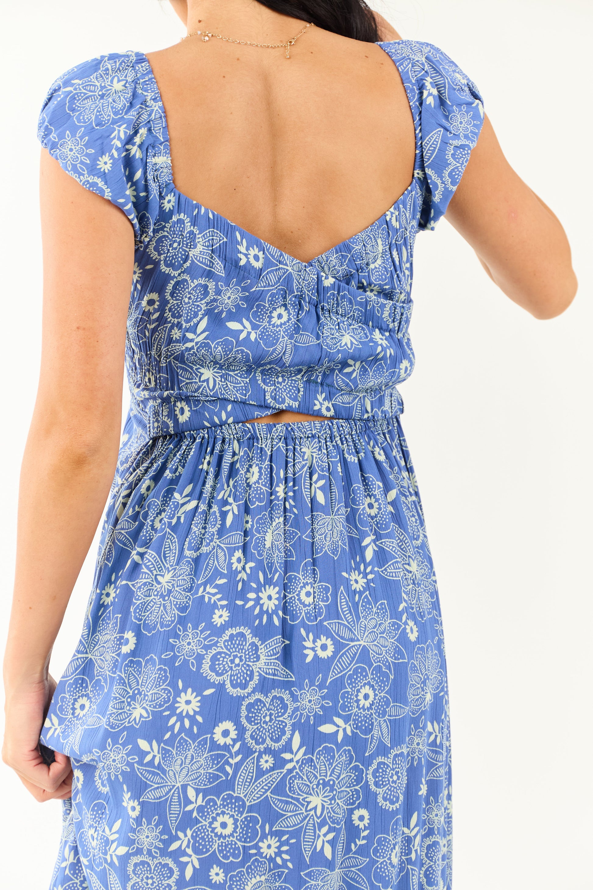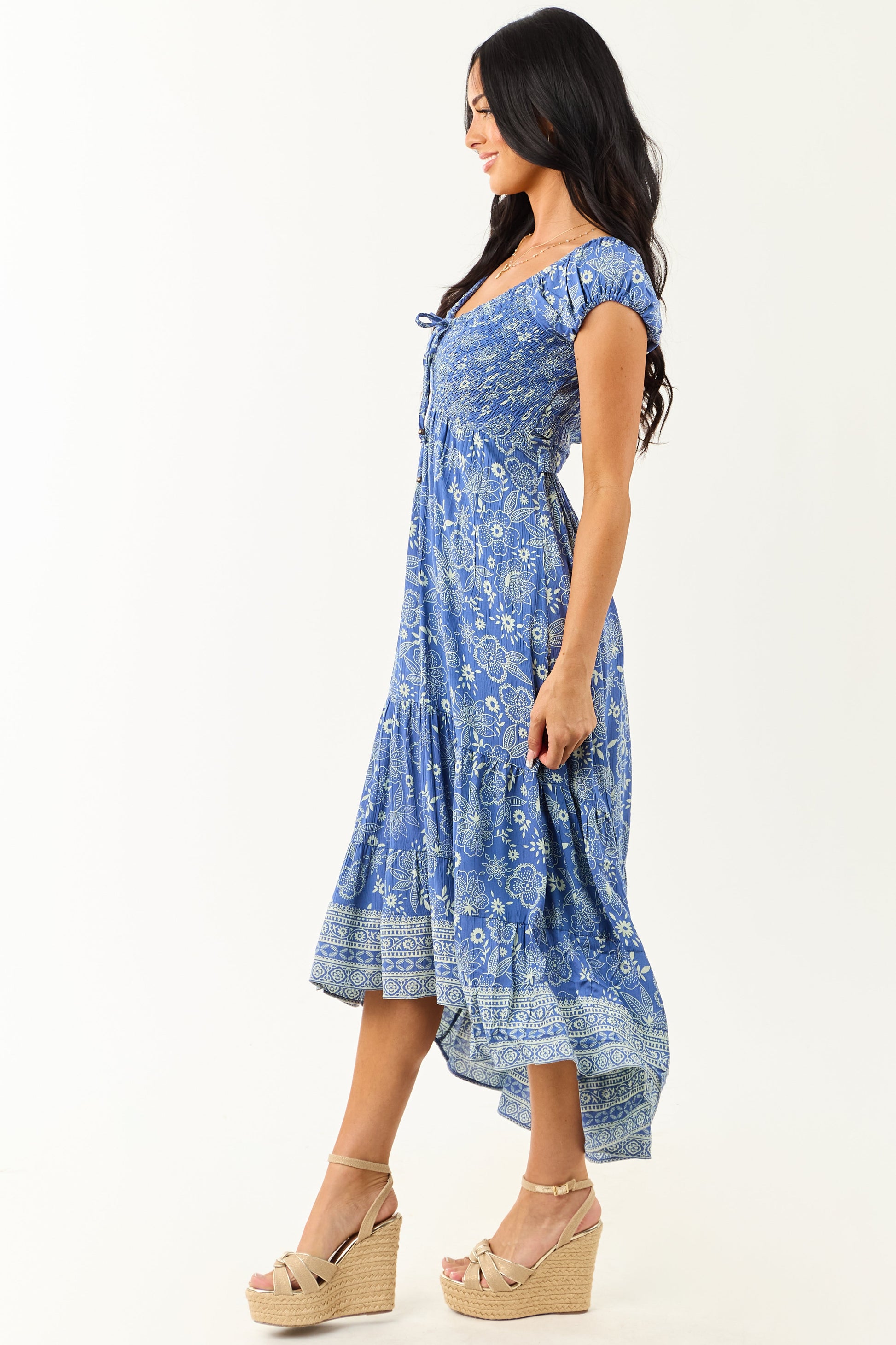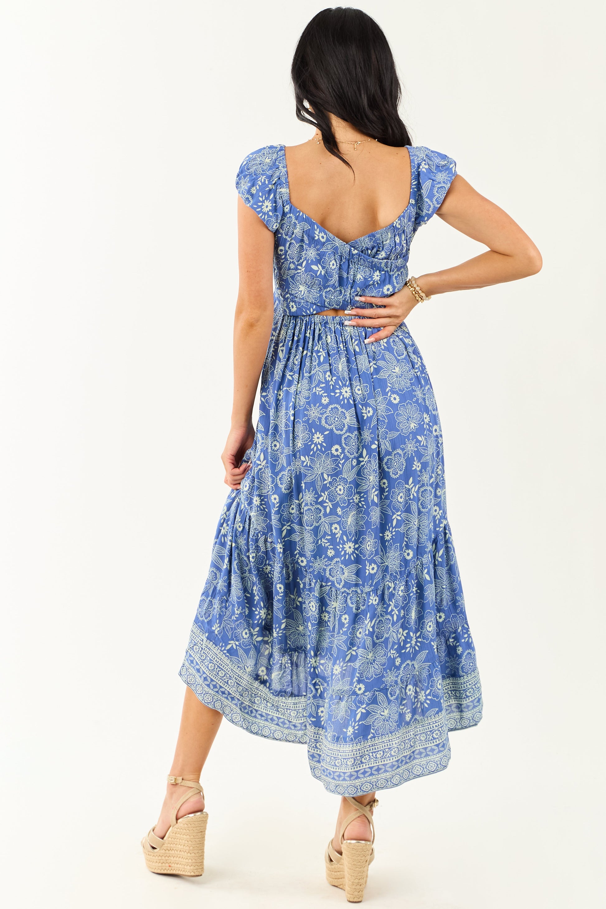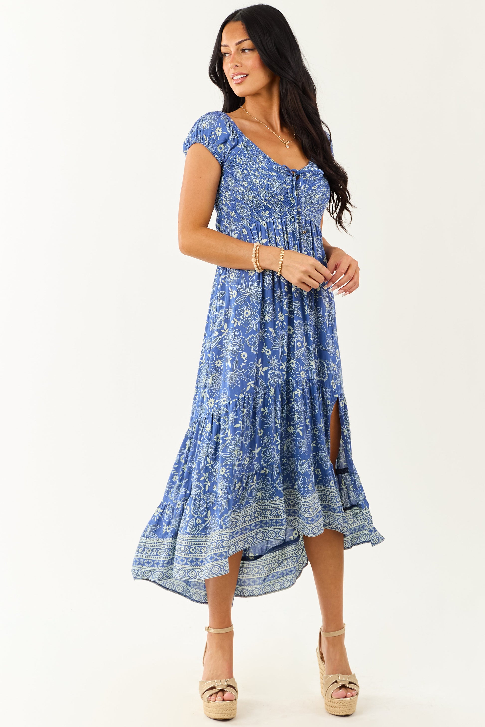Dusty Blue Smocked Bust Floral Cap Sleeve Midi Dress