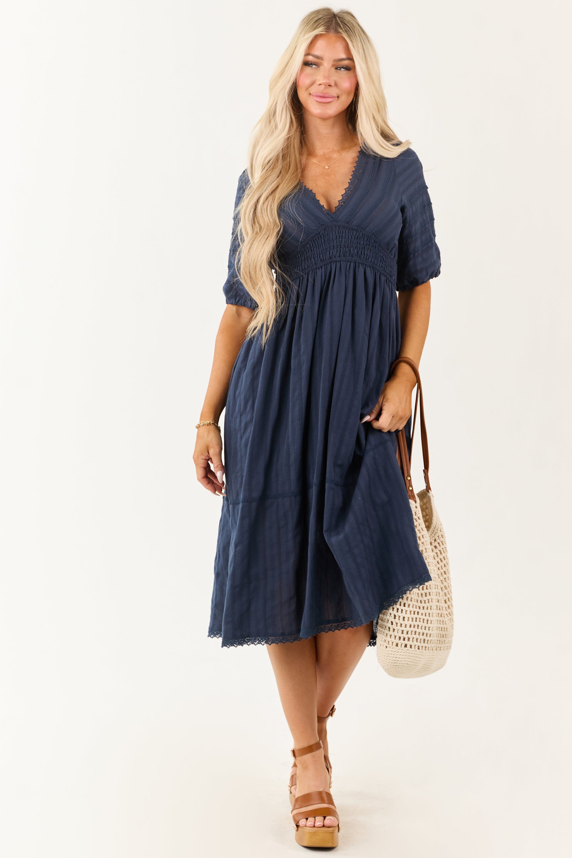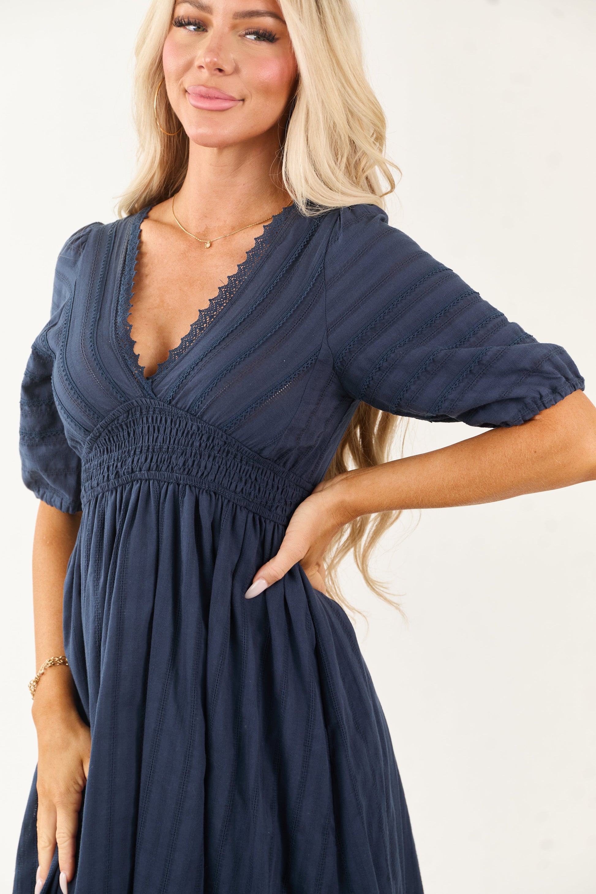 Navy Half Puff Sleeve Lace Trim Cotton Midi...