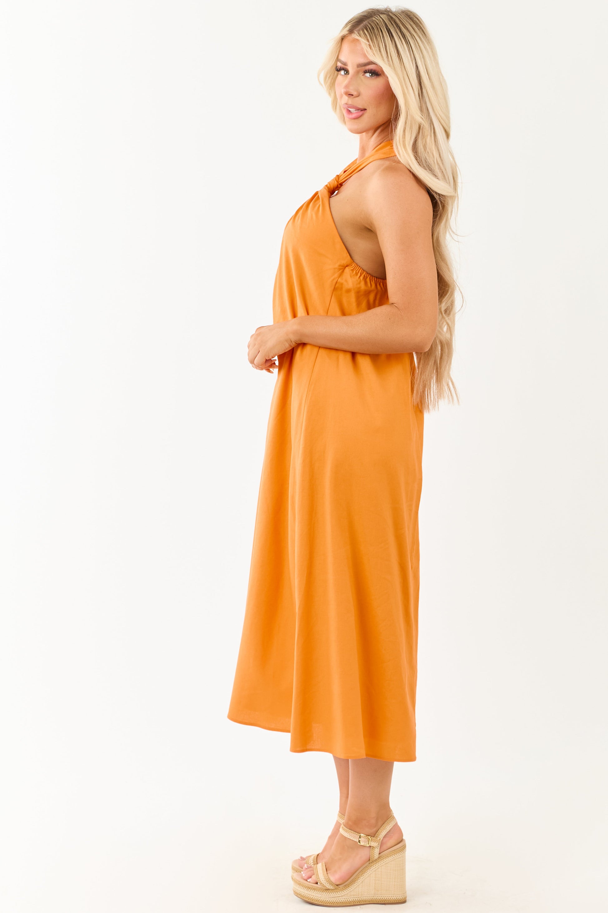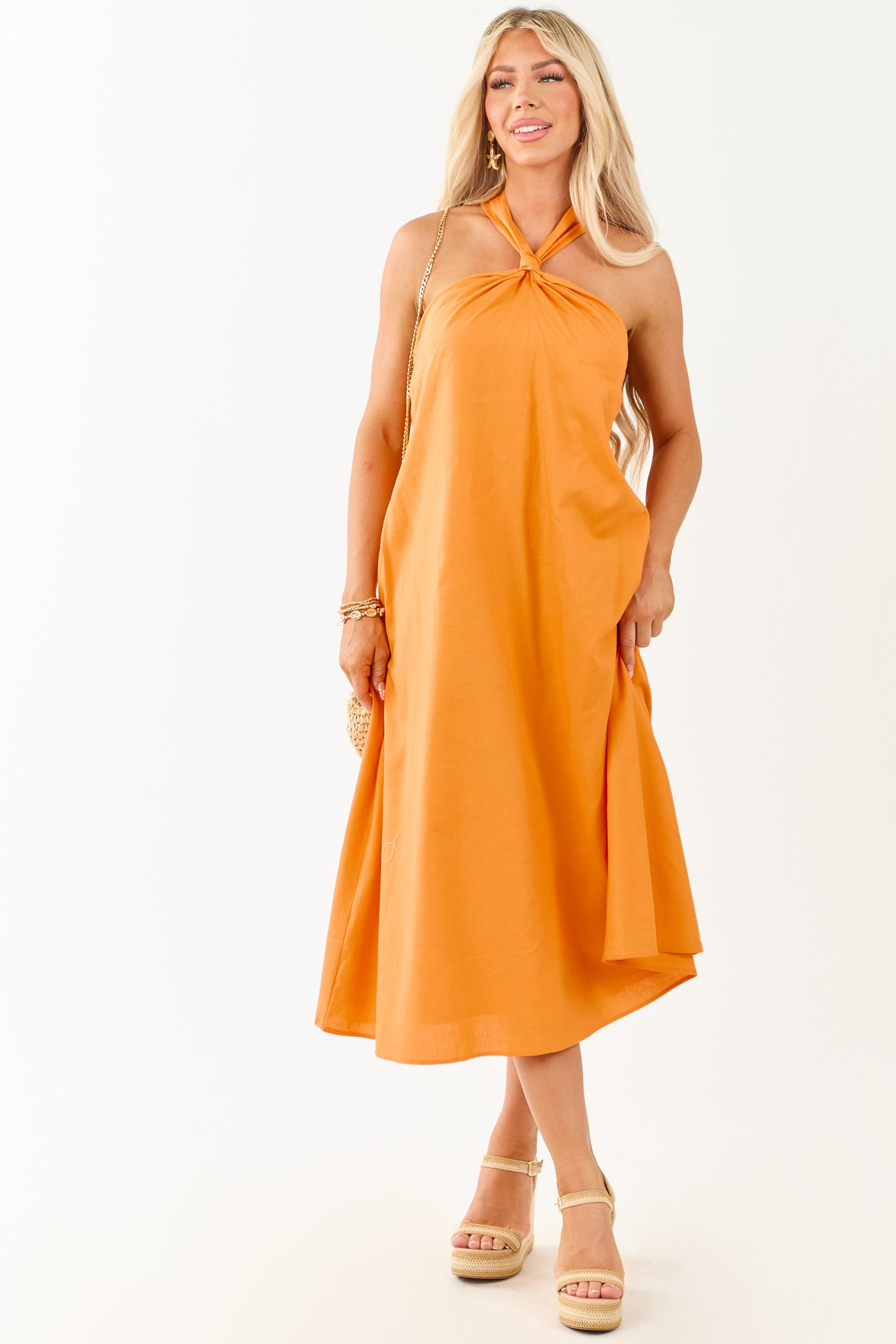 Tangerine Halter Knot Tie Linen Blend Midi Dress