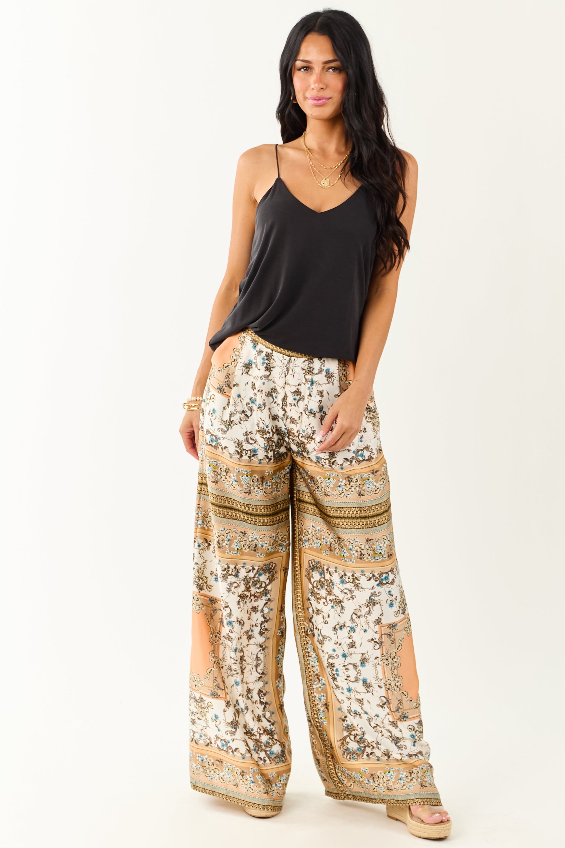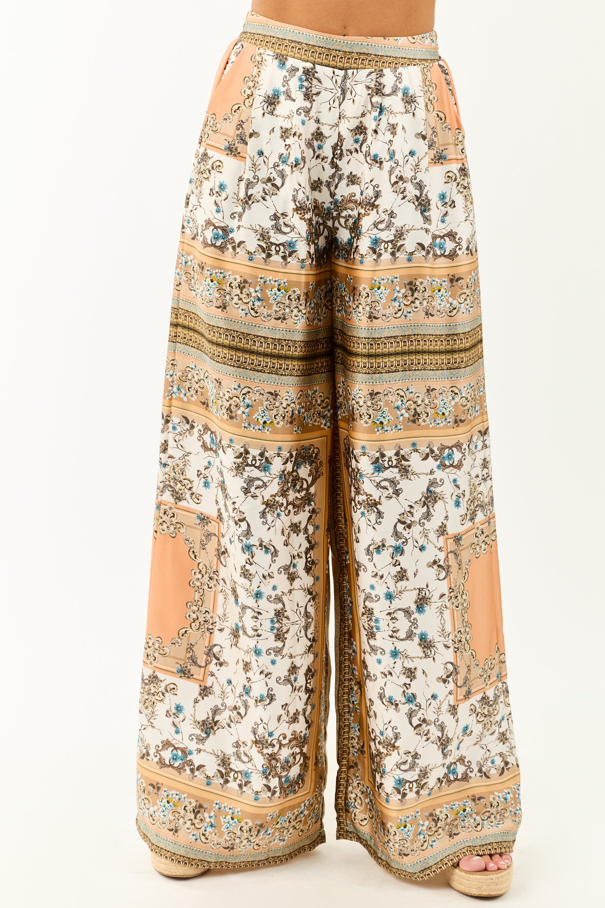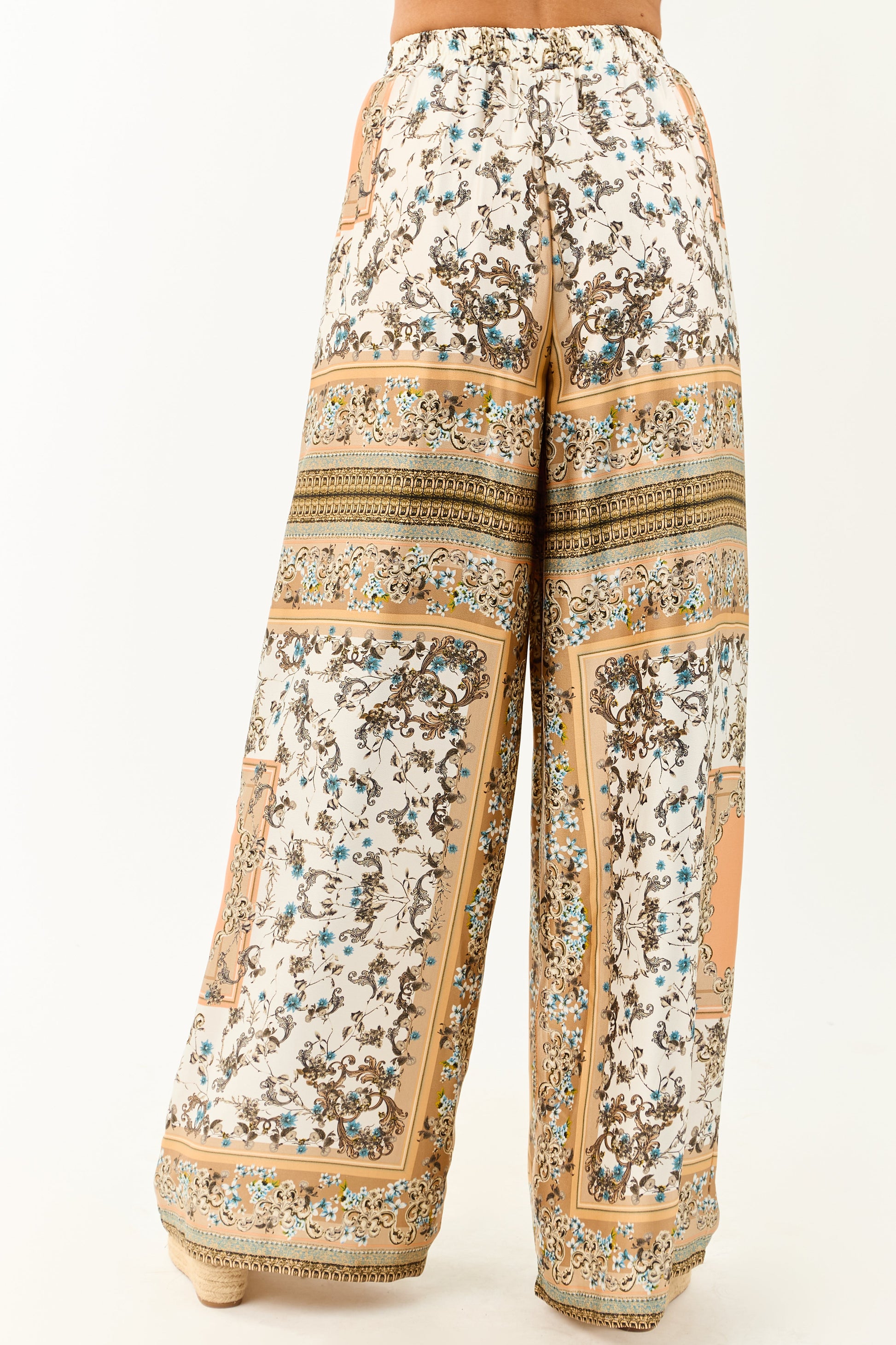 Ivory Scarf Print Satin Flowy Wide Leg Pants