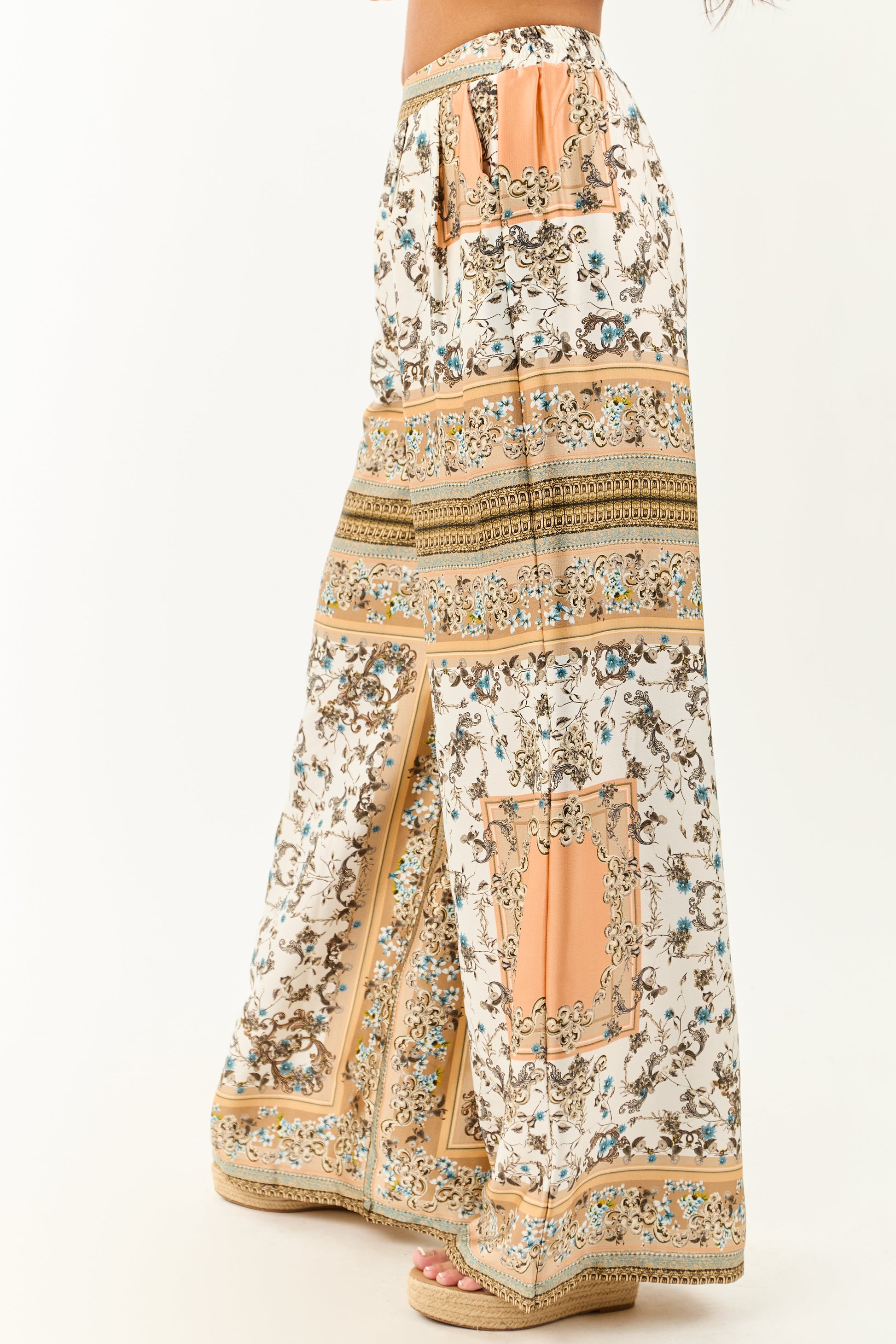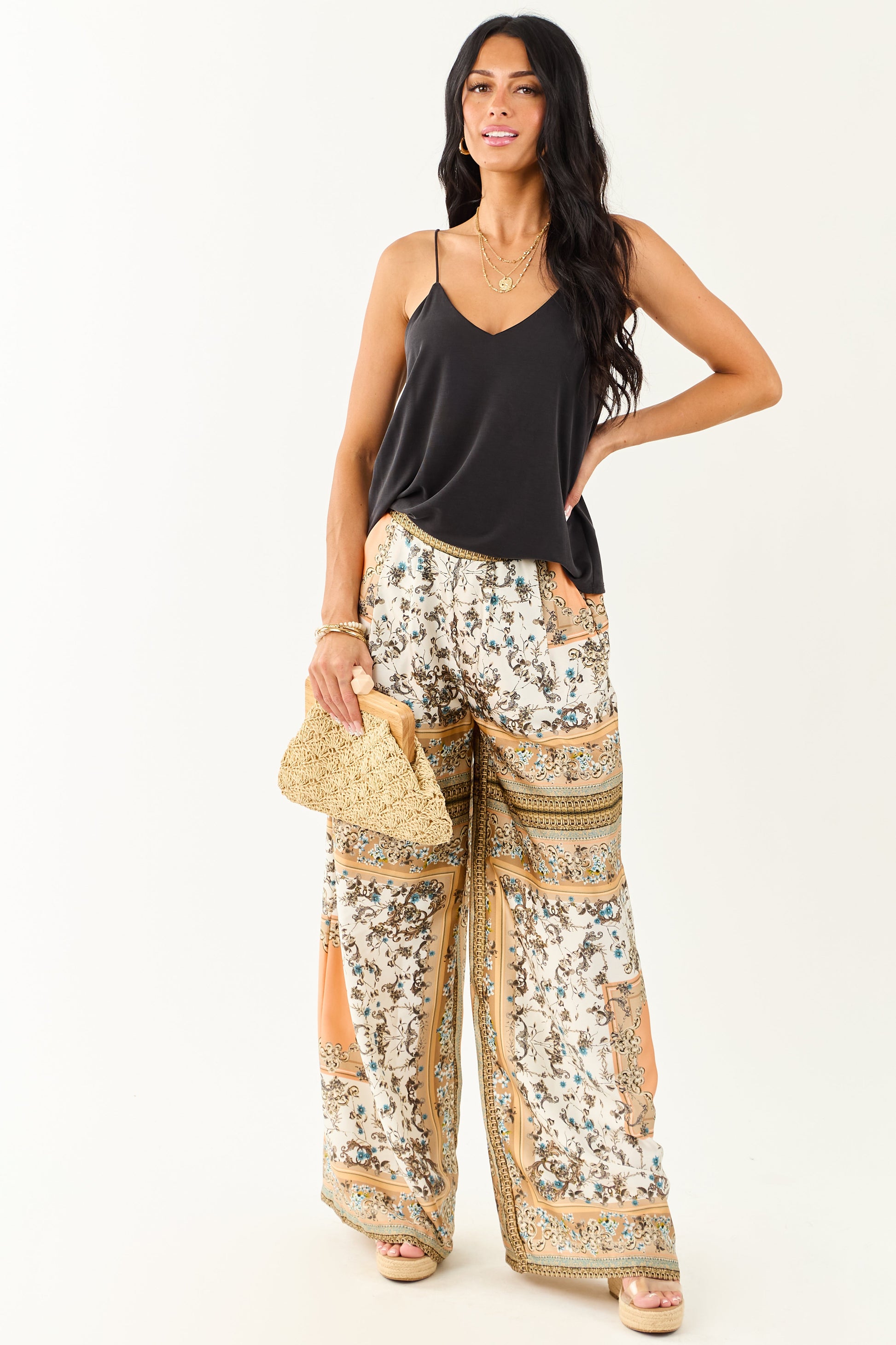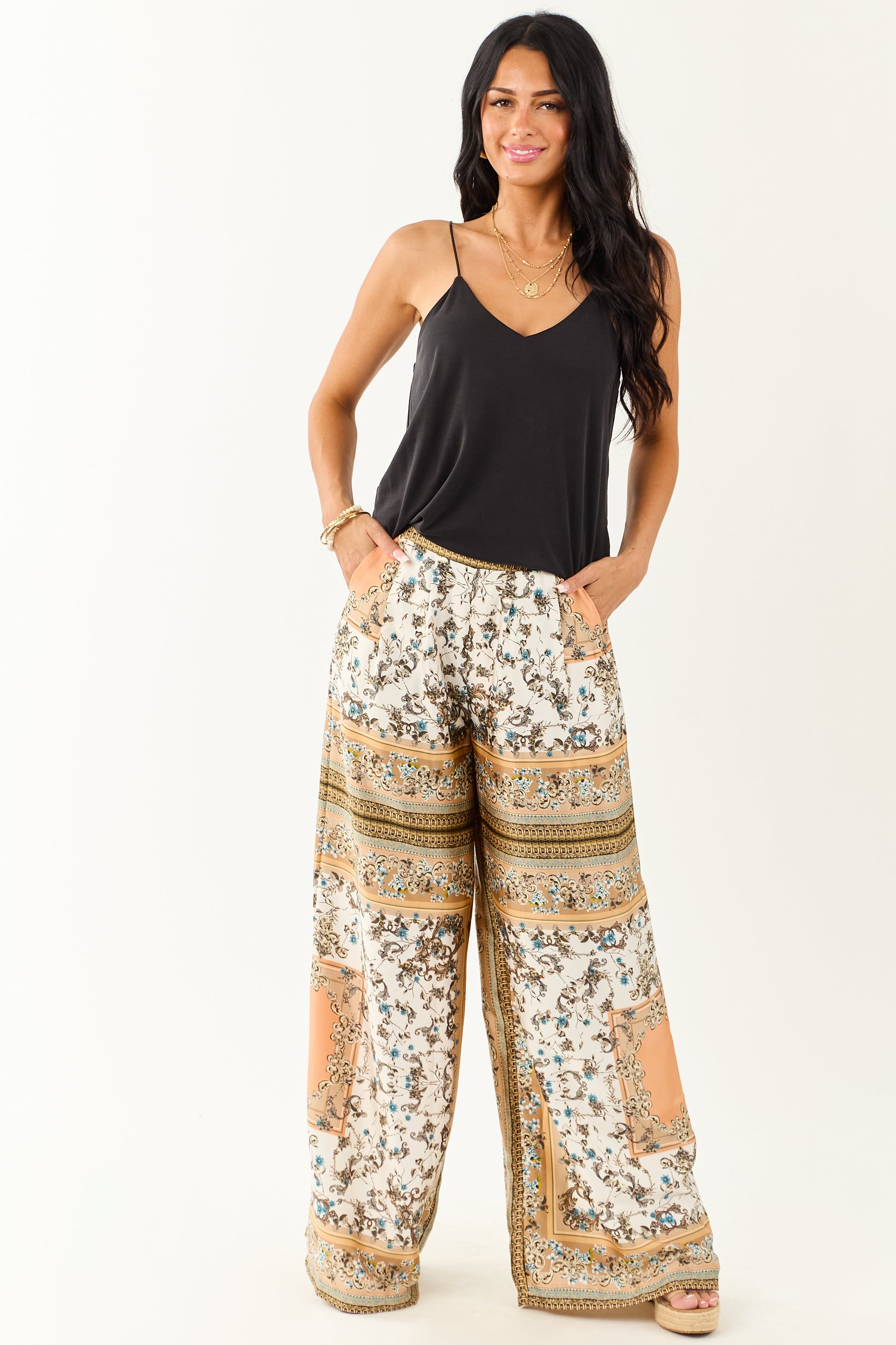 Ivory Scarf Print Satin Flowy Wide Leg Pants