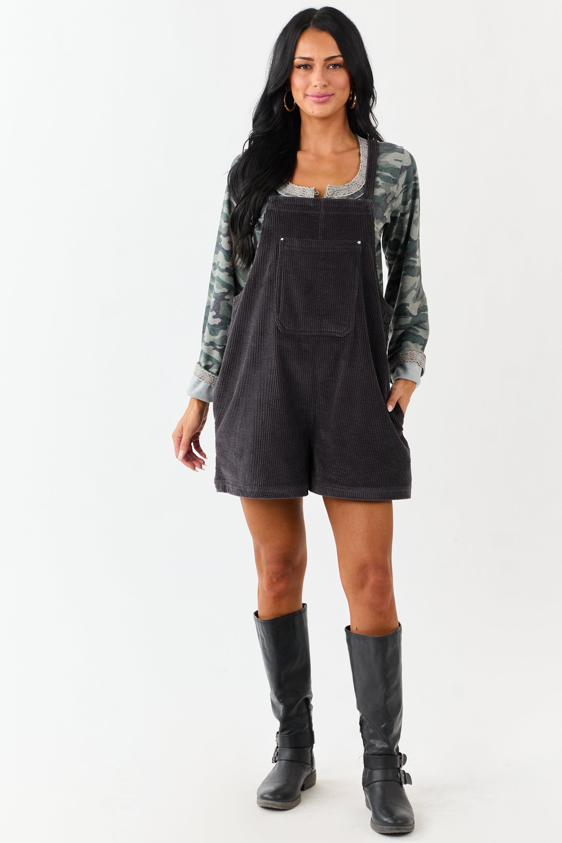 Charcoal Corduroy Relaxed Overalls Style Romper