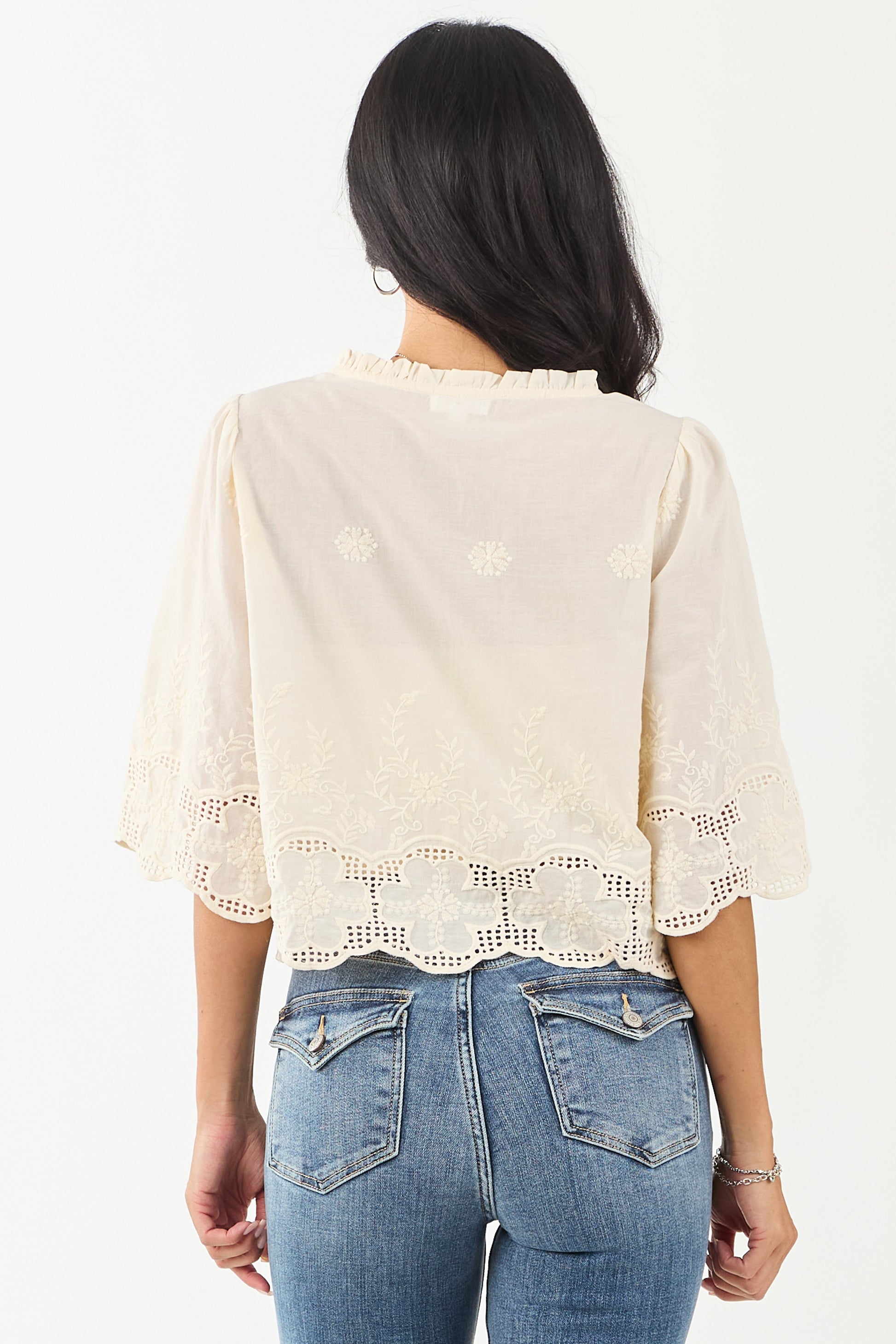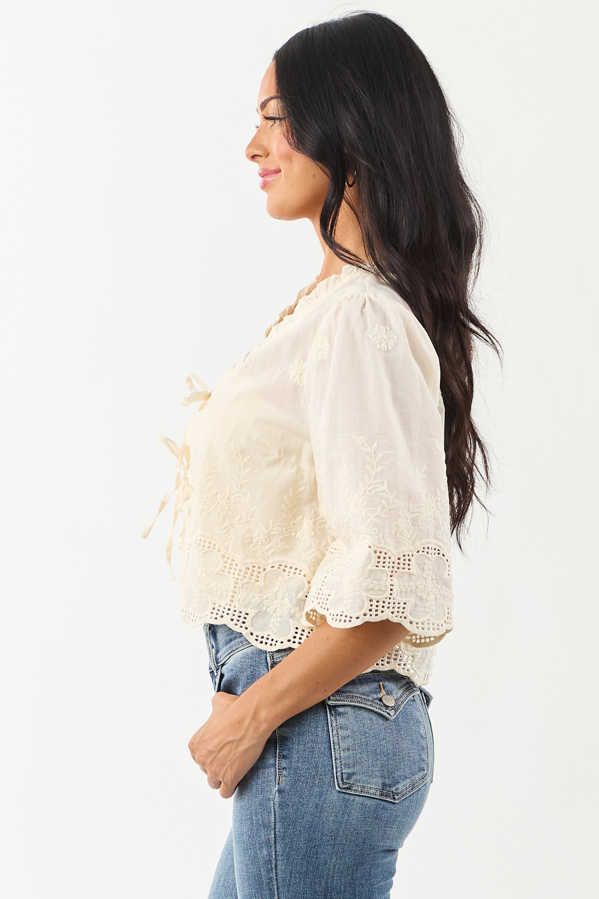Cream Floral Embroidery Tie Front Cotton Blouse