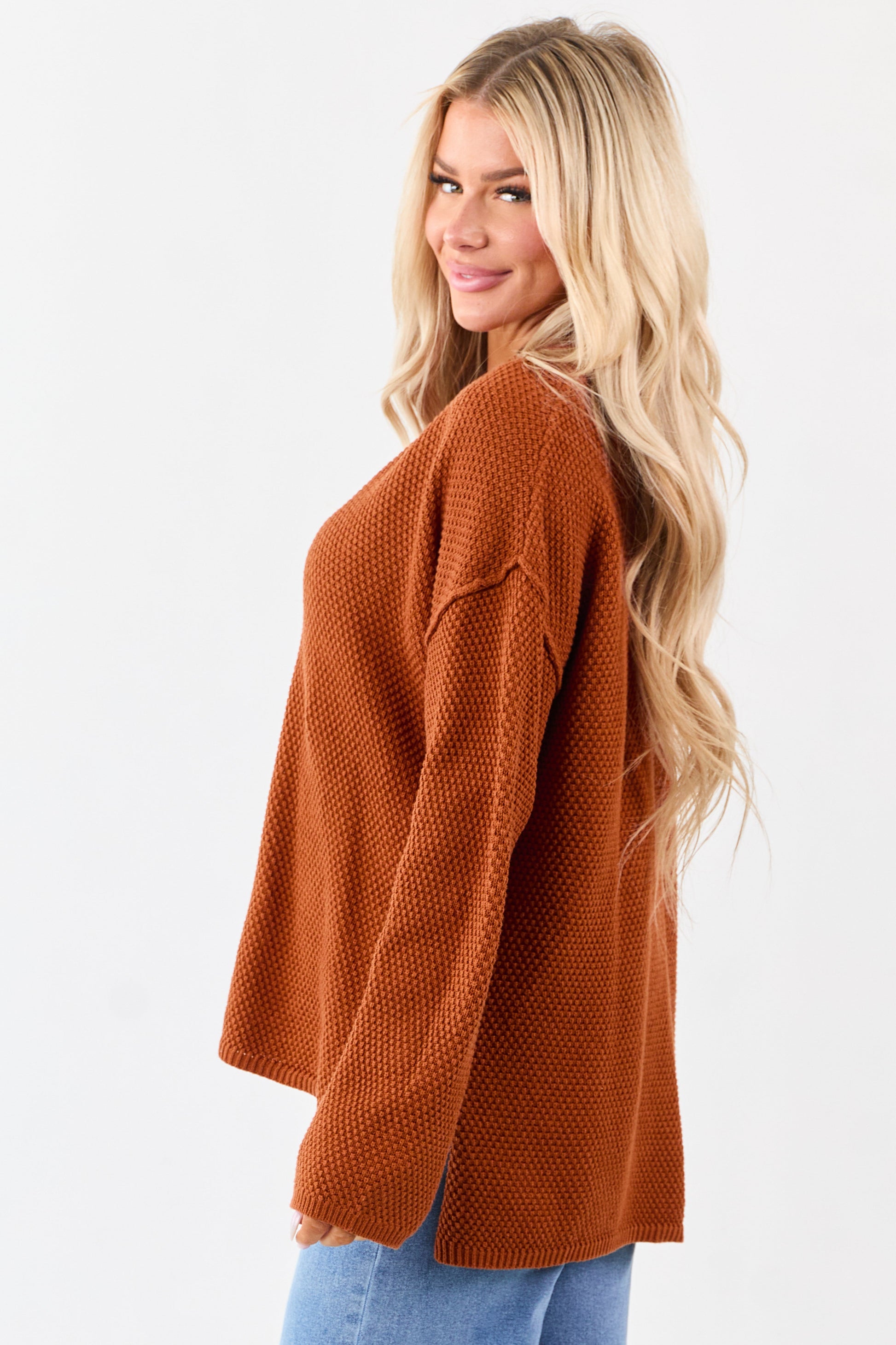 • Perfect for relaxed fall days with all the perfect pumpkin spice vibes!  This dropped-shoulder oversized sweater top features a shaker stitch knit texture, henley neckline, wooden buttons, and high-low hem for easy styling.