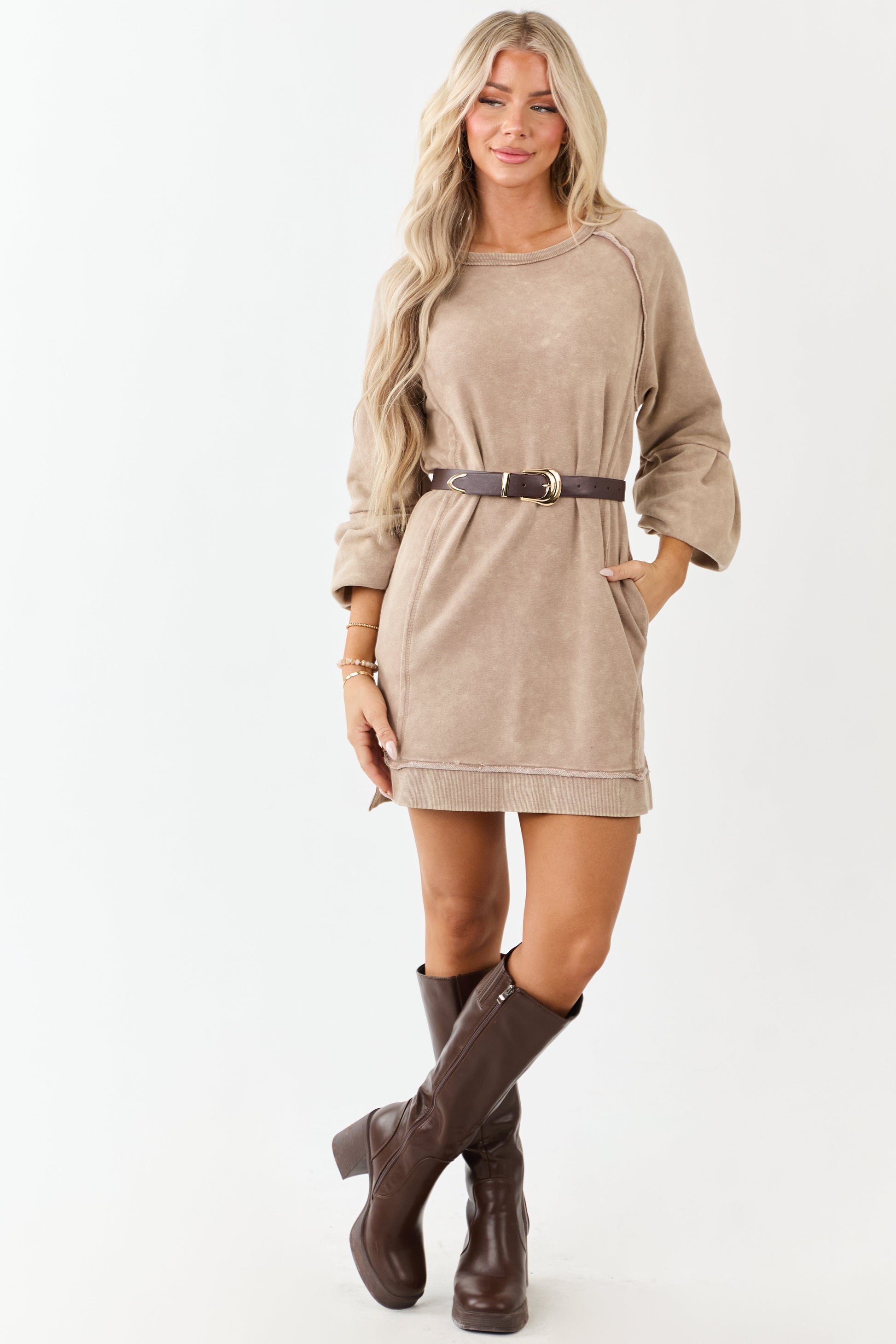 Coffee Mineral Wash Knit Raglan Sleeve Mini Dress