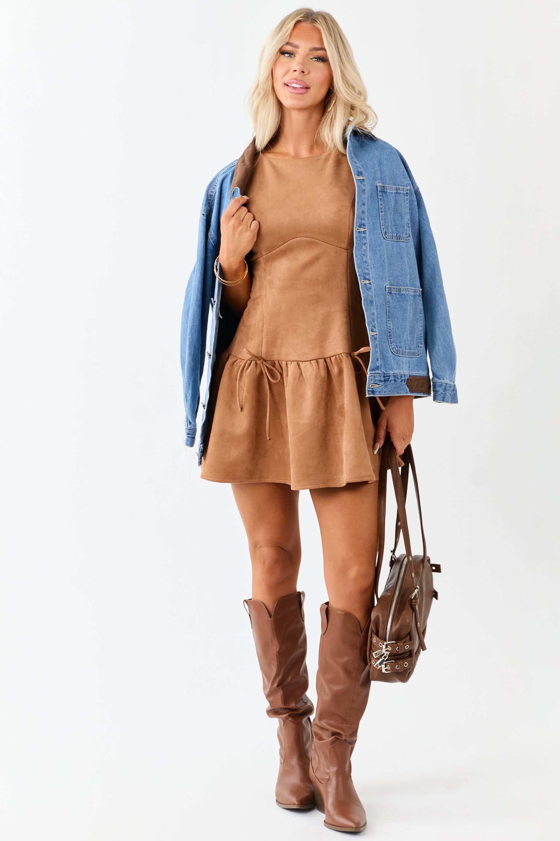 Cognac Faux Suede Drop Waist Ruffle Hem Mini Dress