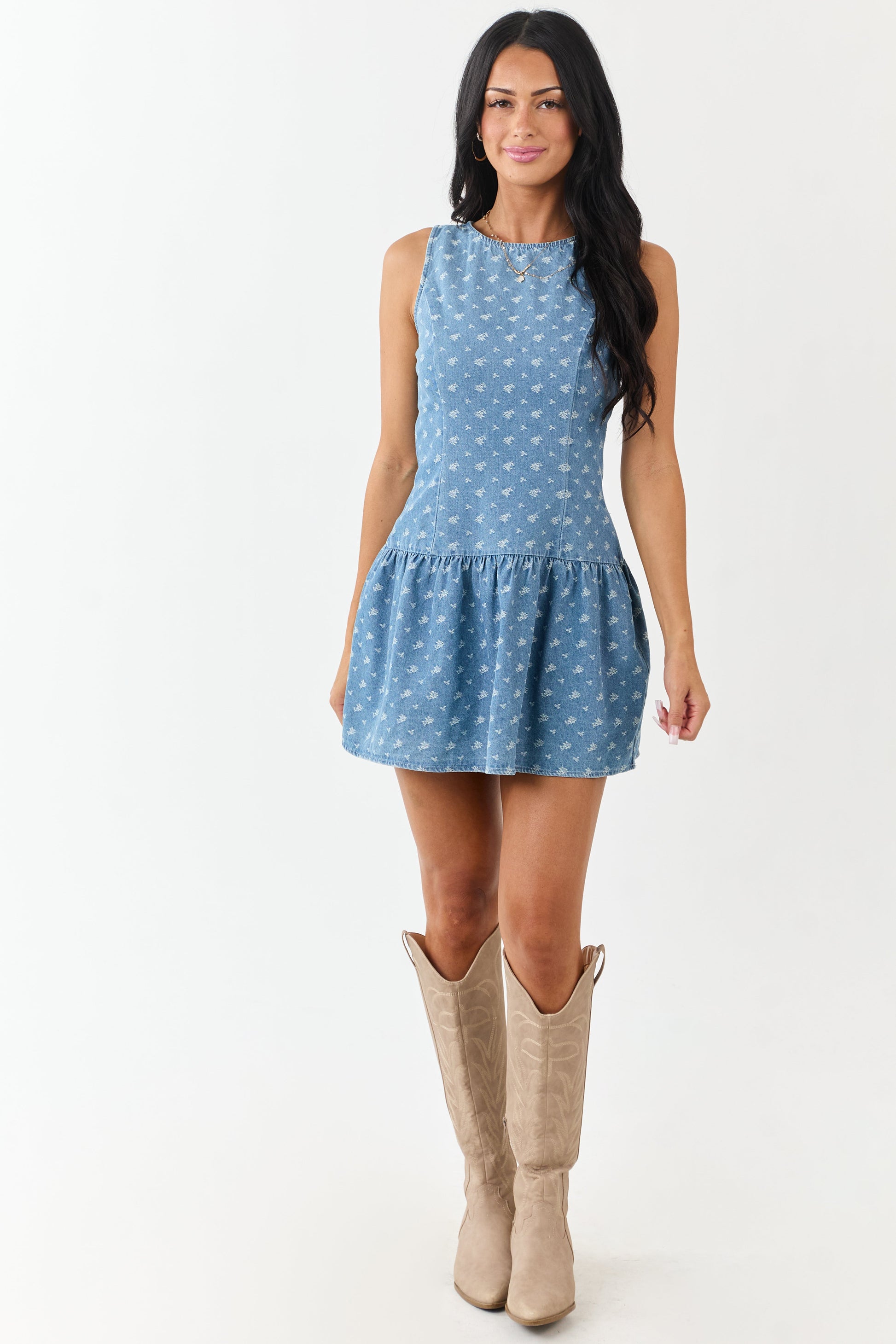 • This denim mini features a ditsy floral embroidery and a sleeveless cut for a flirty, throw-on-and-go statement look.