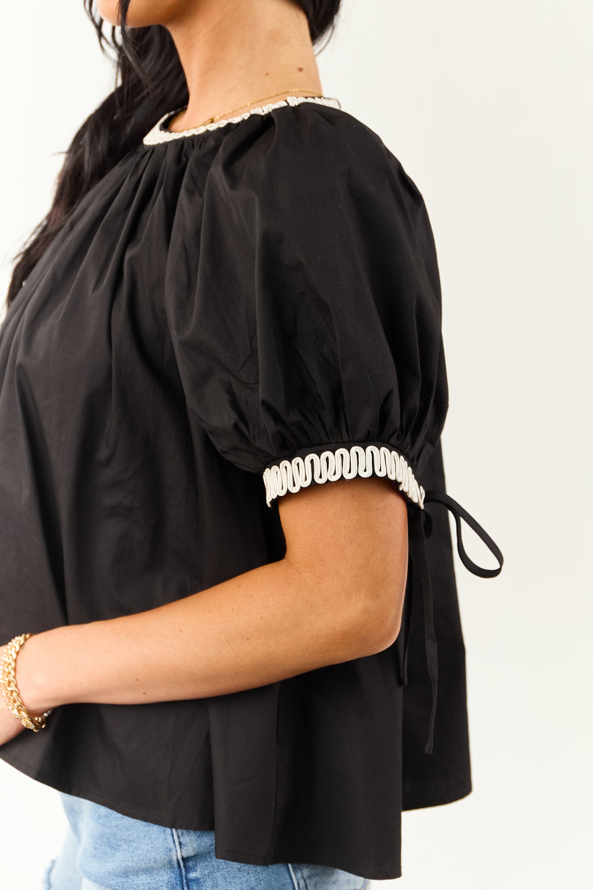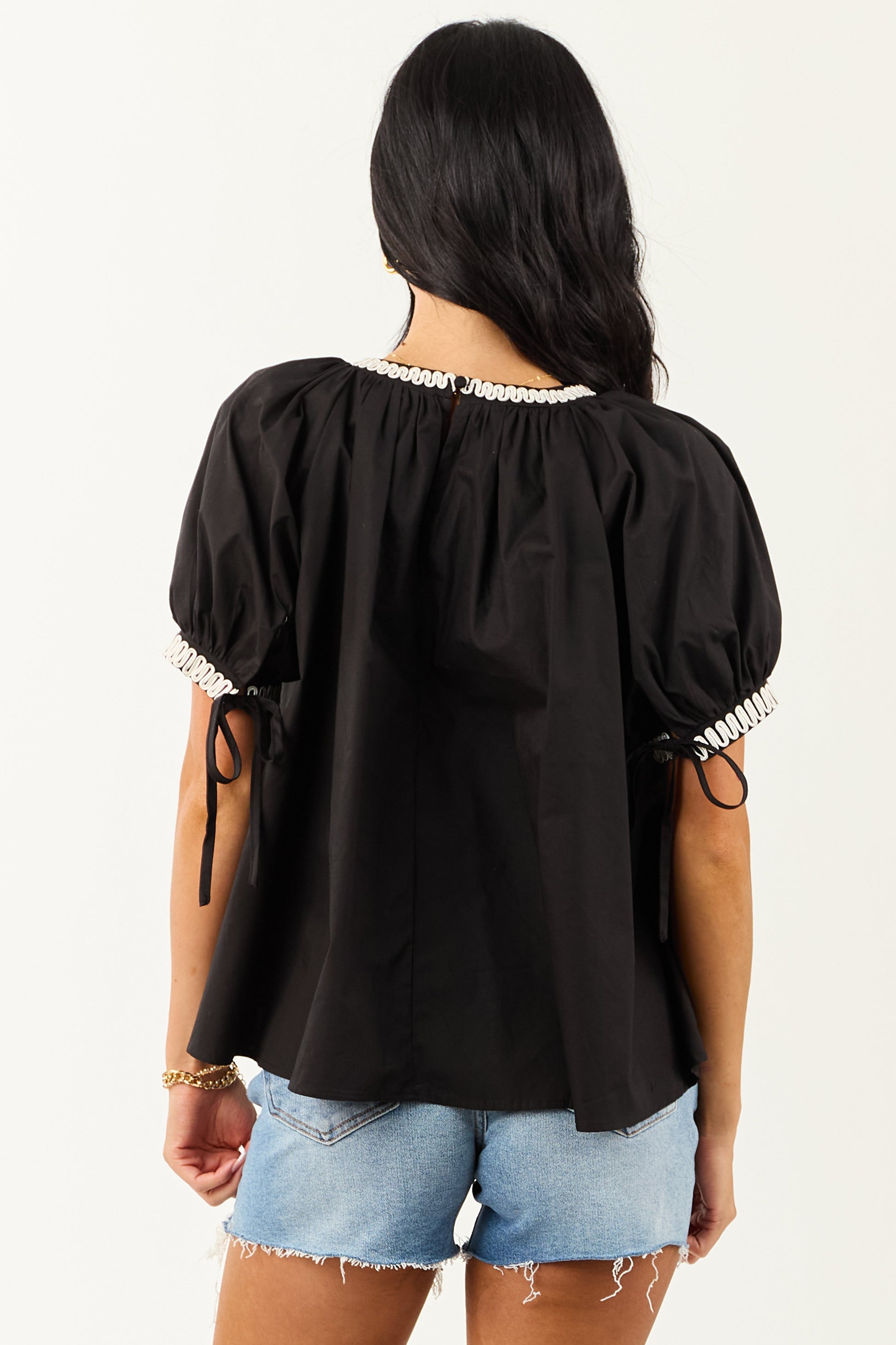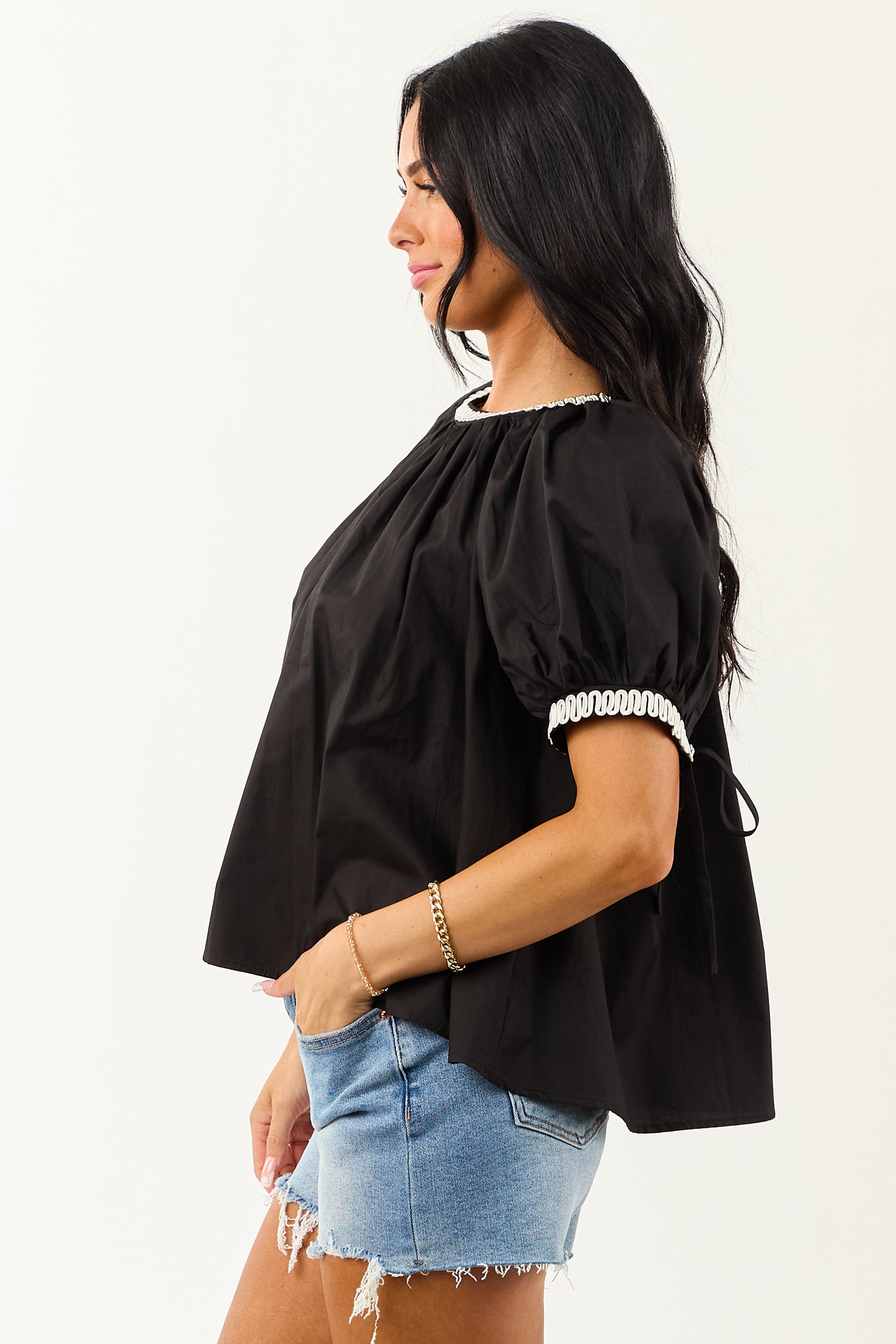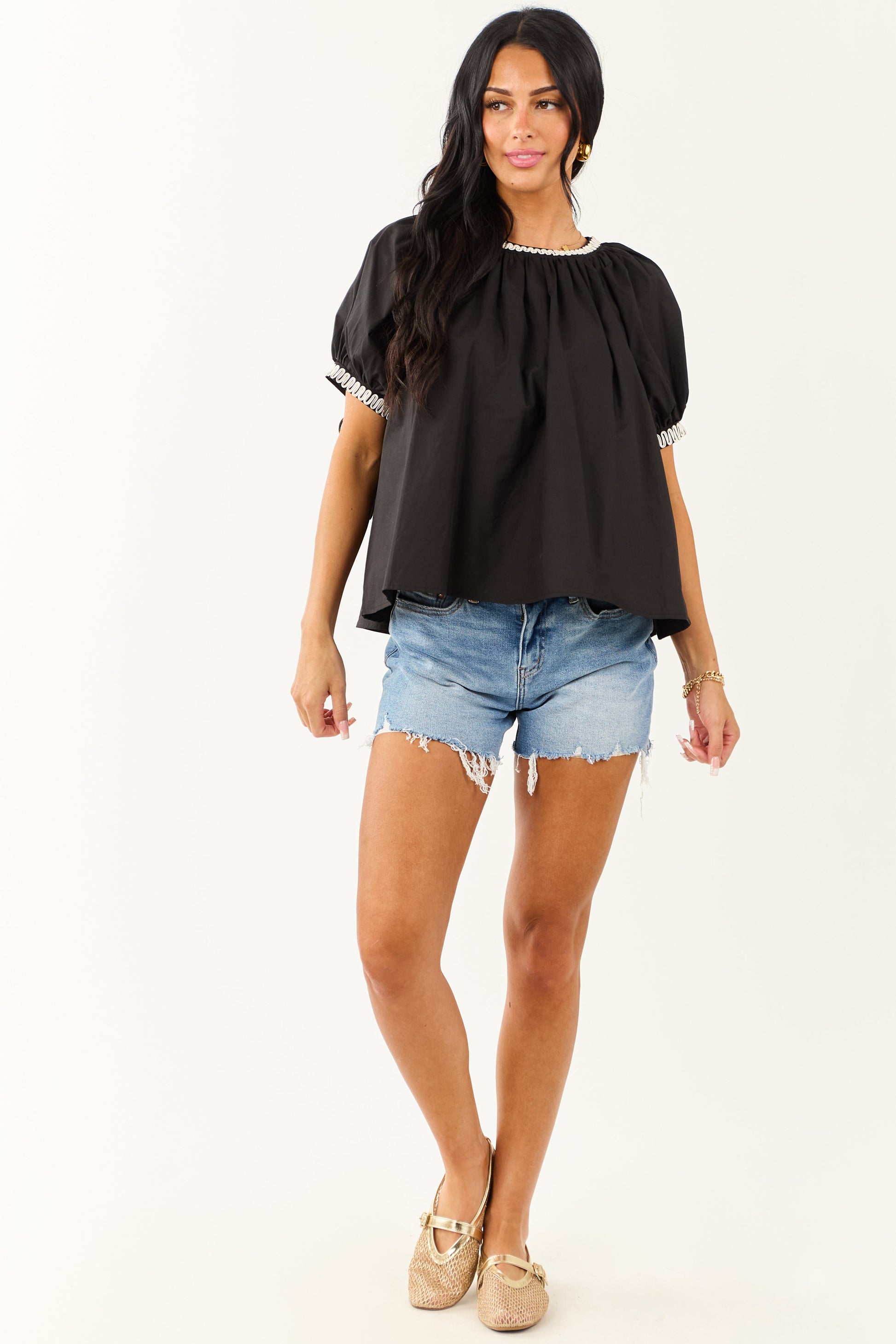 Black Contrast Embroidered Cotton Short Sleeve Top