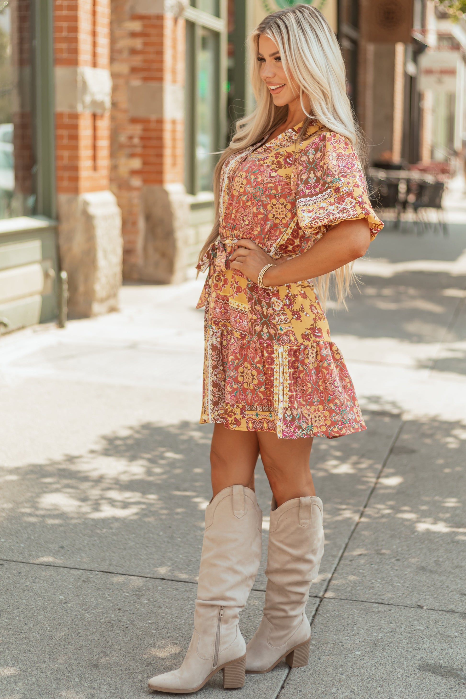 Mustard Boho Tile Print Bubble Sleeve Mini Dress