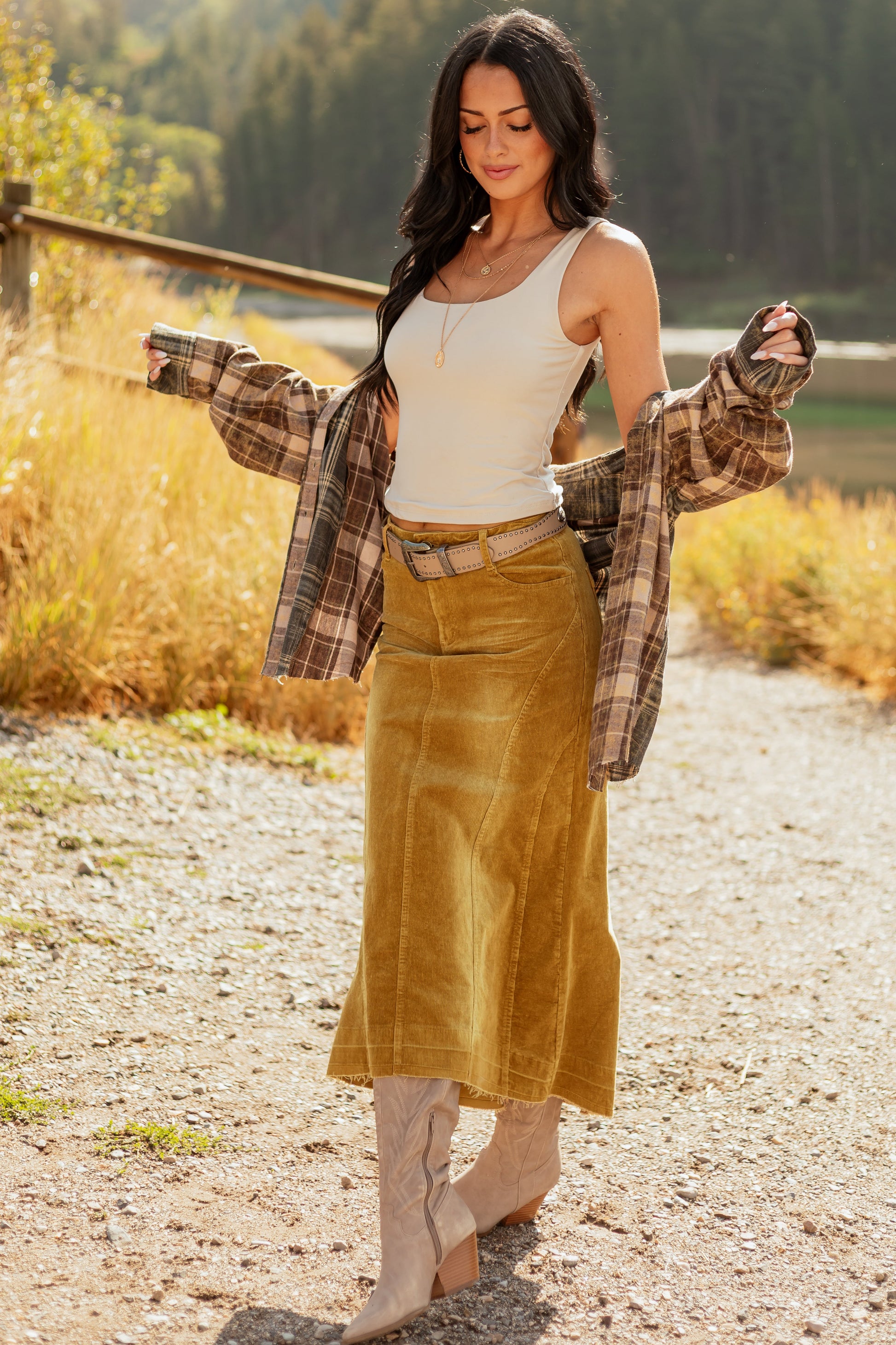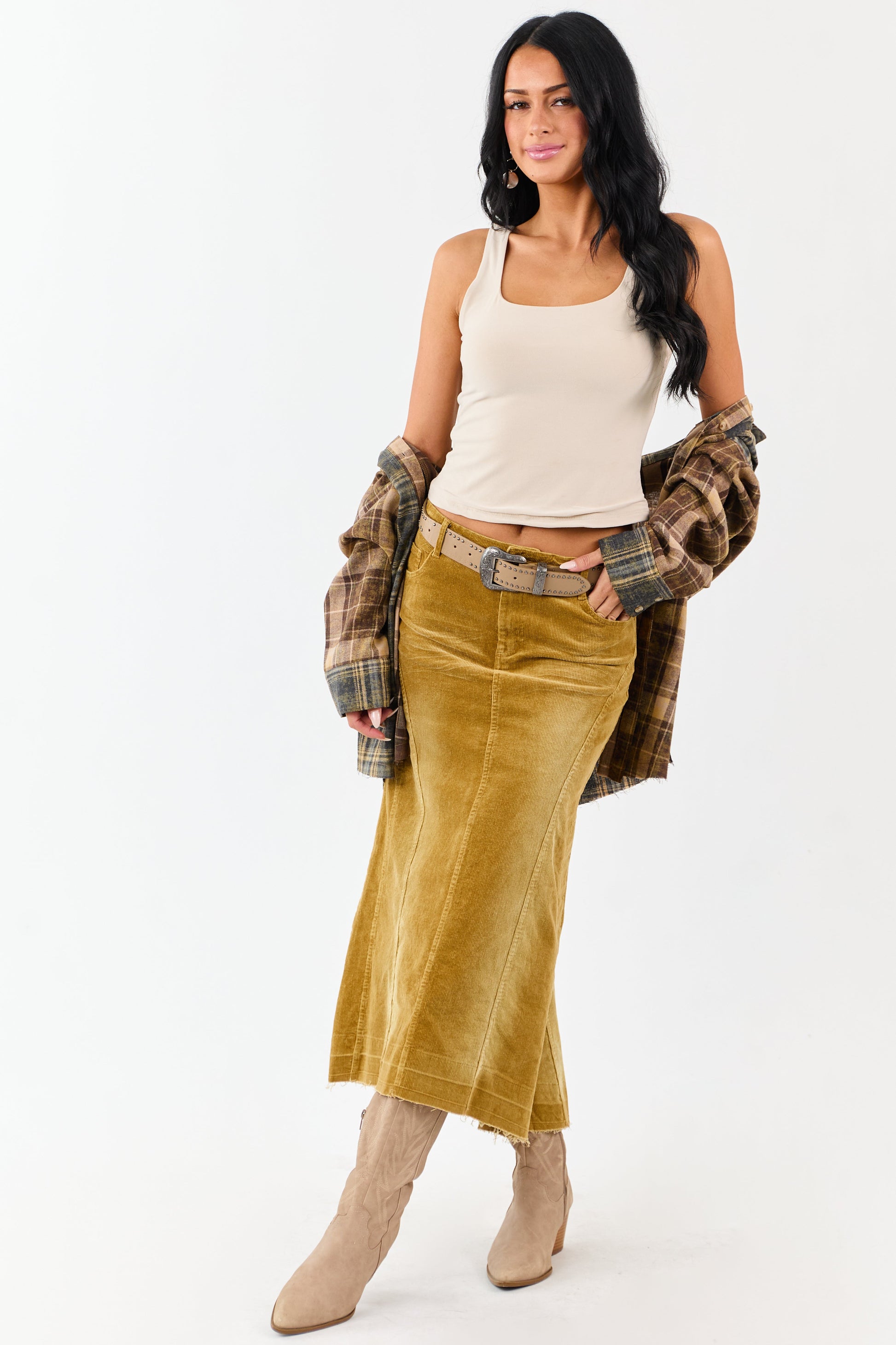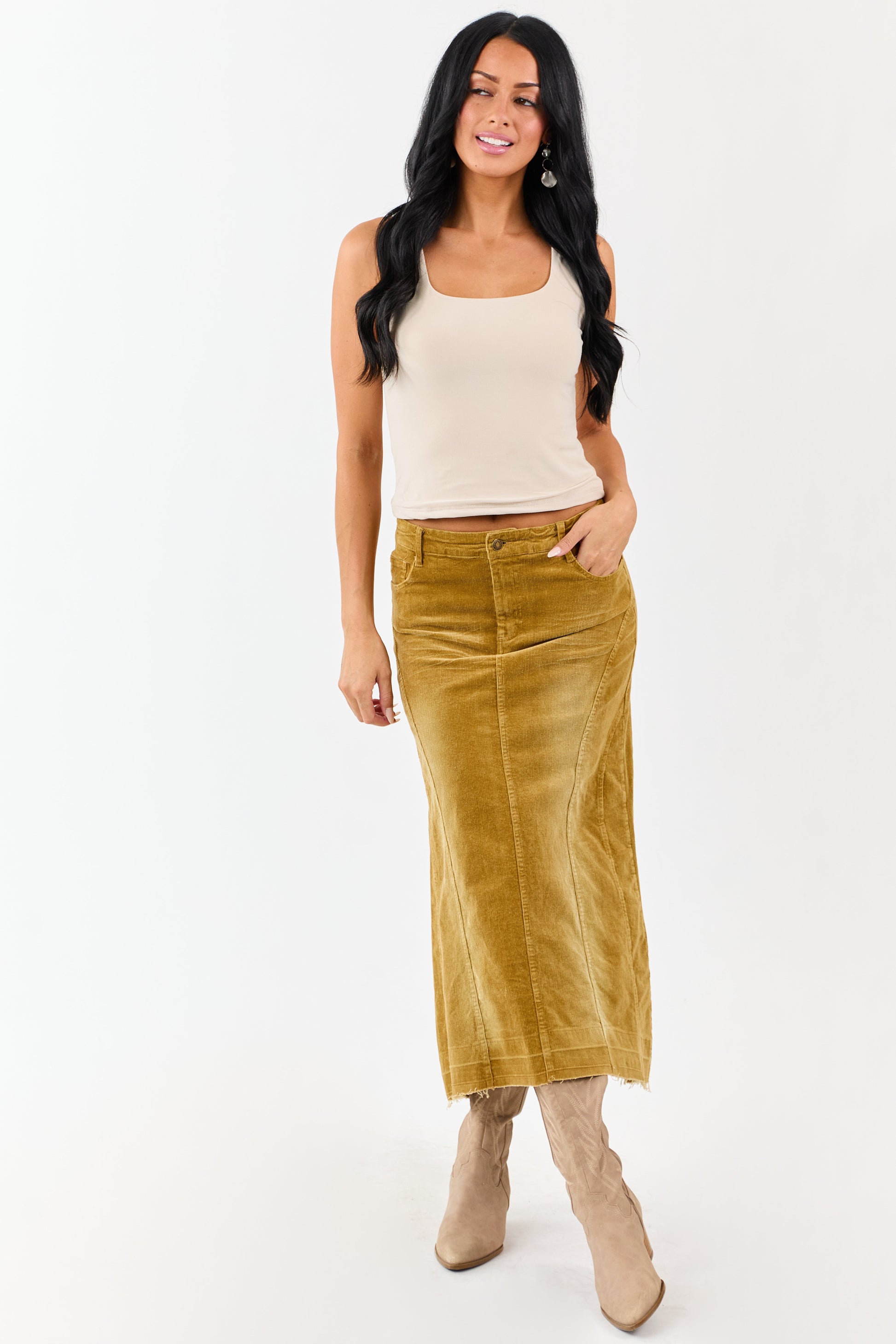 Light Copper Washed Corduroy High Low Midi Skirt