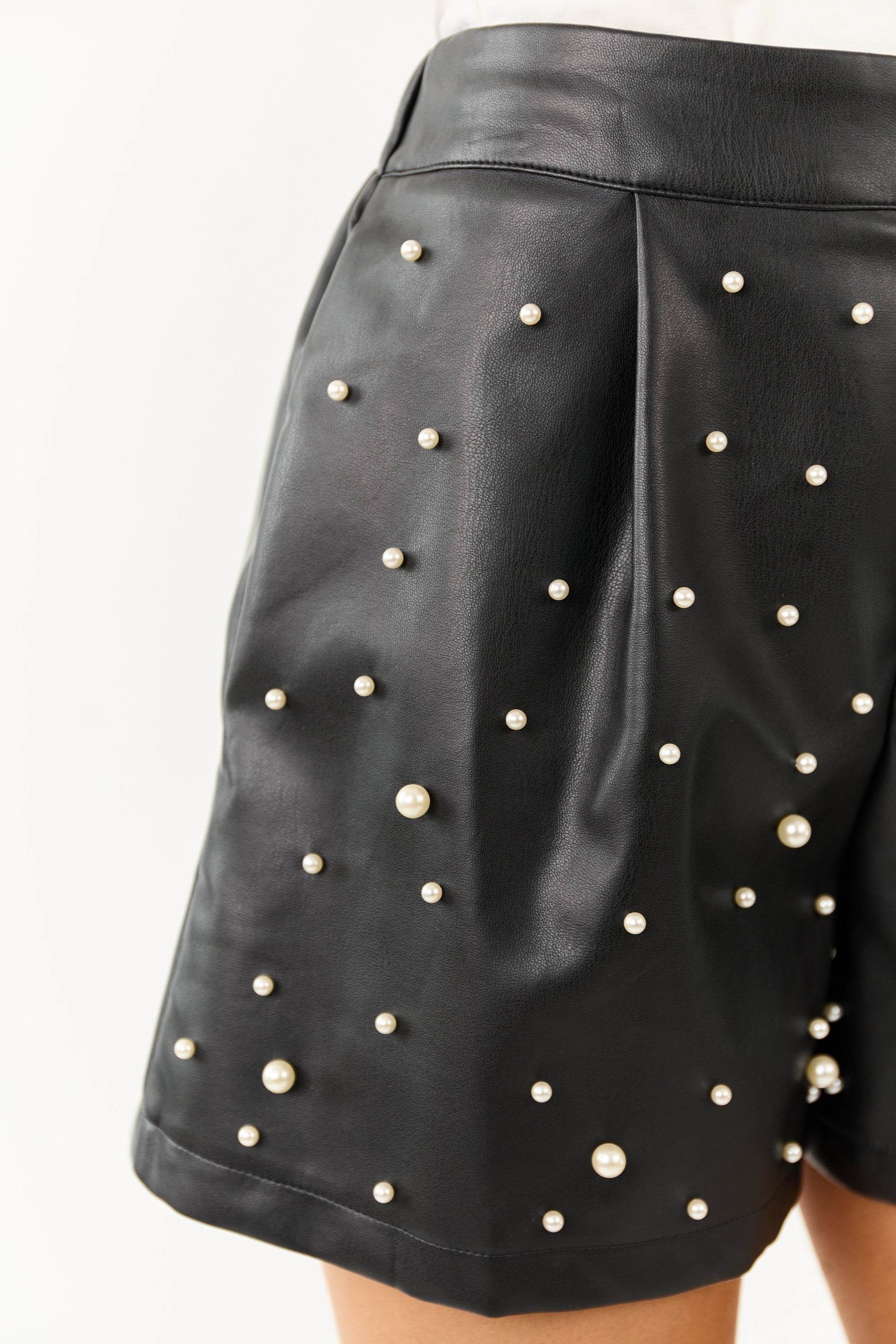 • Edgy meets elegance in these faux leather mini shorts, adorned with lustrous pearl embellishments and designed with a flattering fit for statement-making style.