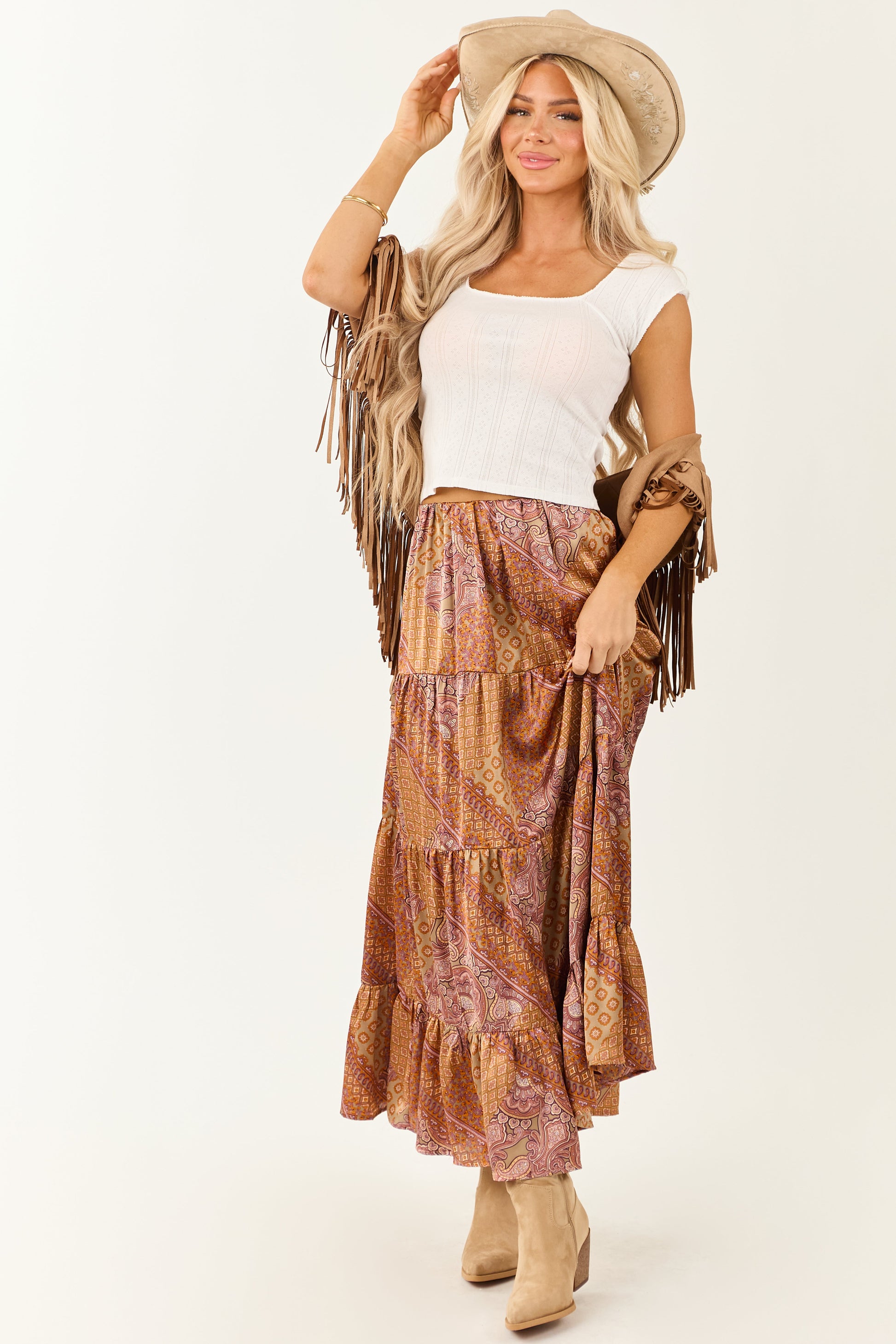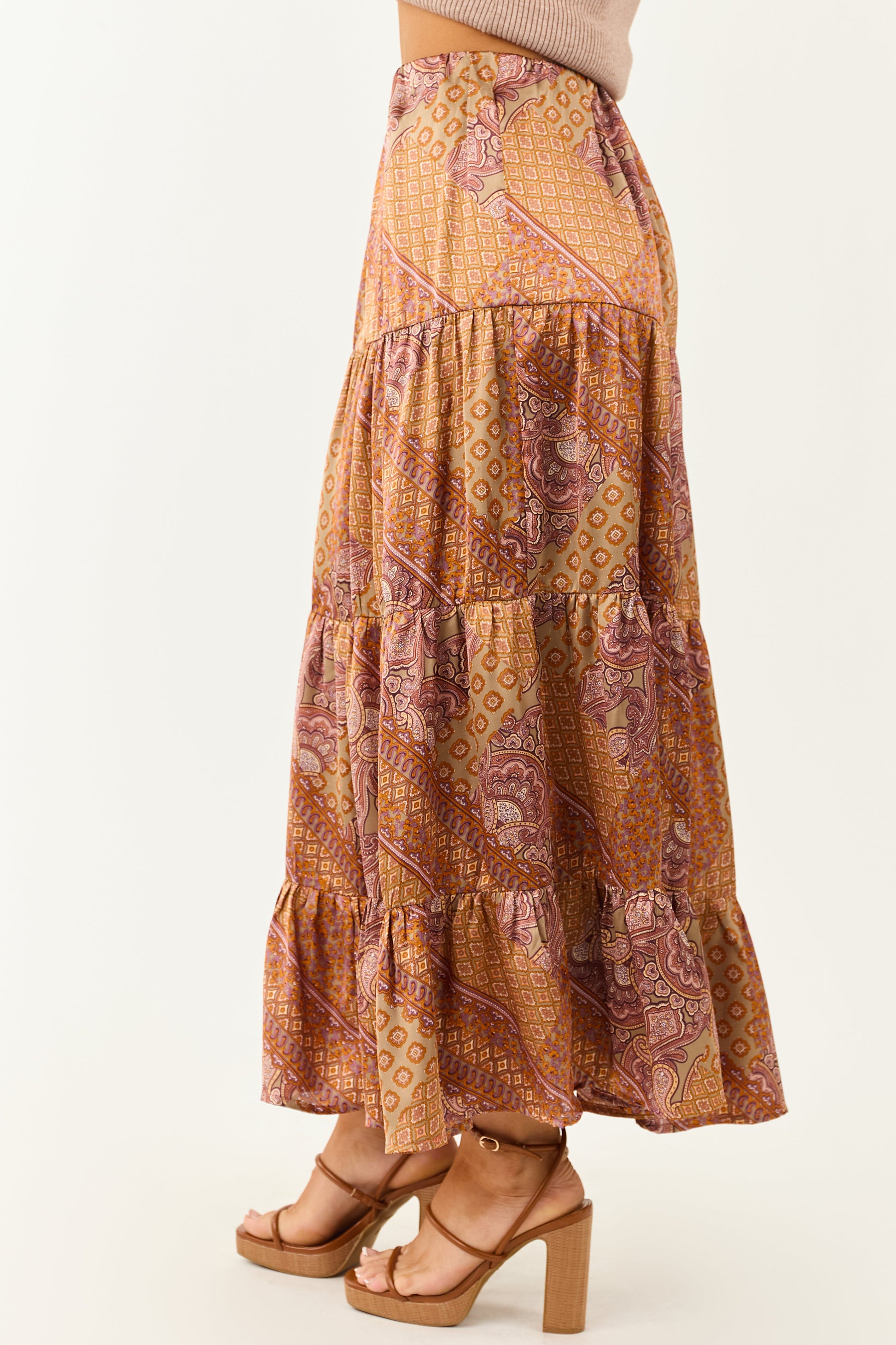 Khaki Scarf Print Satin Tiered Maxi Skirt