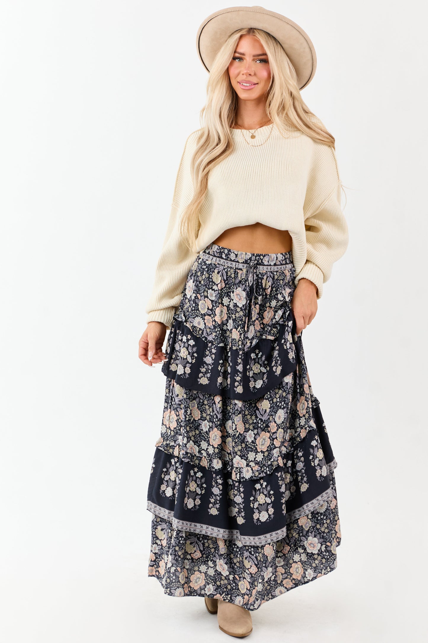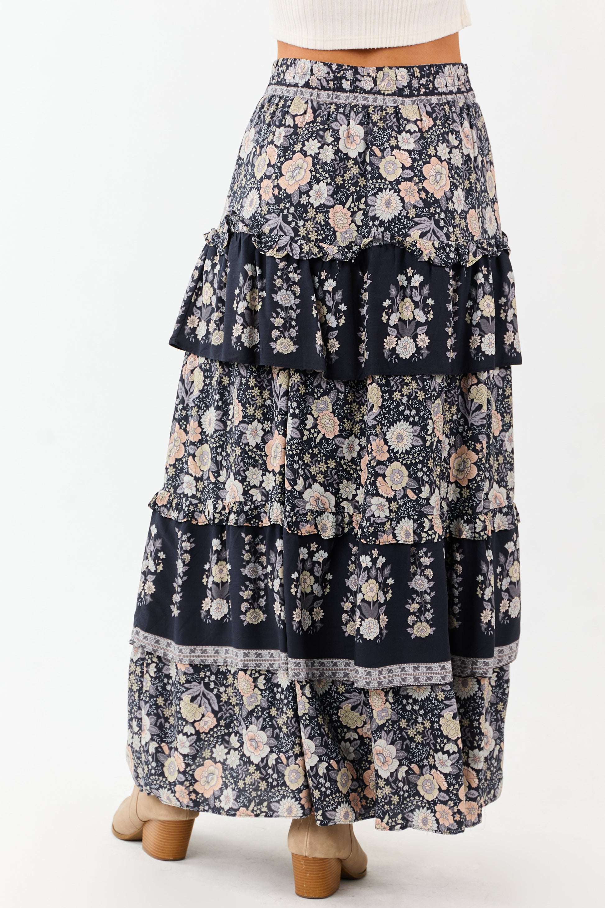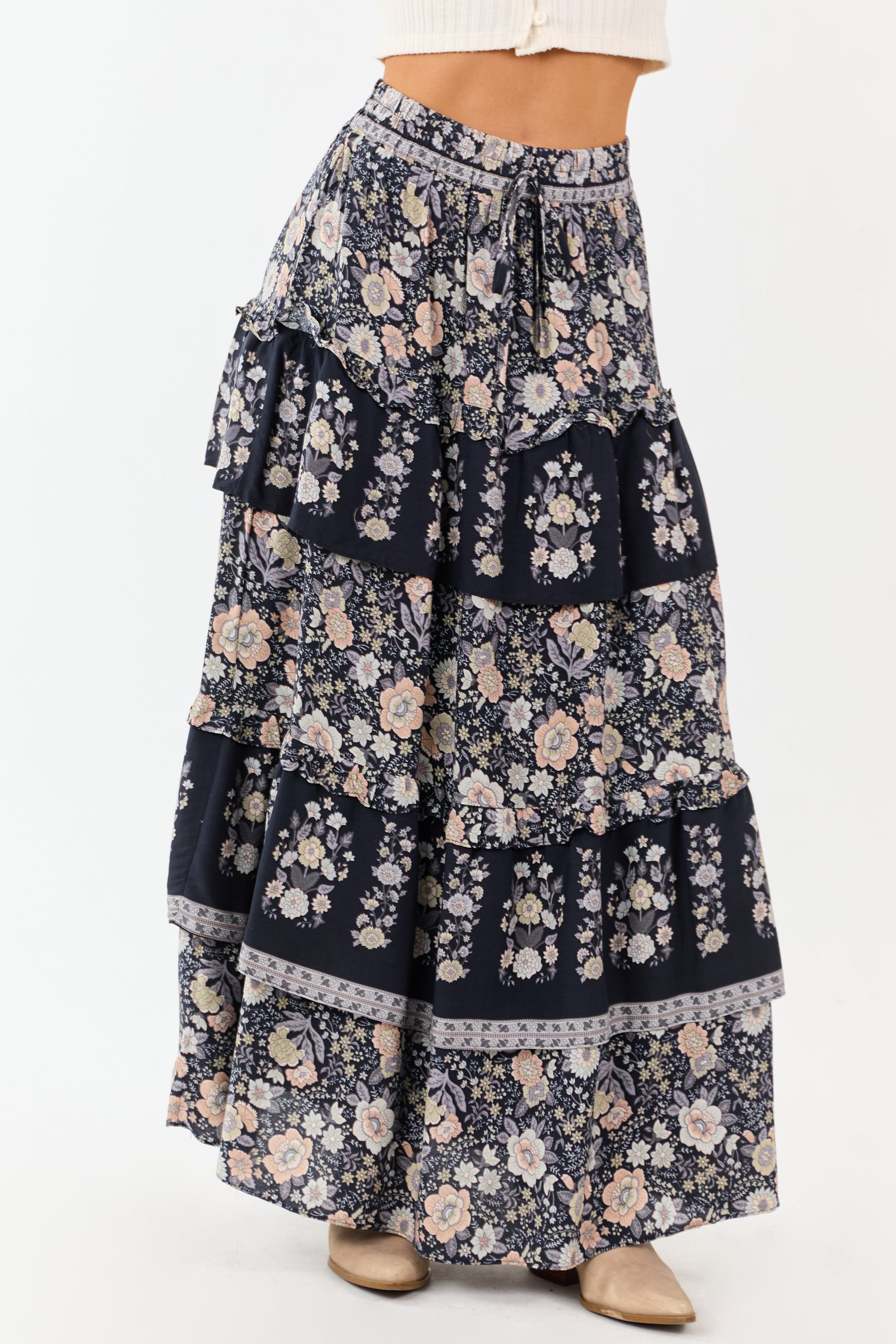 Navy Floral Print Ruffle Tiered Maxi Skirt