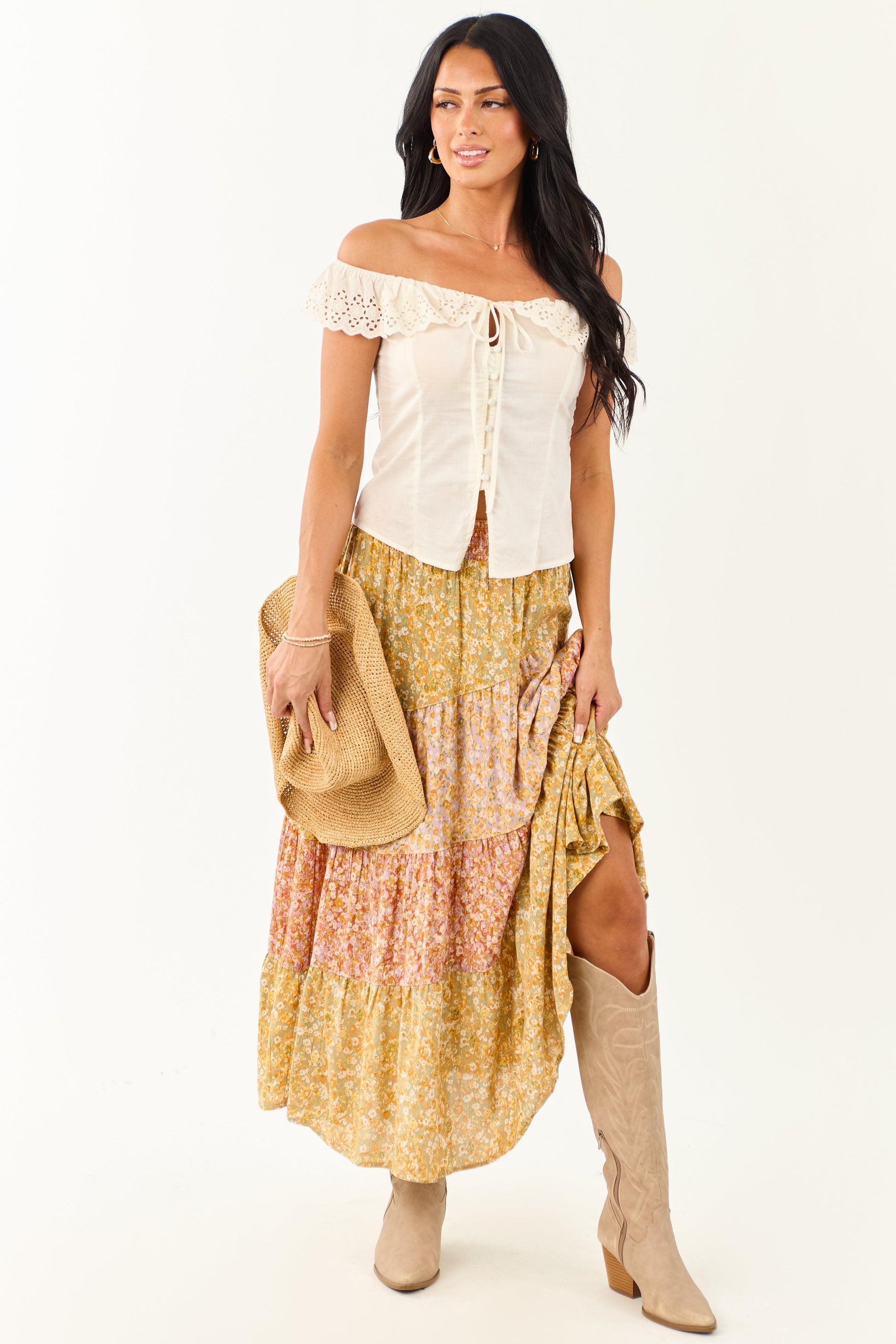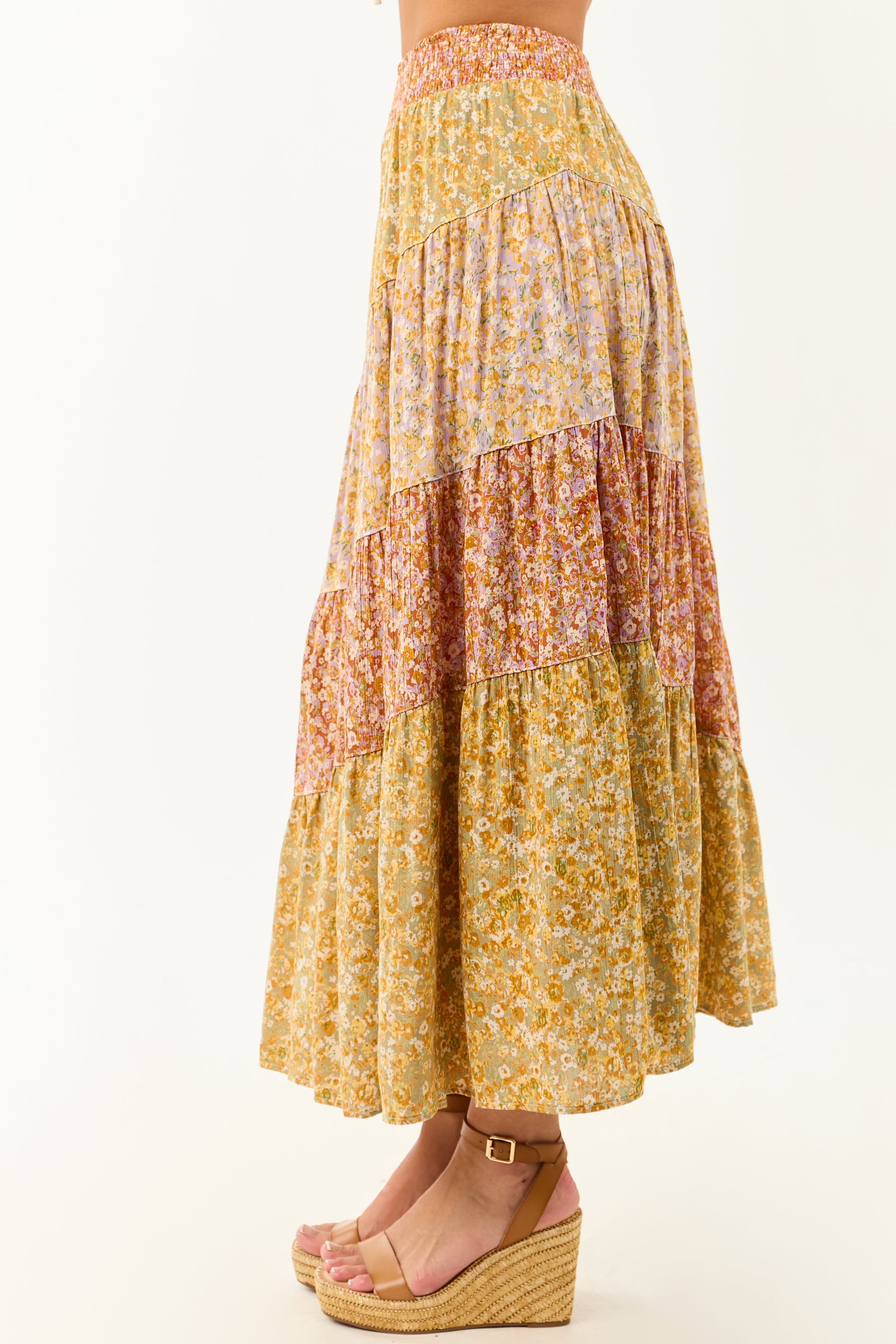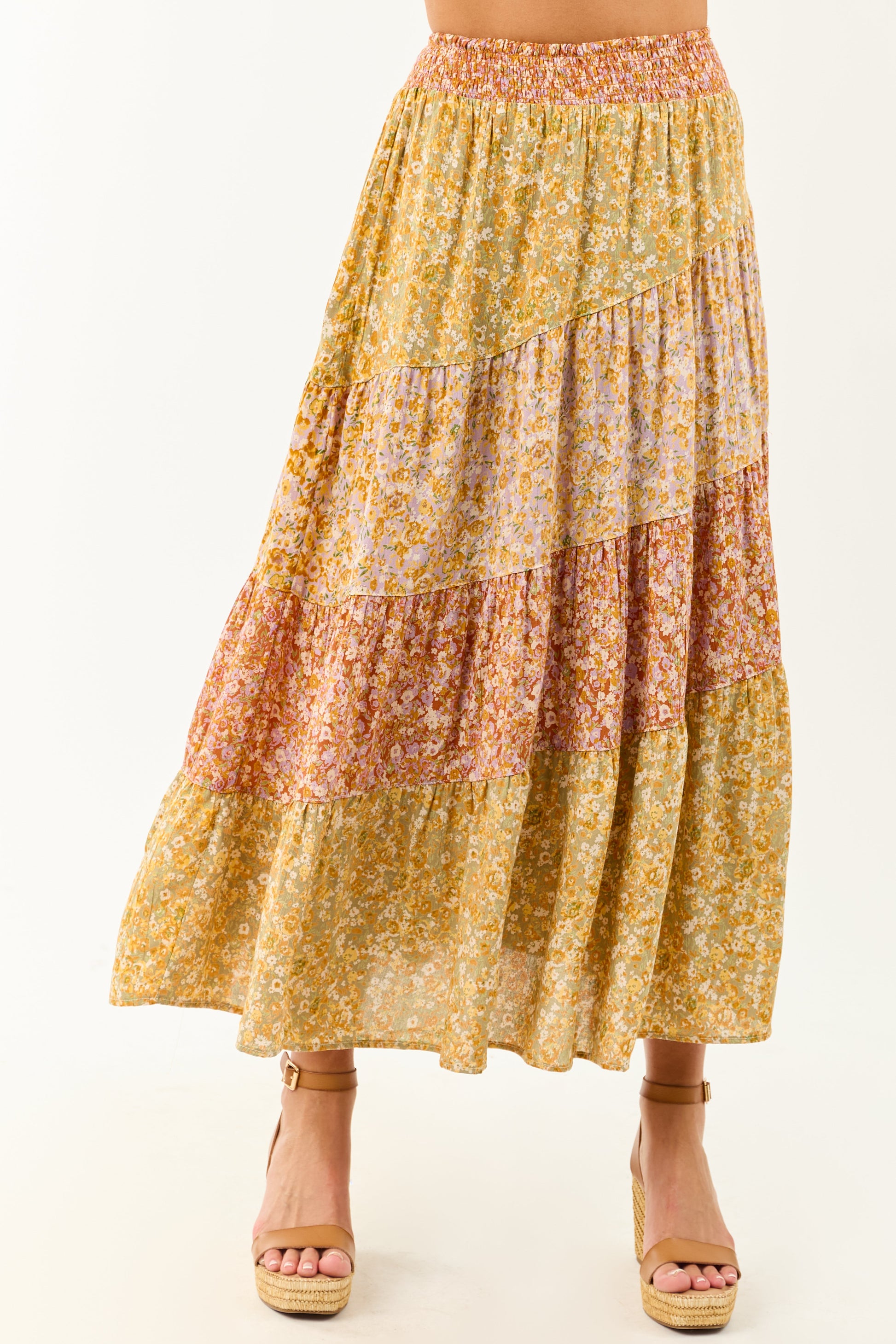 Pistachio Floral Colorblock Smocked Waist Maxi Skirt