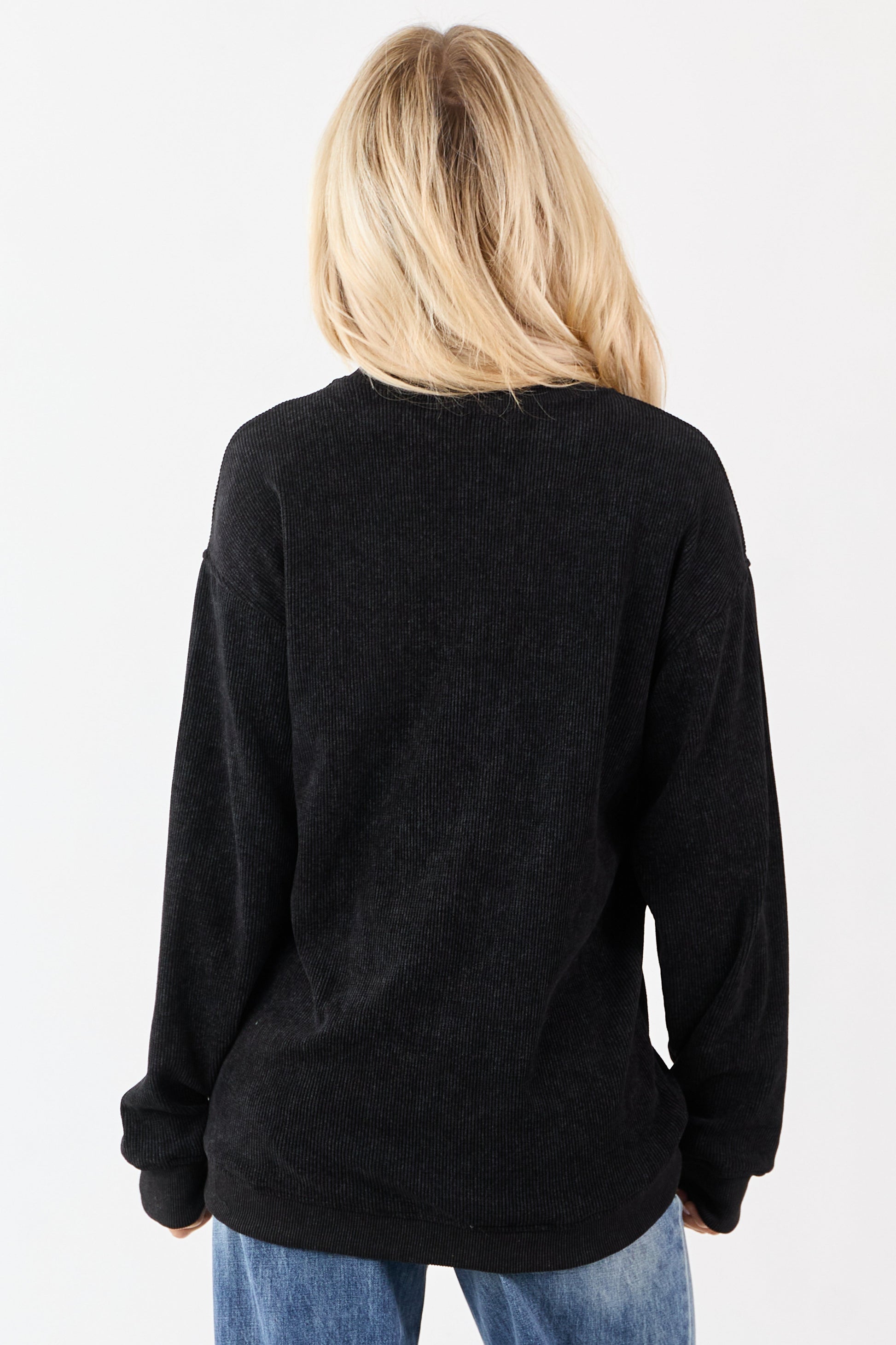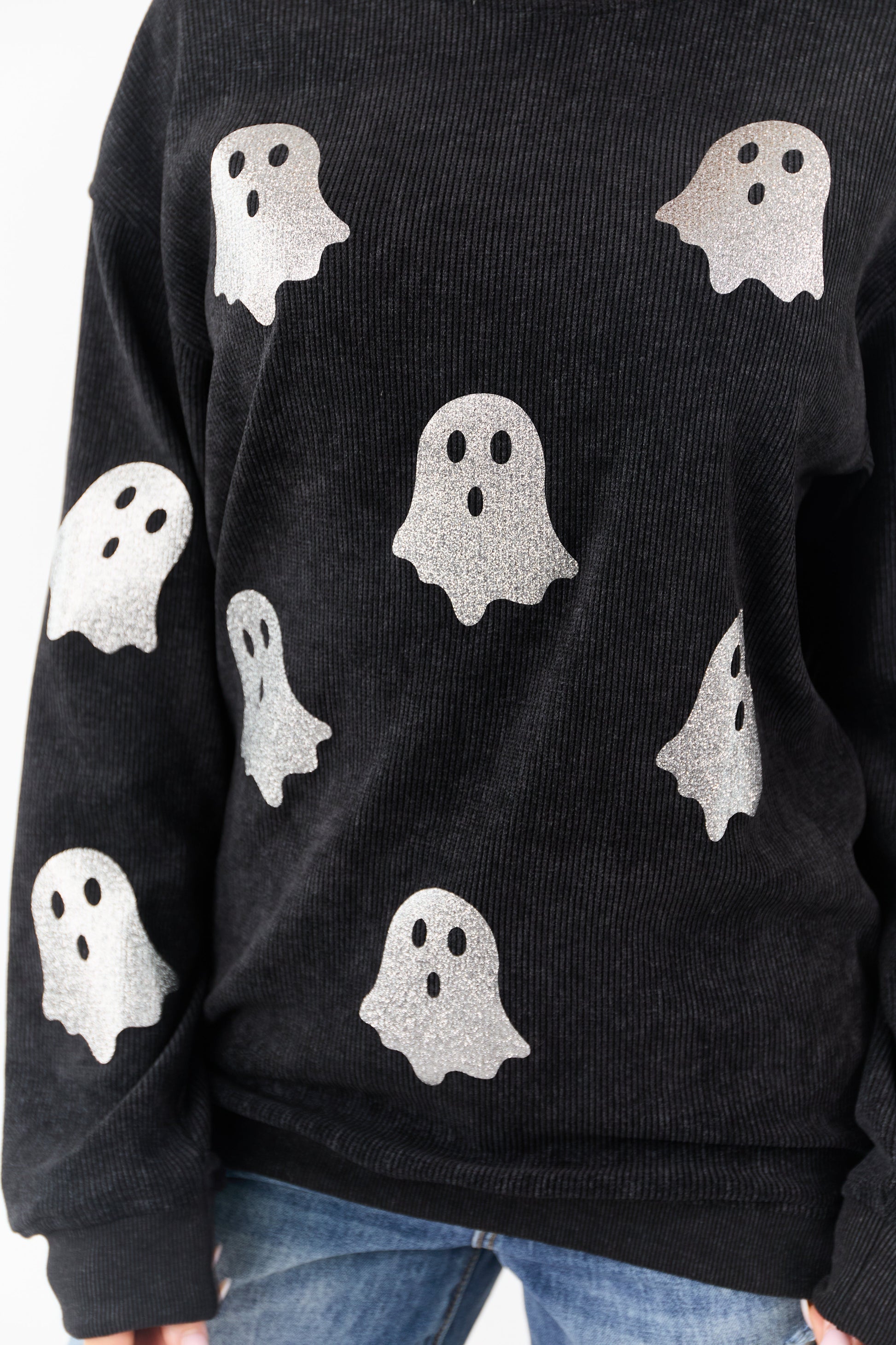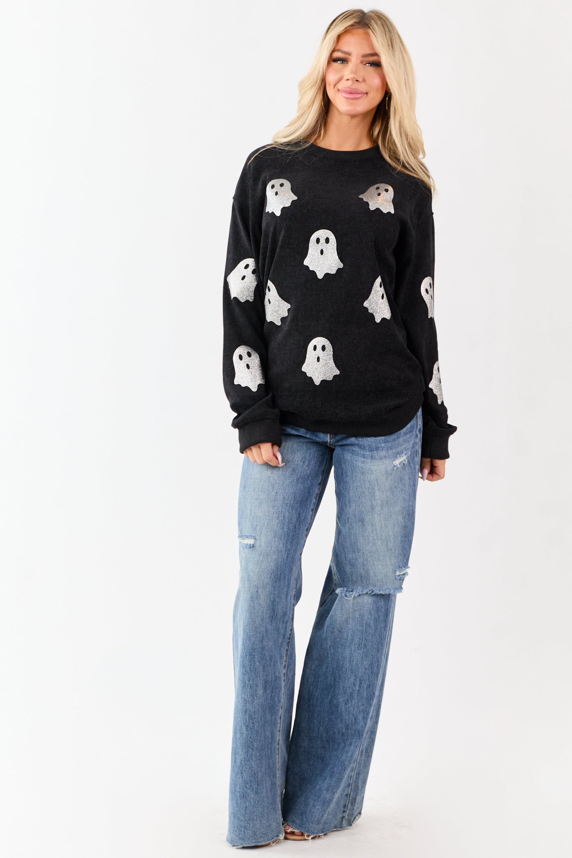 Black Sparkly Ghost Graphic Rib Knit Sweatshirt