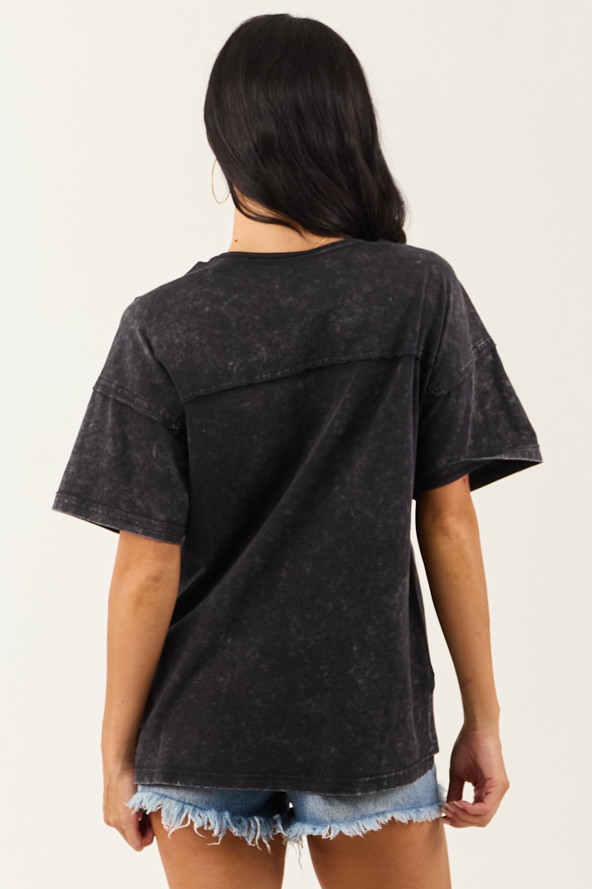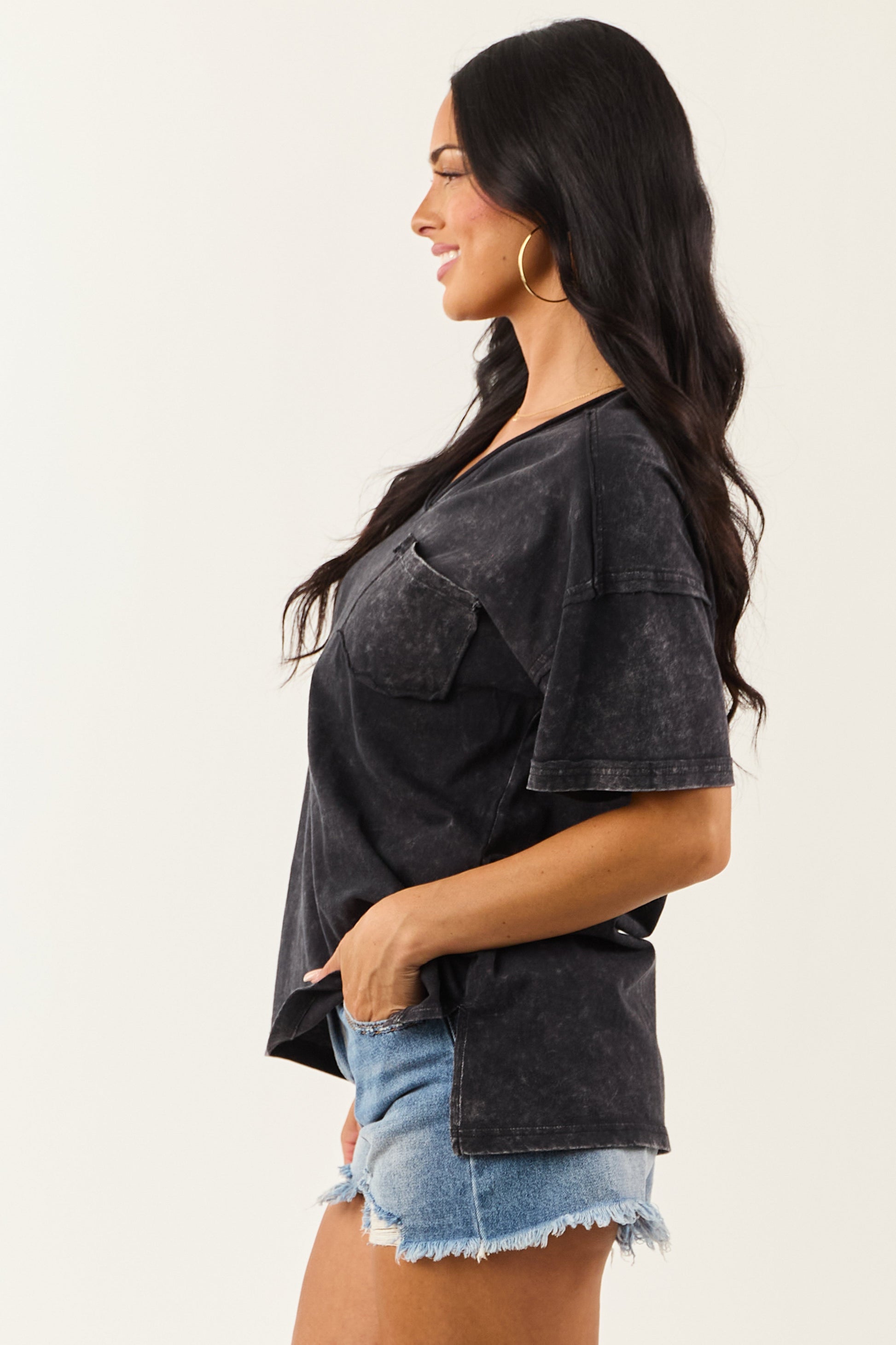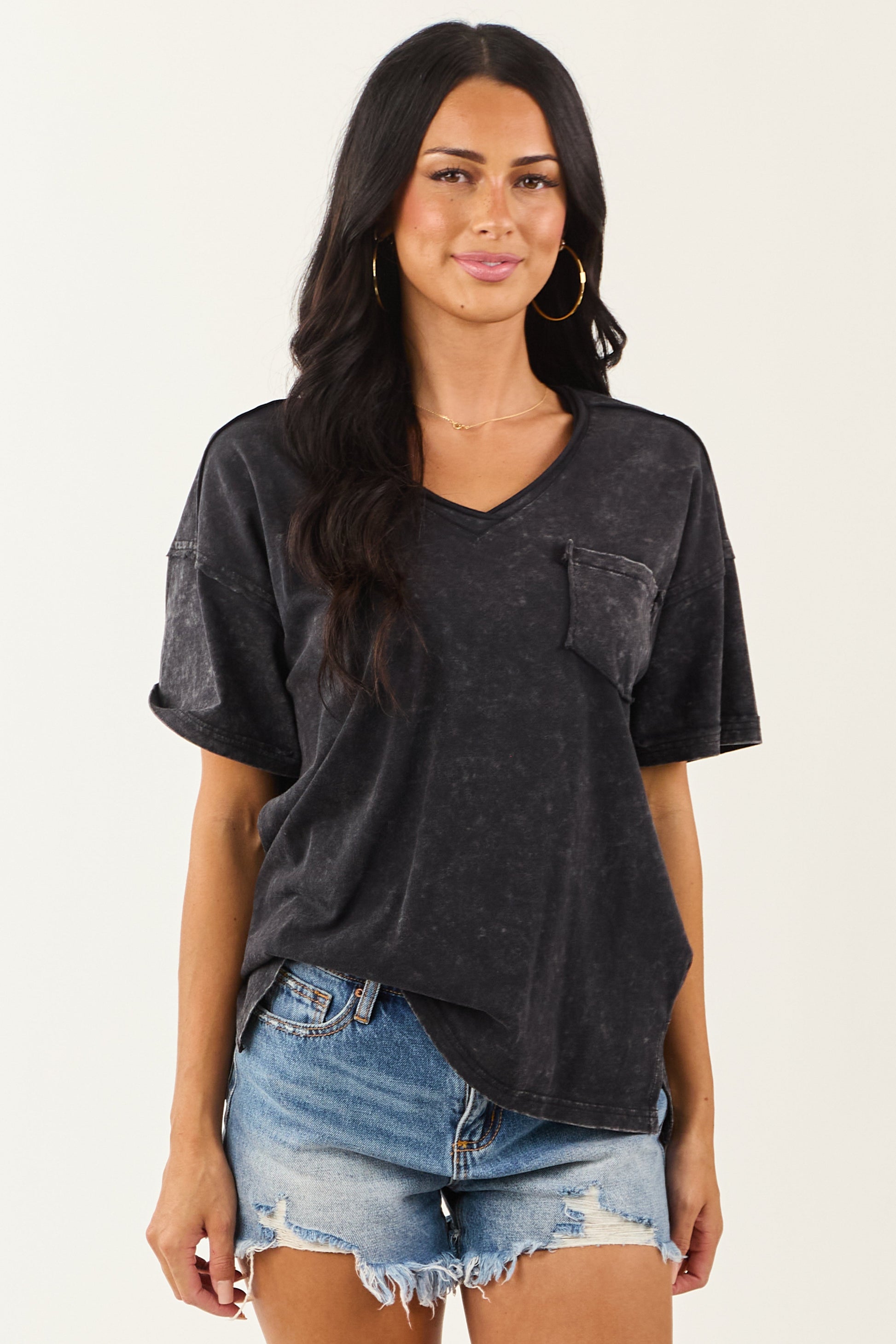 Black Mineral Washed V Neck Cotton Short Sleeve...