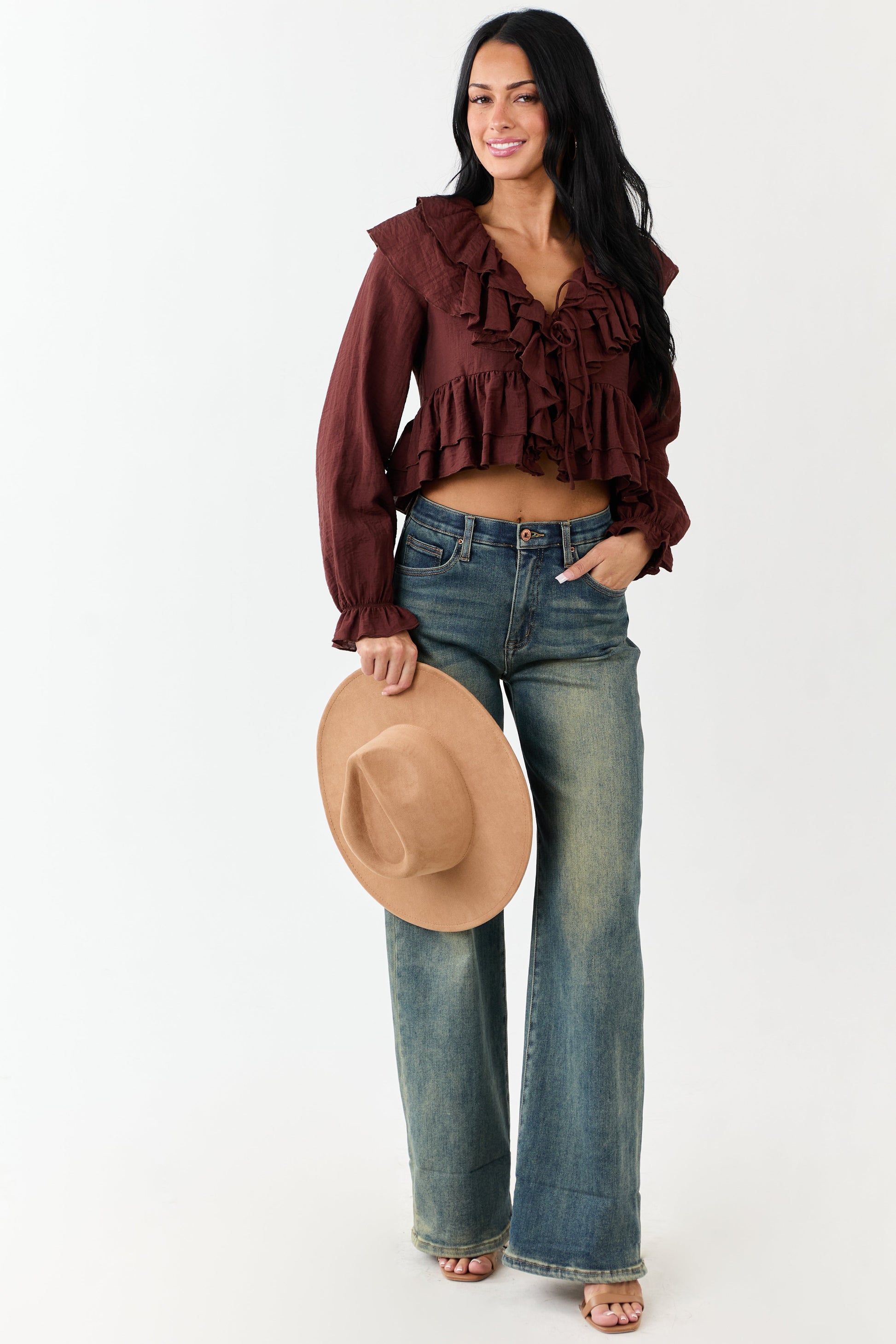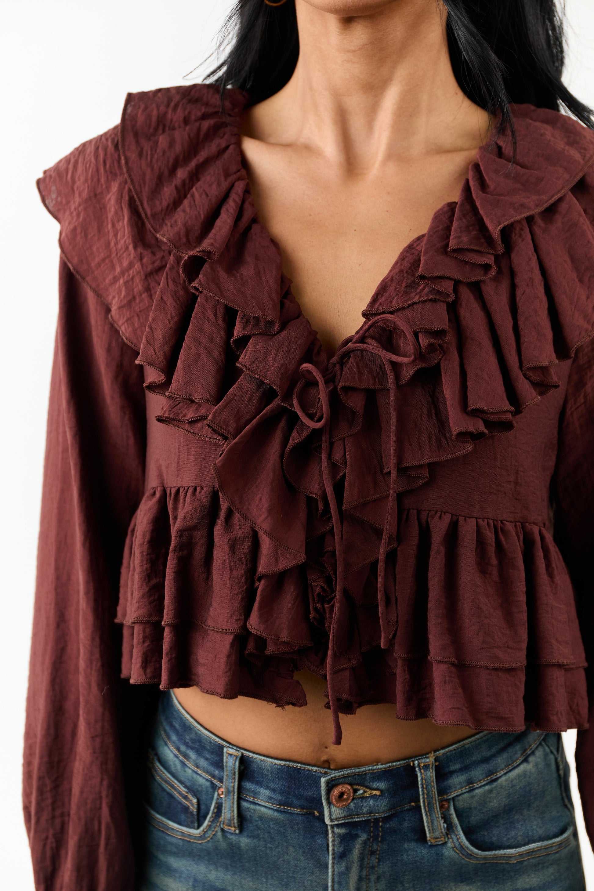 Deep Sienna Front Tie Ruffled Long Sleeve Top
