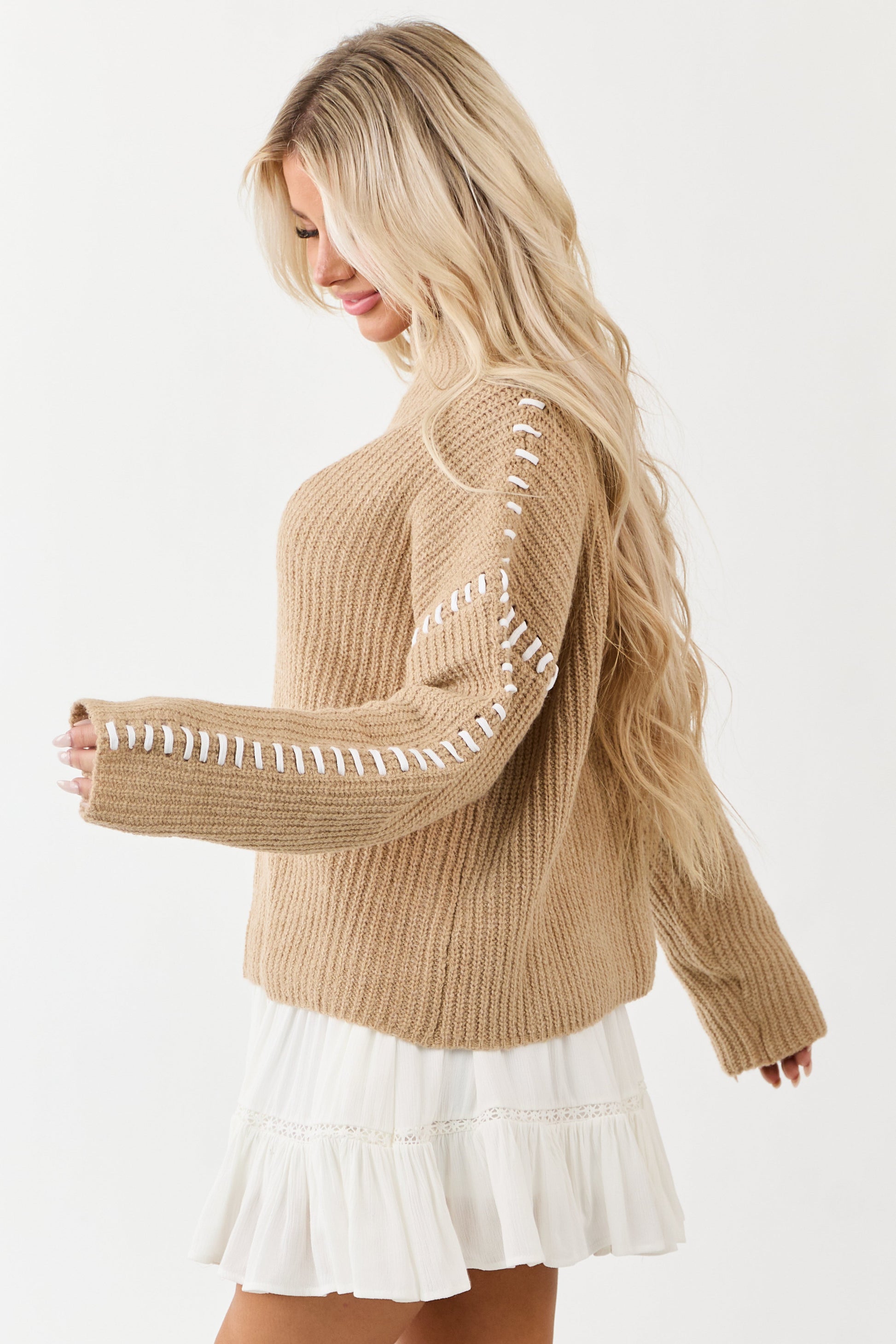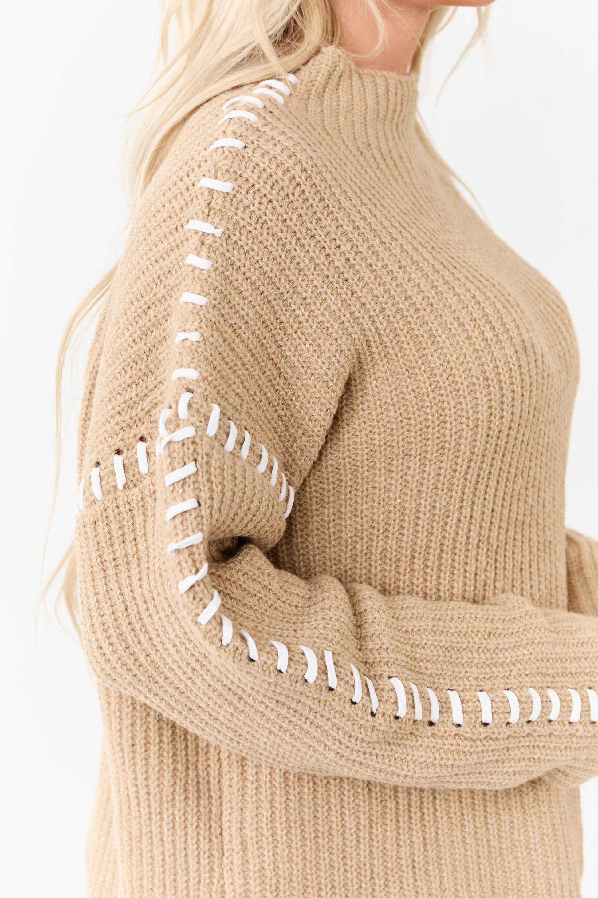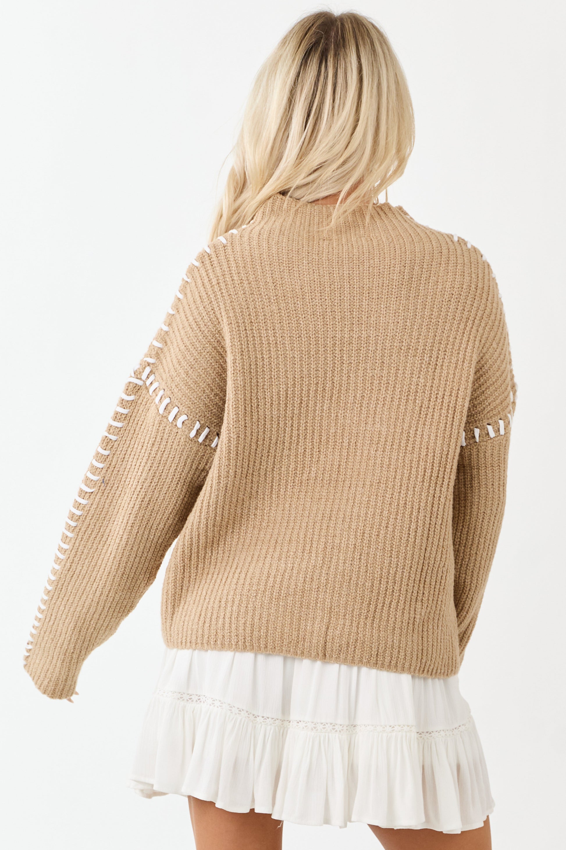 Latte Contrast Blanket Stitch Mock Neck Sweater