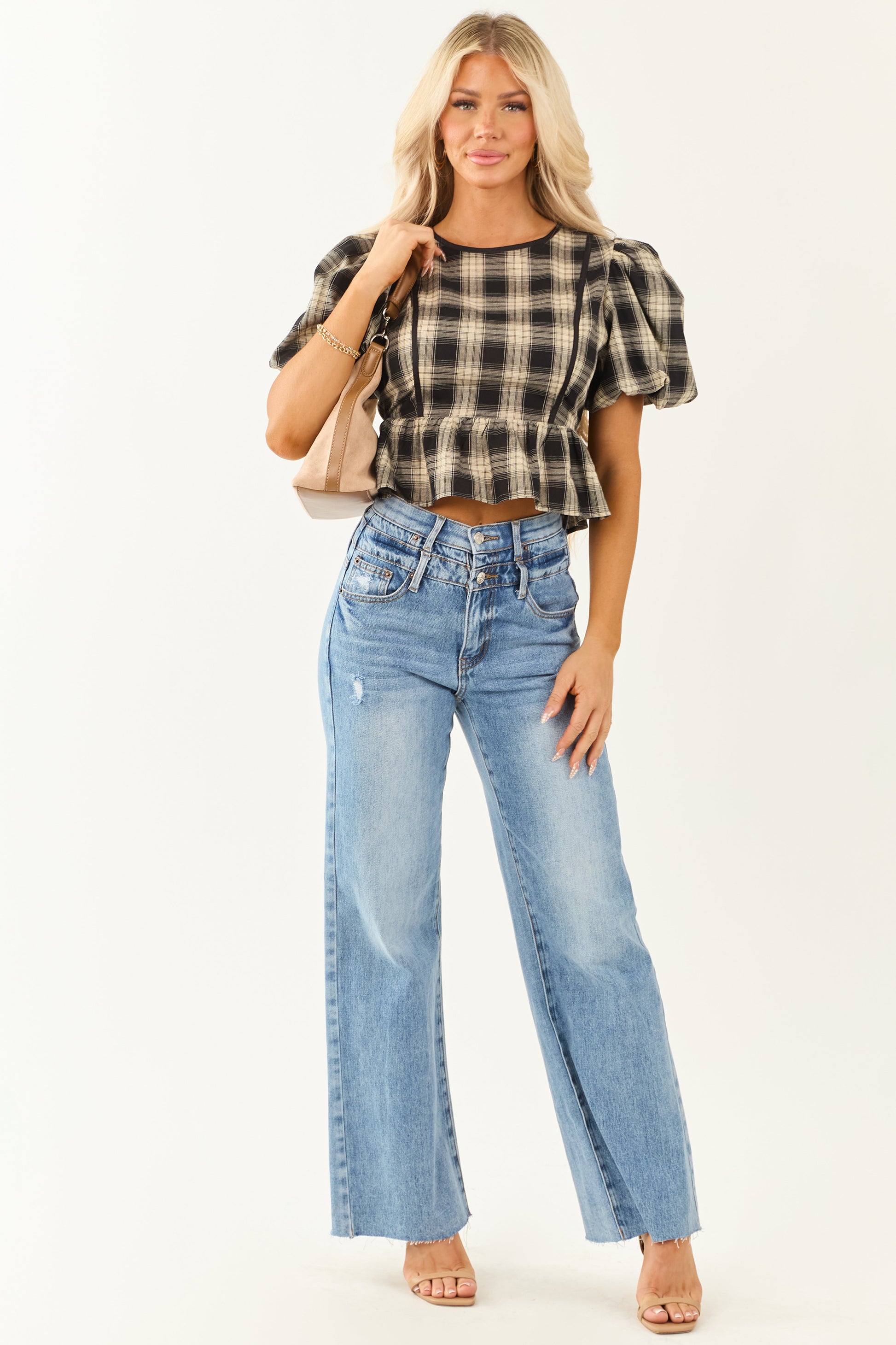 Black and Sand Plaid Puff Sleeve Peplum Top